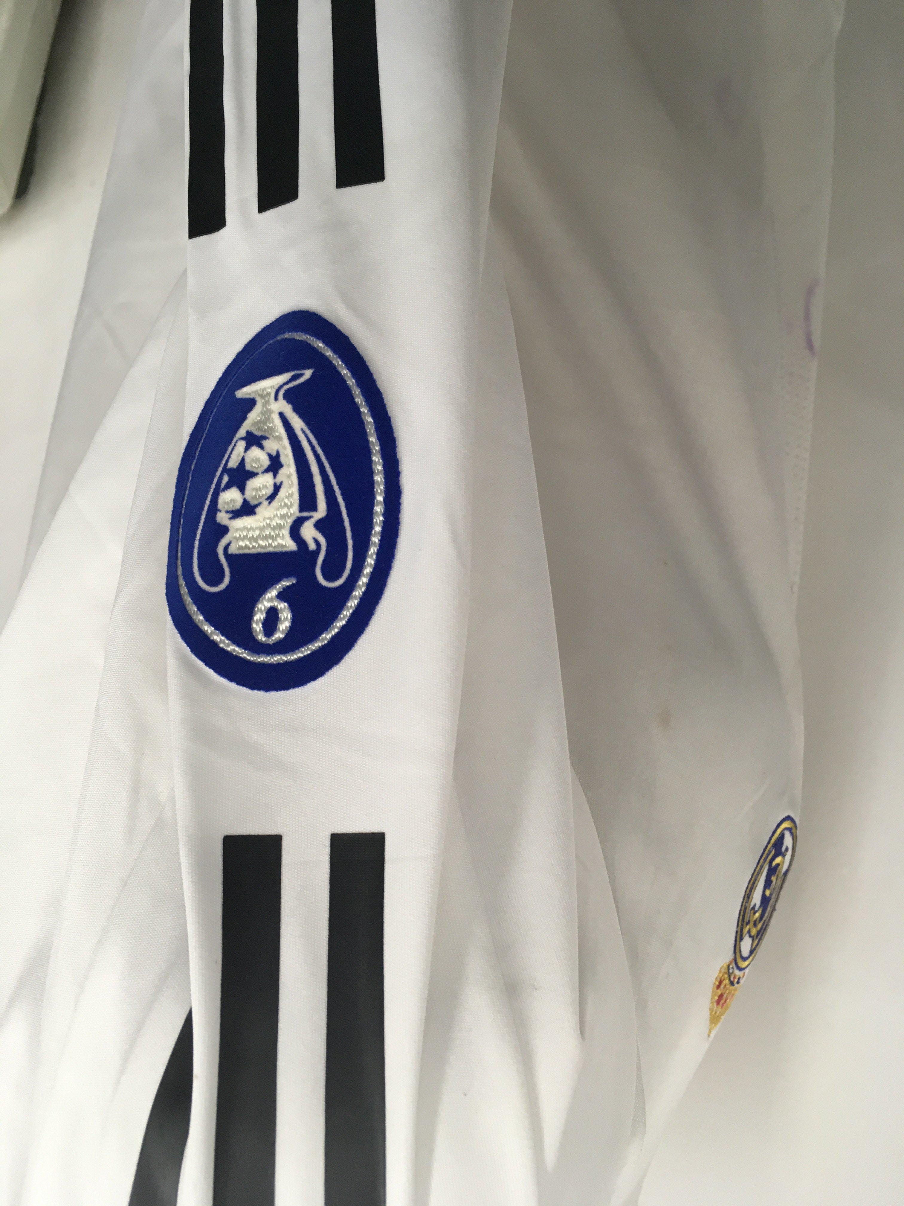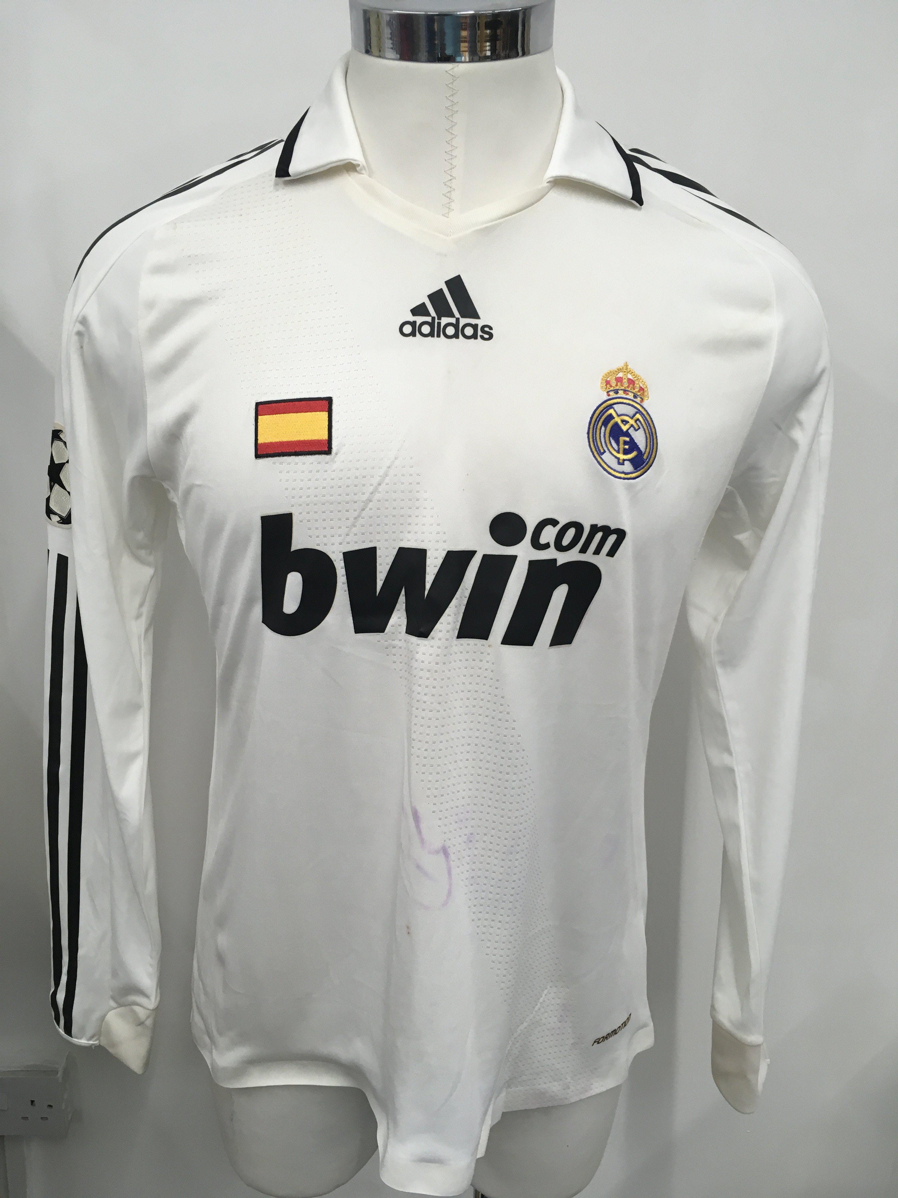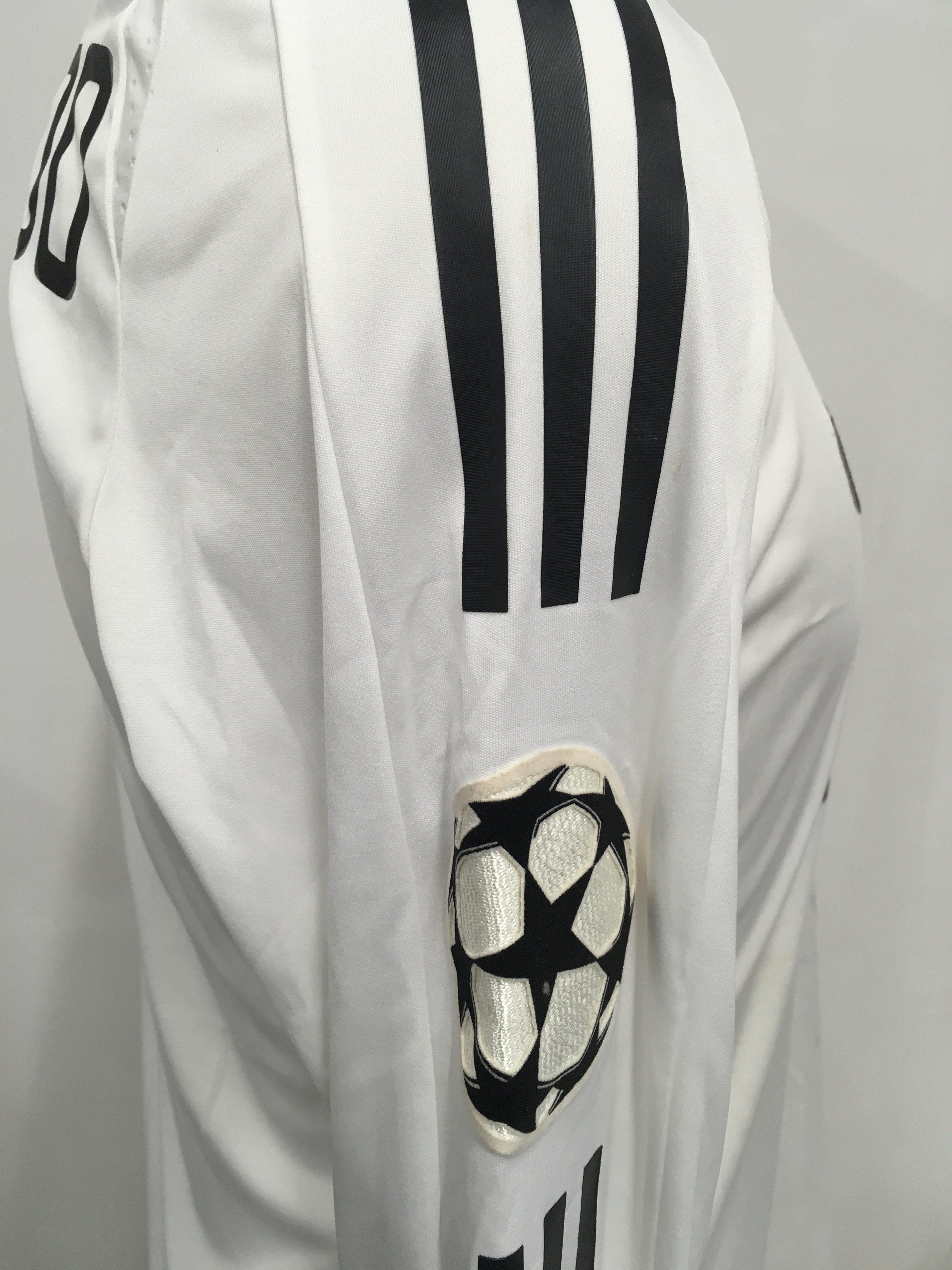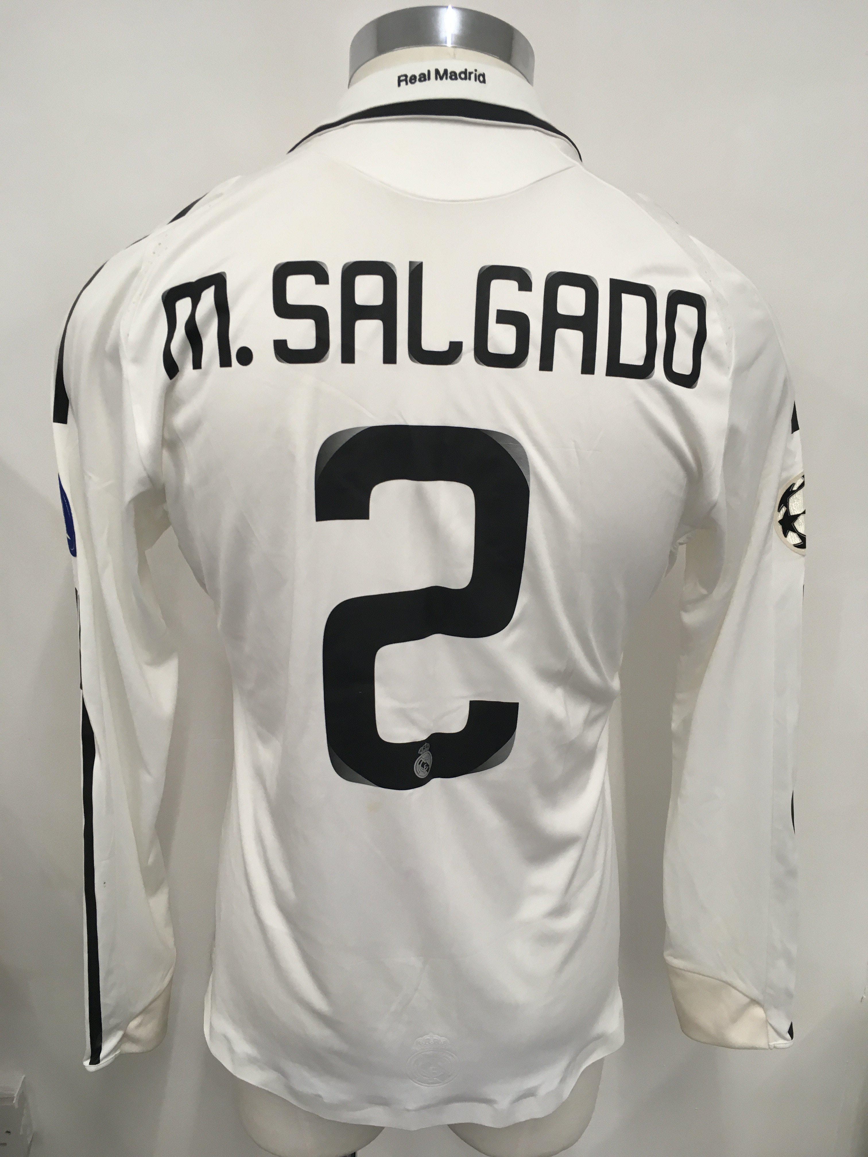 2008 - 2009 Real Madrid Salgado Match Issued Football Shirt; White long sleeve with Champions League badging to one sleeve and Champions League Cup 9 to other sleeve with refers to previous cup wins. Spain badge to breast only used in Champions League matches. Issued for match v Liverpool. Number 2 M Salgado to rear. Autograph blurred as been washed. Salgado did not make the squad for both matches.