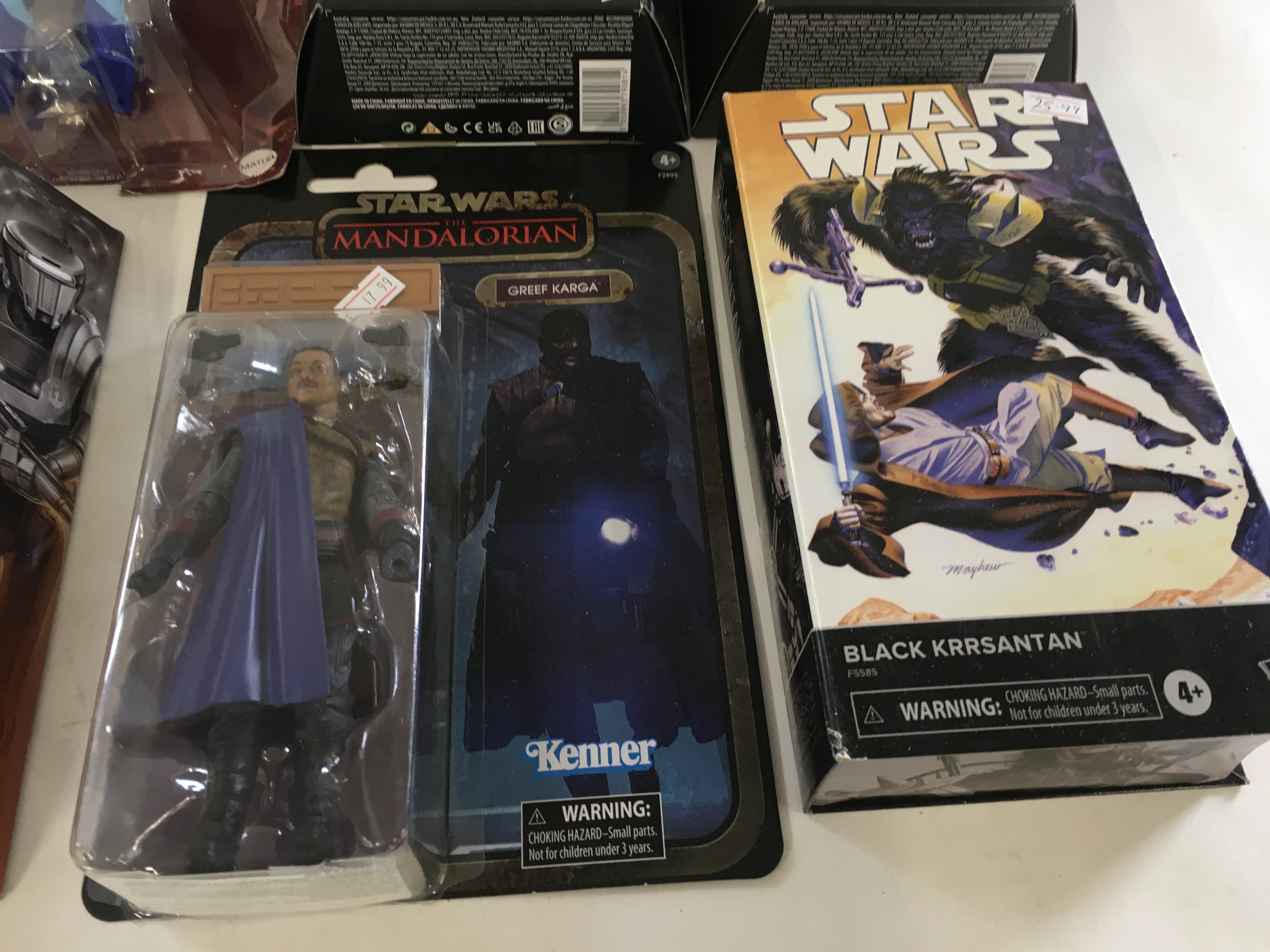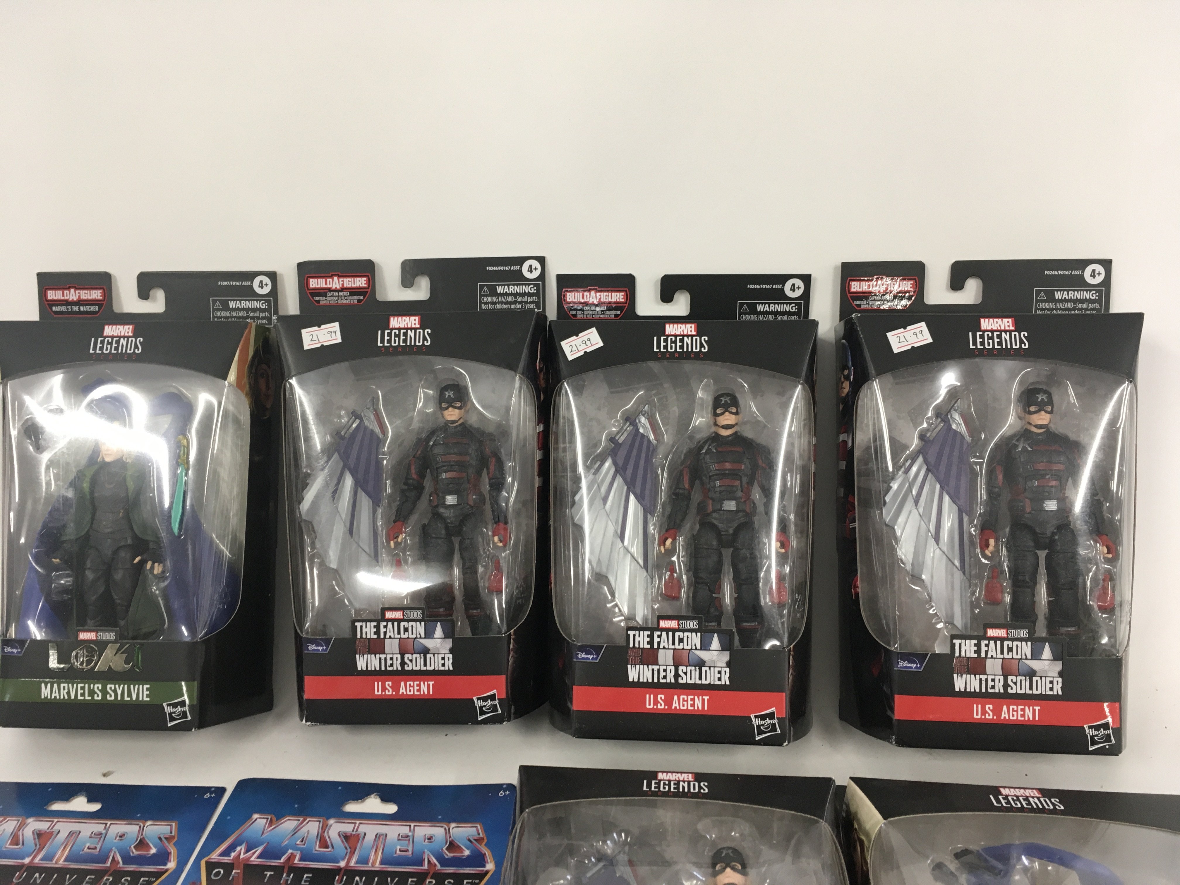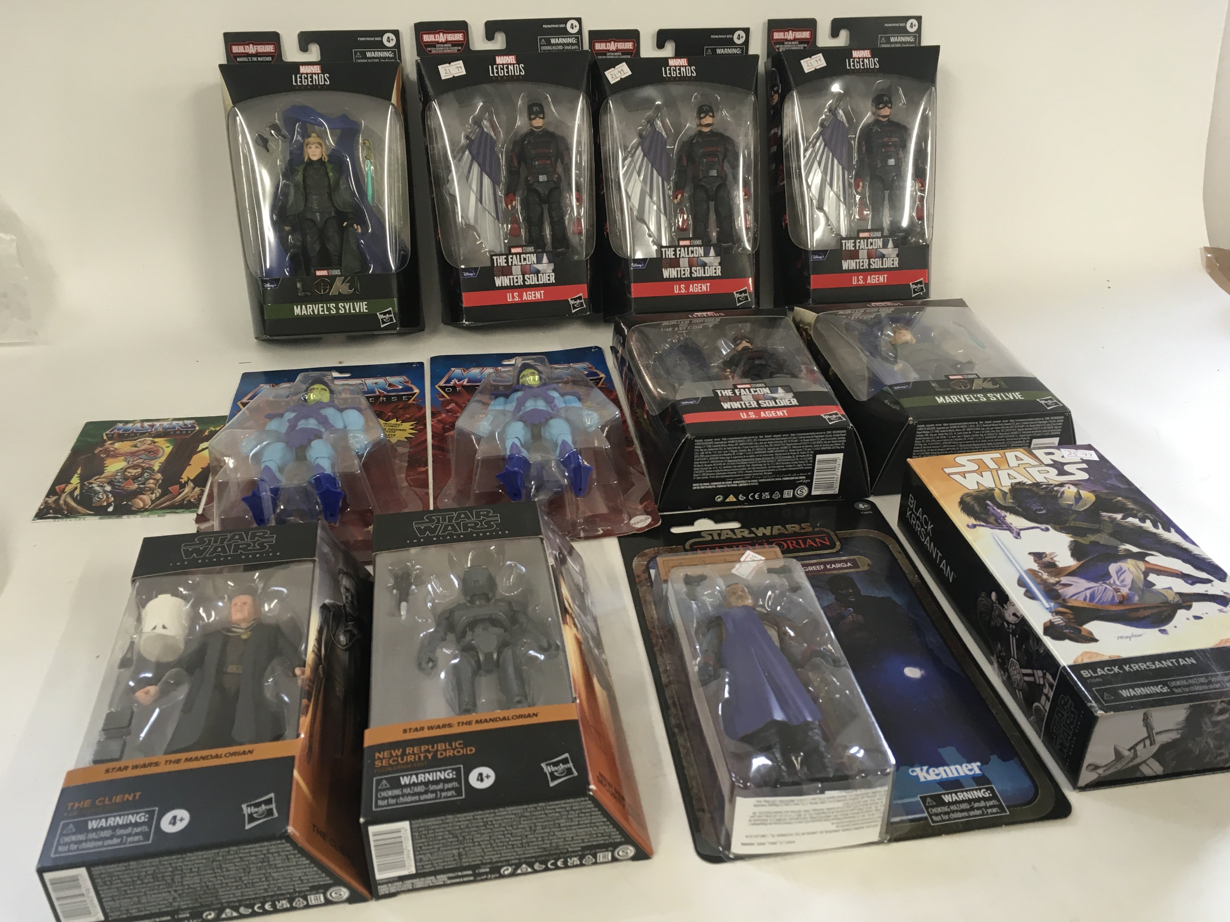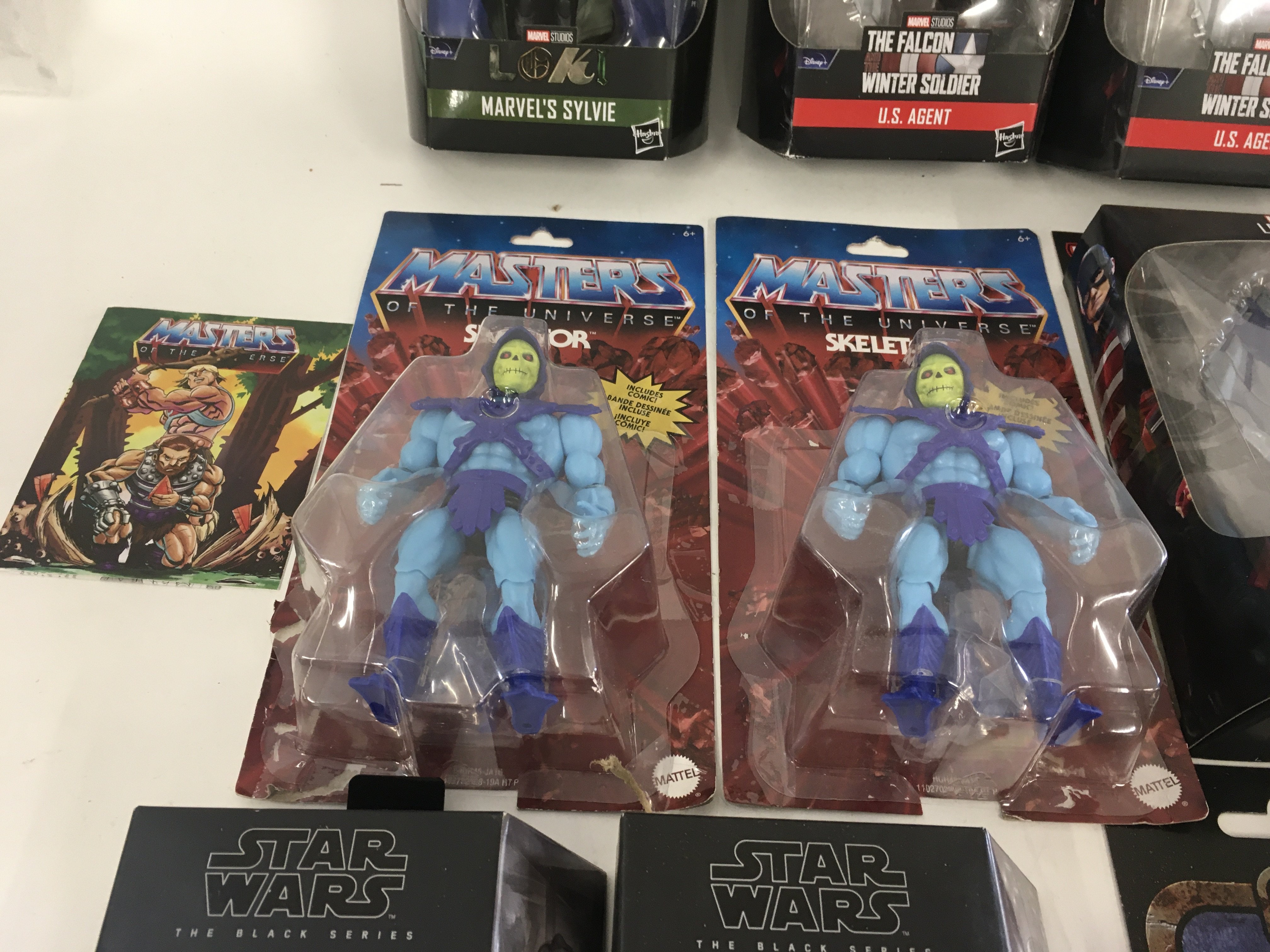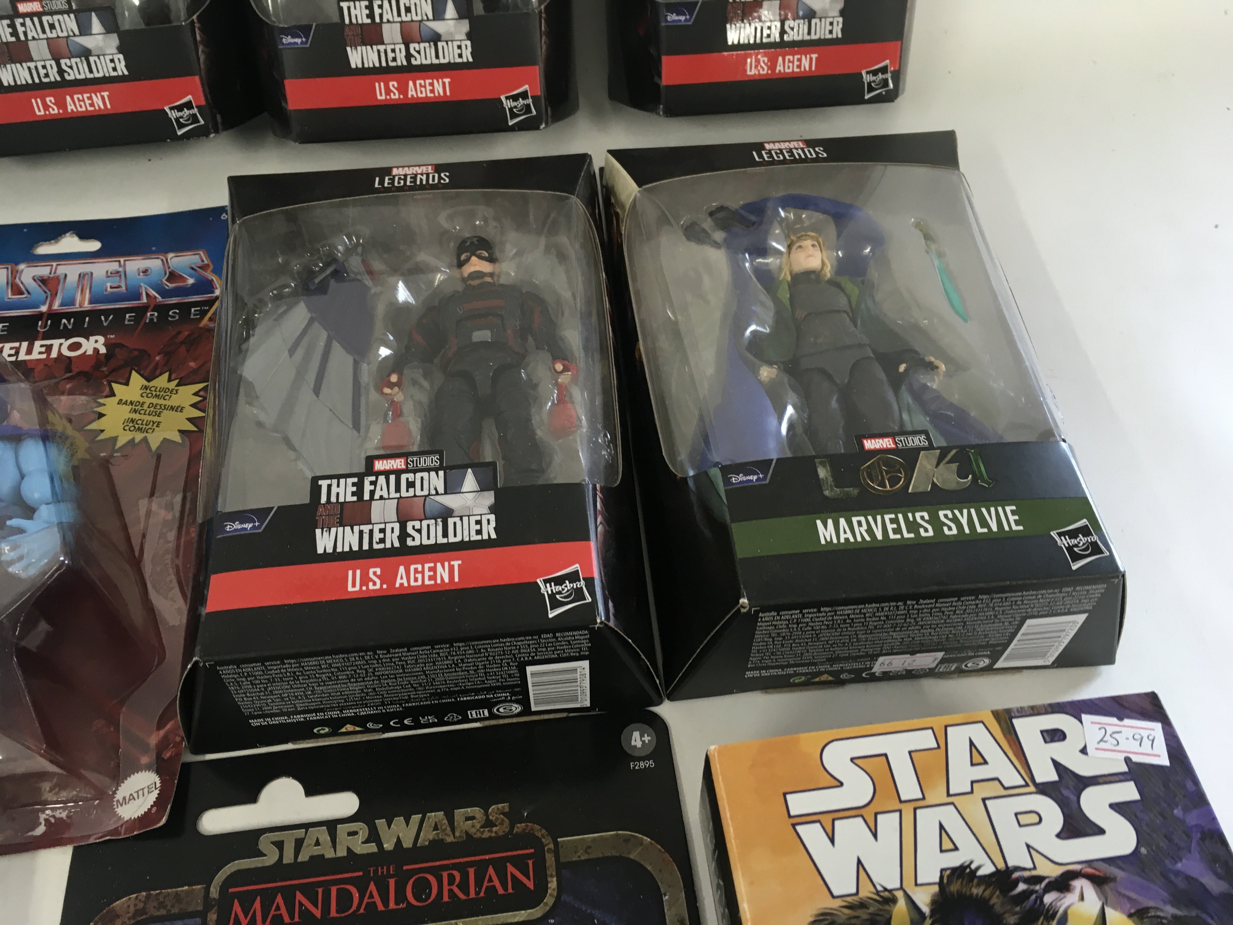 A collection of 12 boxed action figures including Star Wars..Marvel and Masters of the Universe.