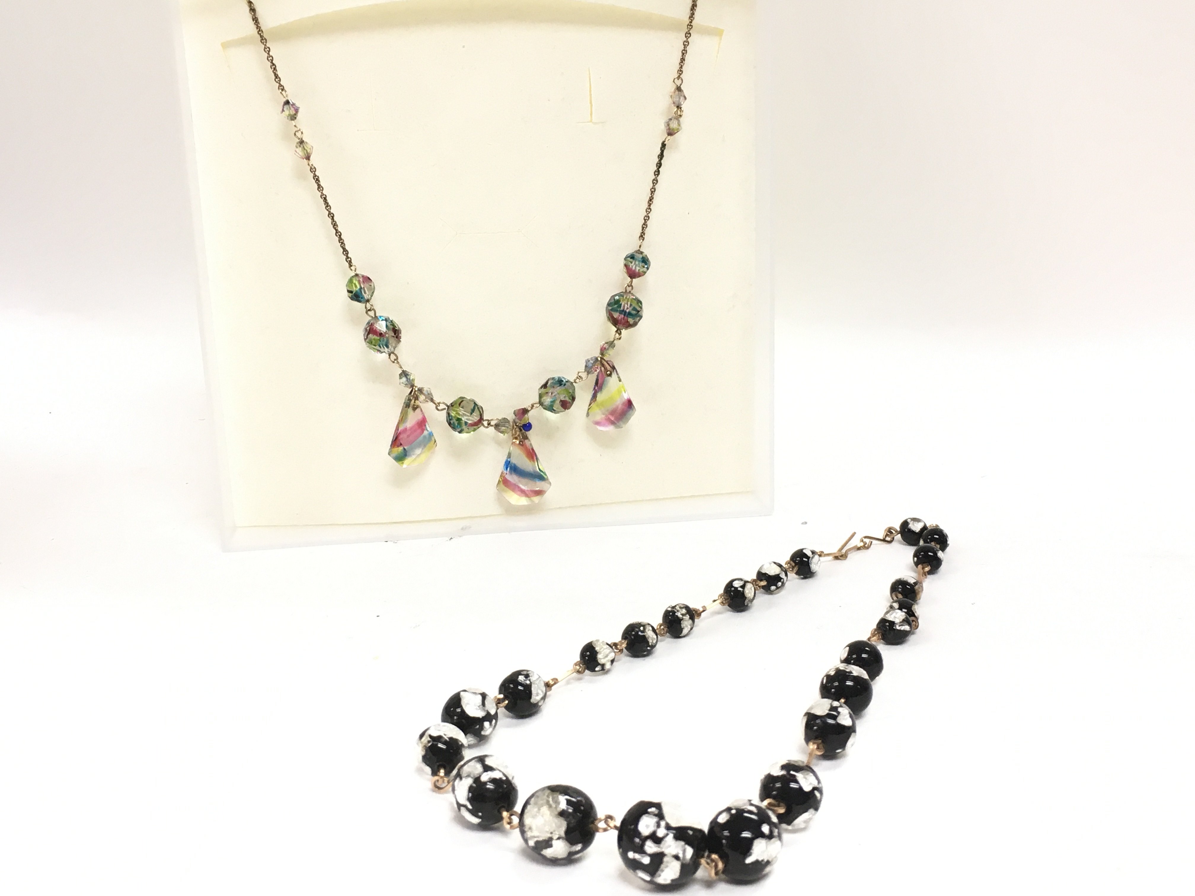 A rainbow glass necklace and a rolled gold necklace