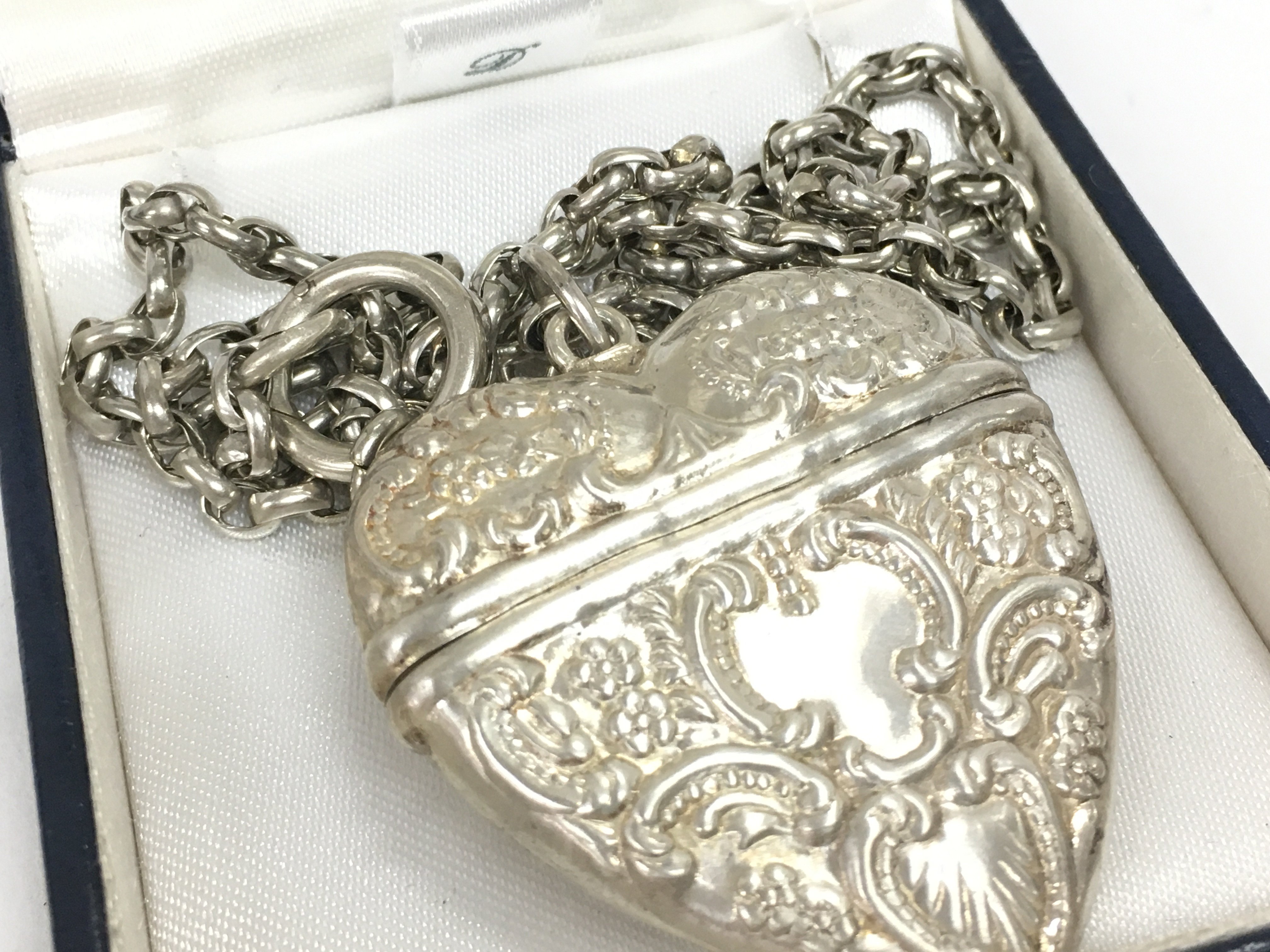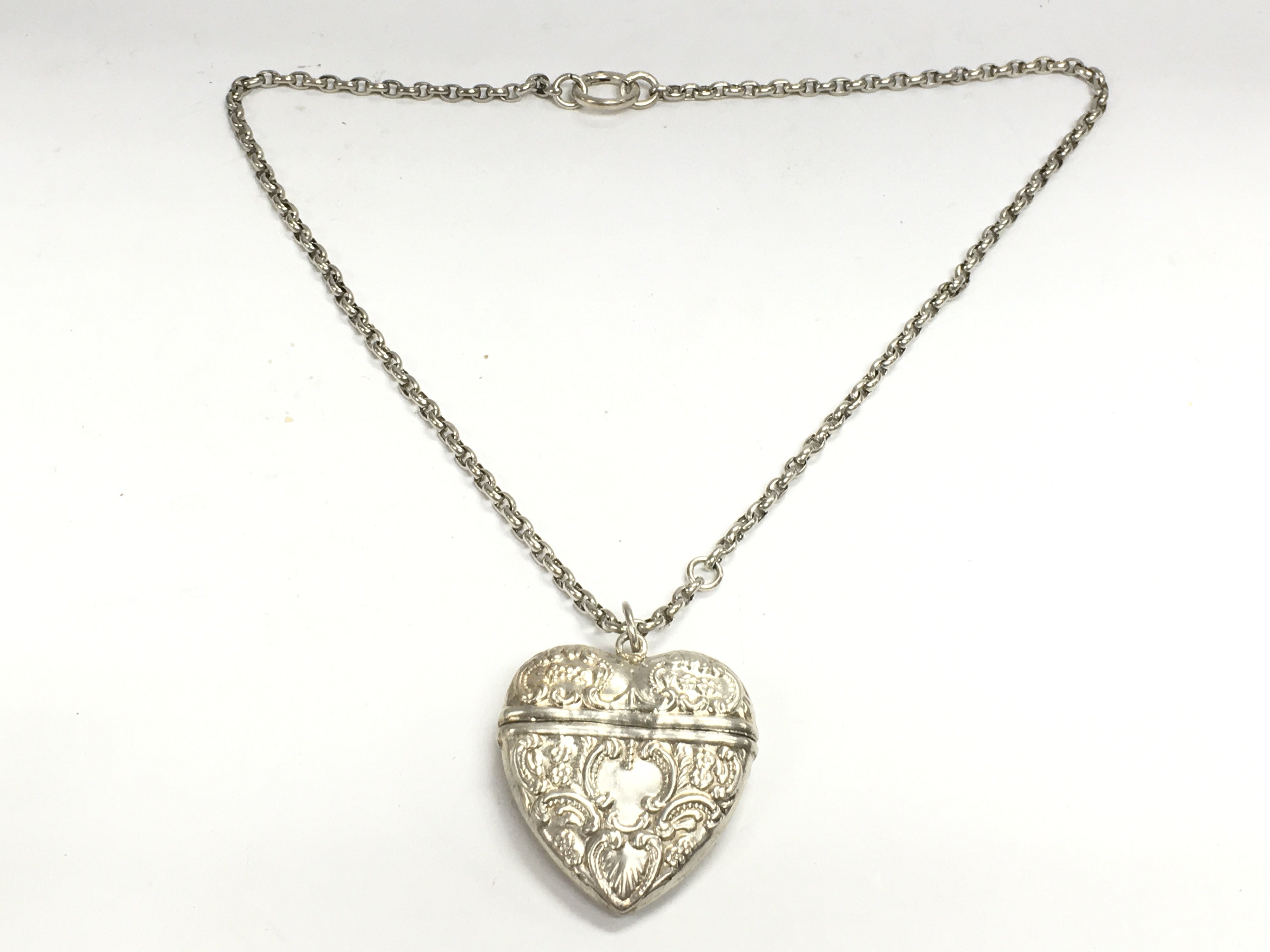 A silver heart pendant locket and chain , postage category a