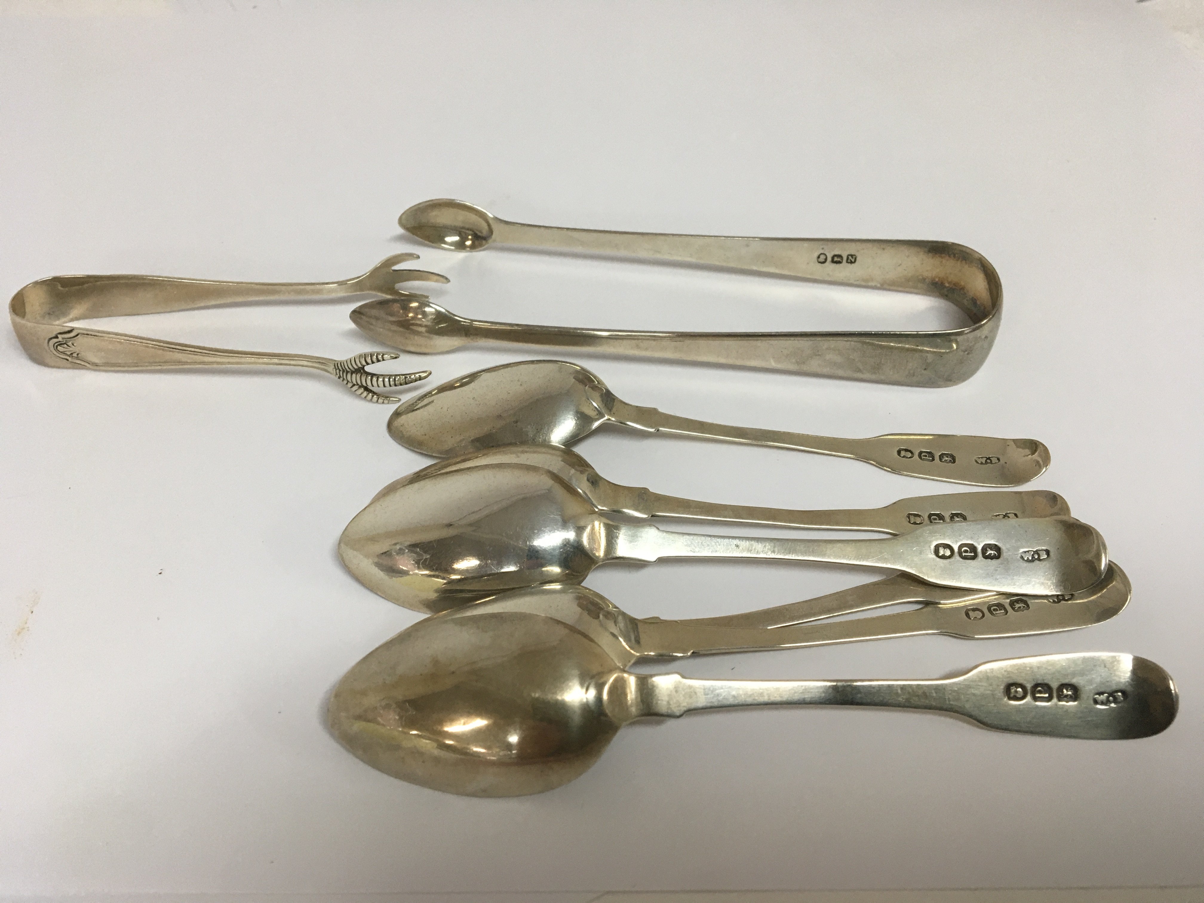 A collection of George III silver tea spoons and two pairs of sugar tongs. Weight 140g and silver plated pickle folks with mother of pearl handles.