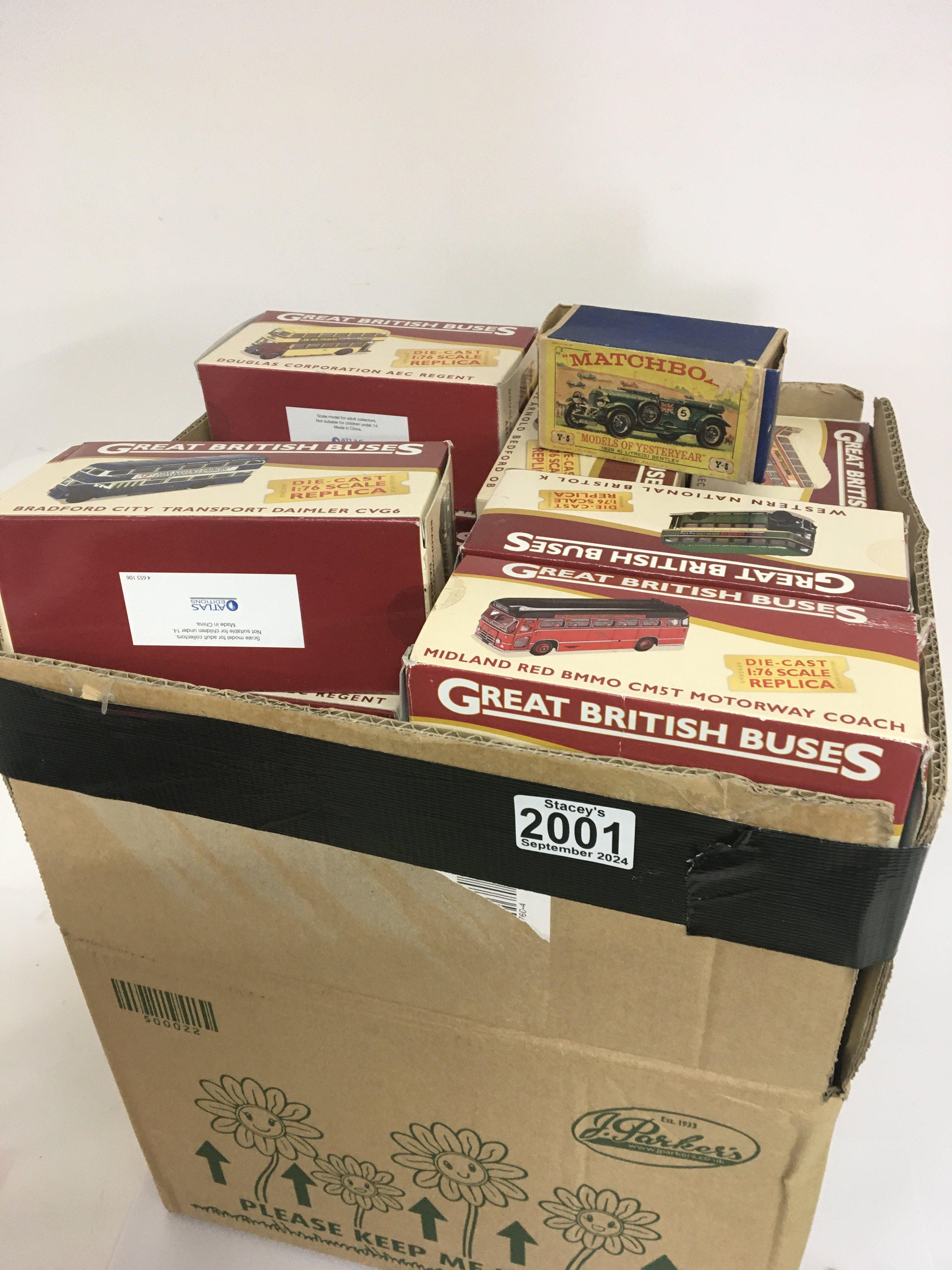 A box containing a collection of Great British Buses die cast models in boxes maker Atlas and a Vintage boxed Matchbox model of Yesteryear a 1929 Bentley.