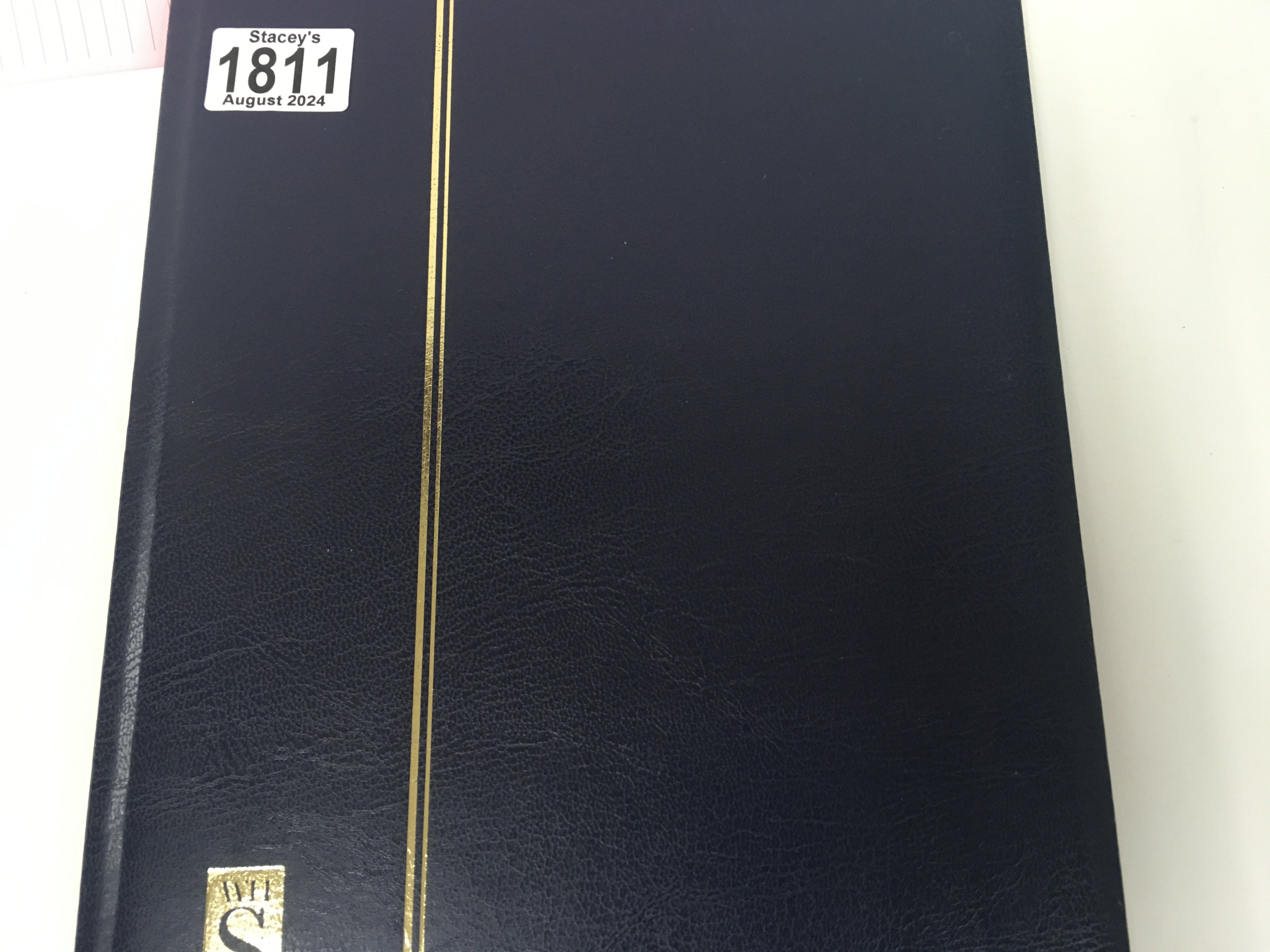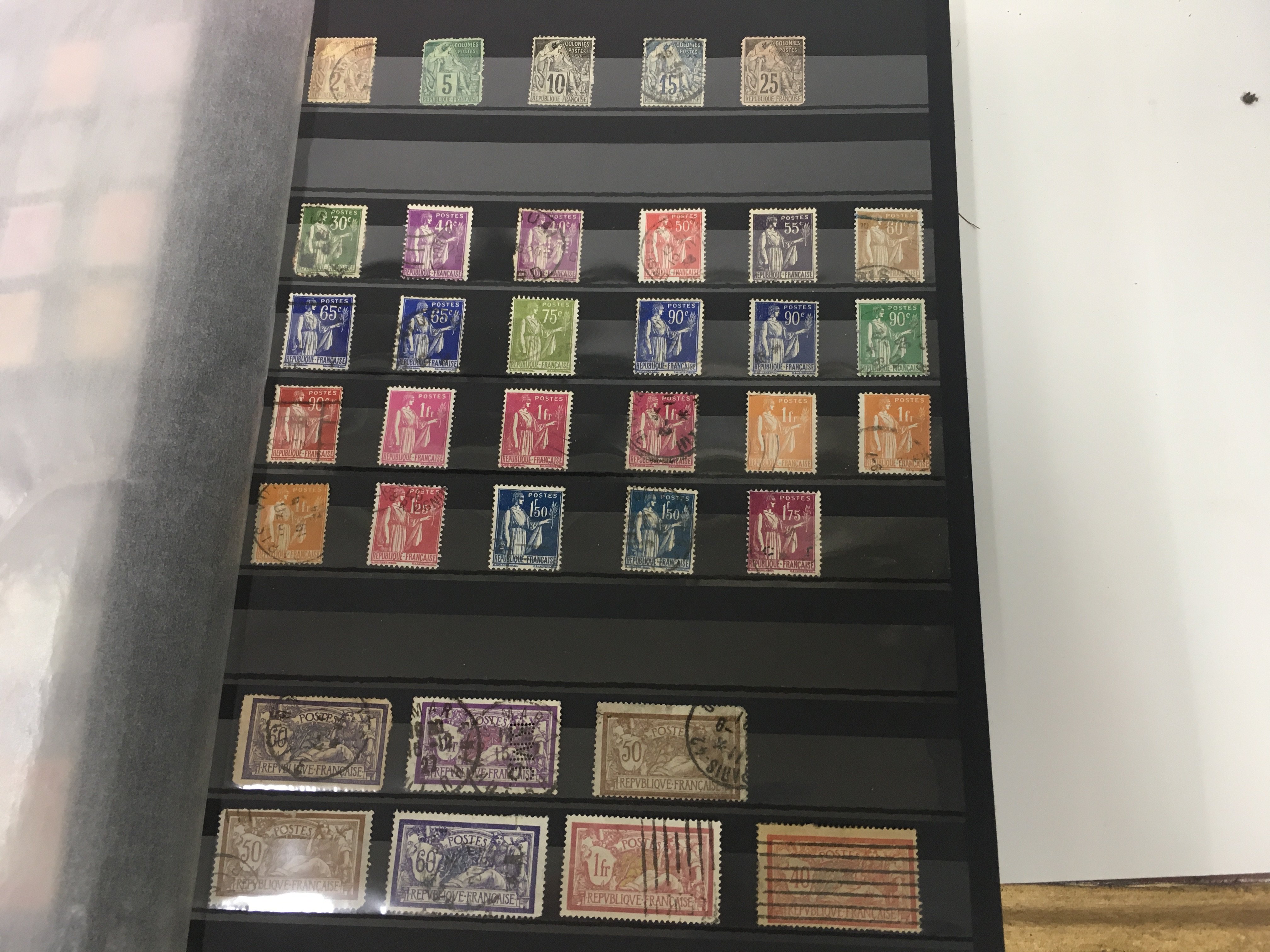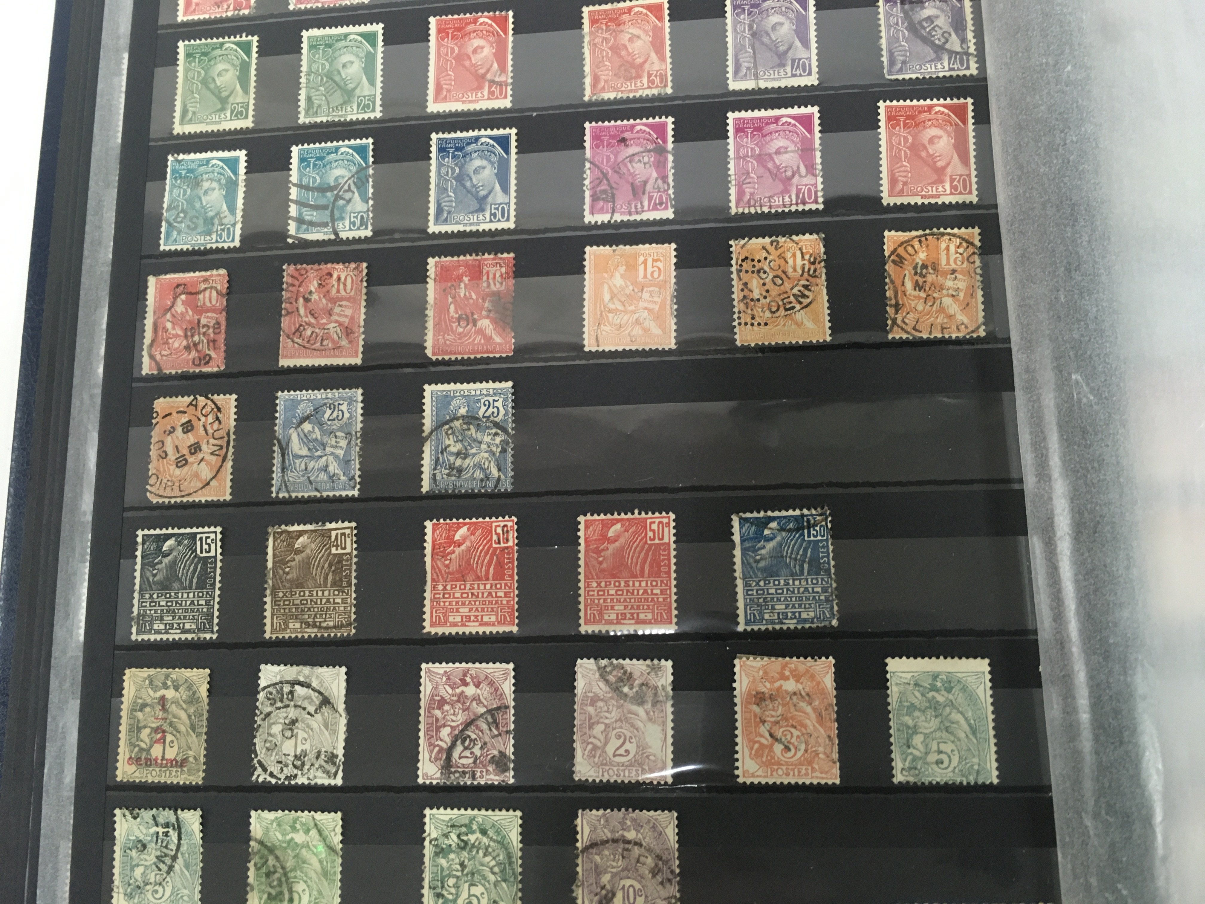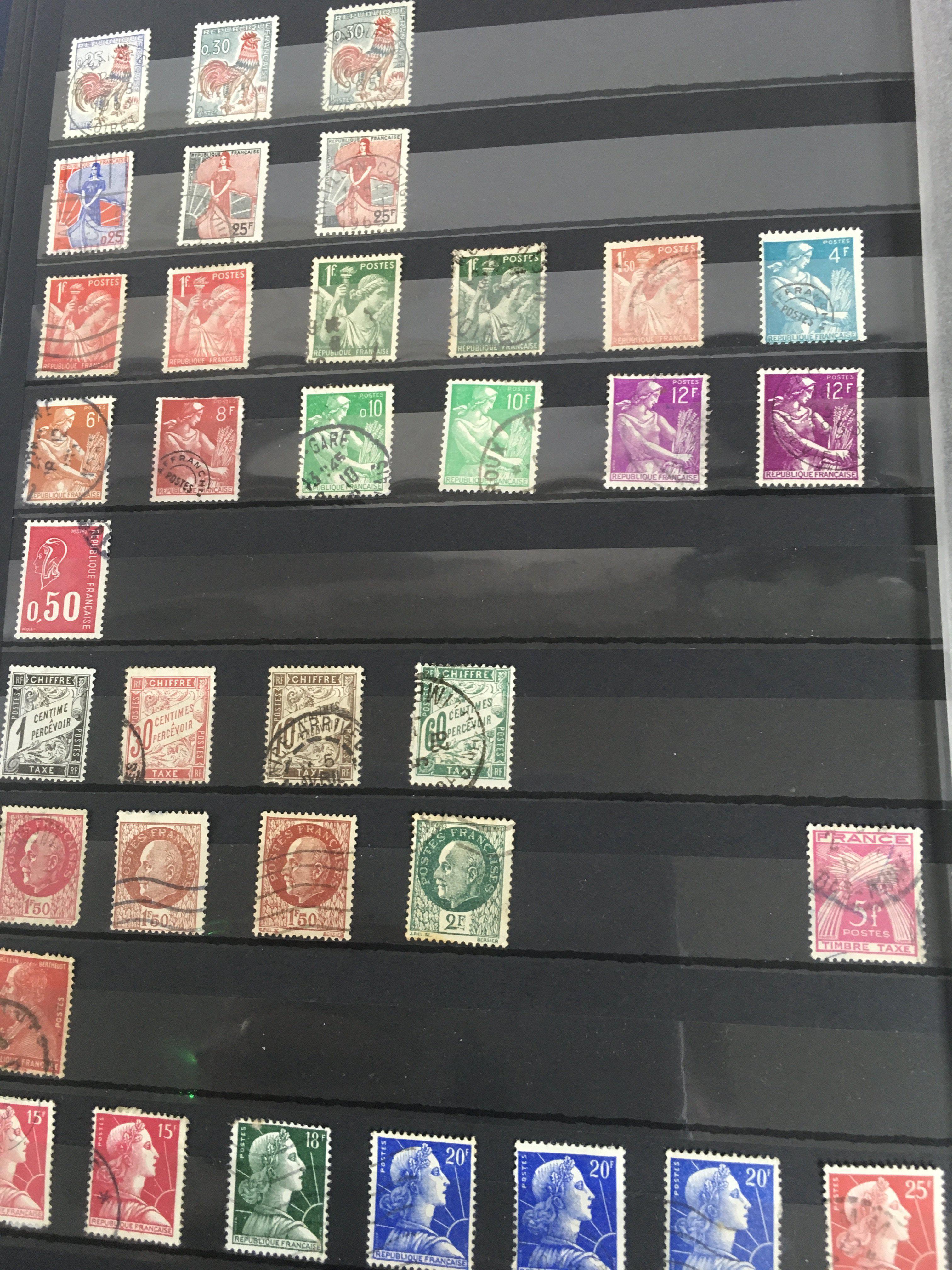A blue album containing French and Kiribati stamps .