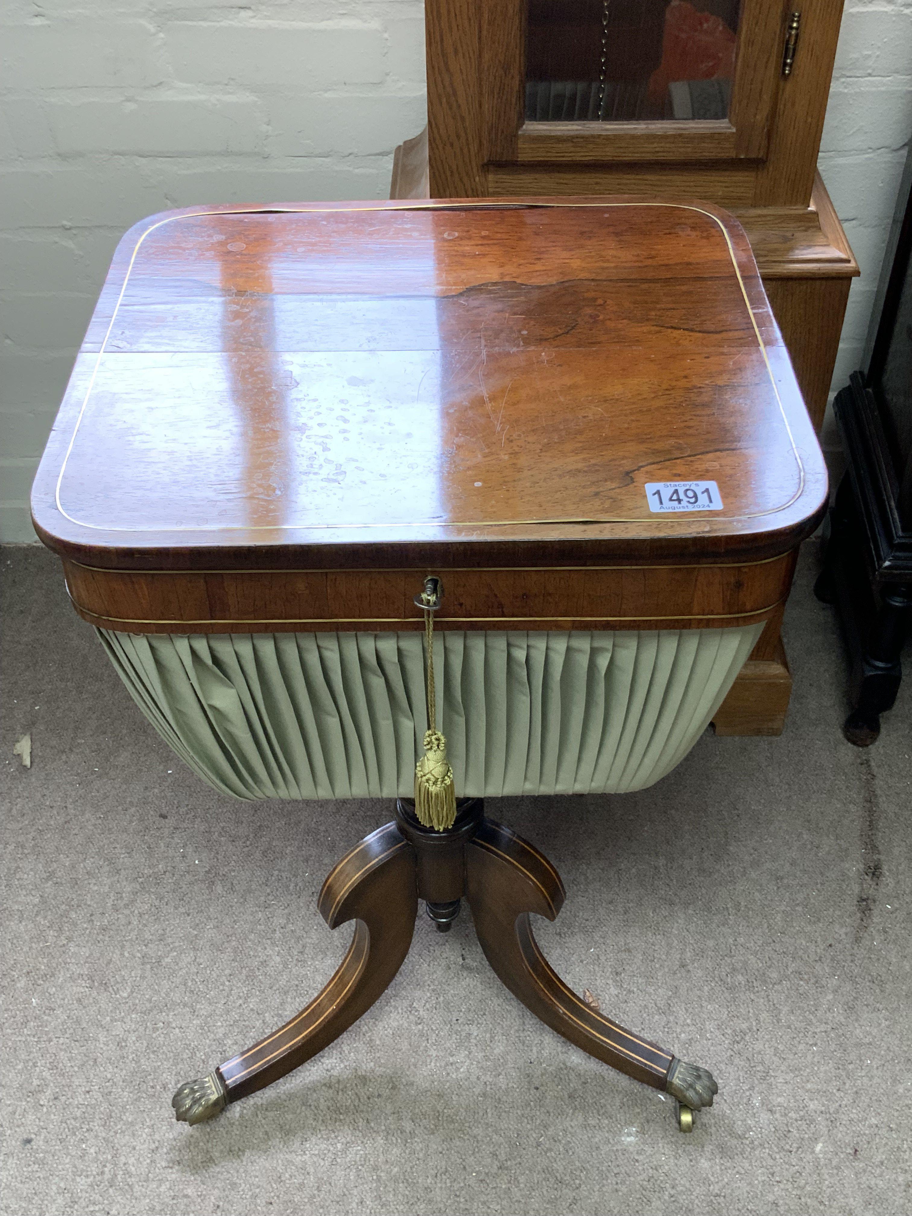 A 19th Century Regency Brass Inlaid Rosewood Lift Top Work Table with three down swept brass inlaid rosewood supports on claw feet and castors.
