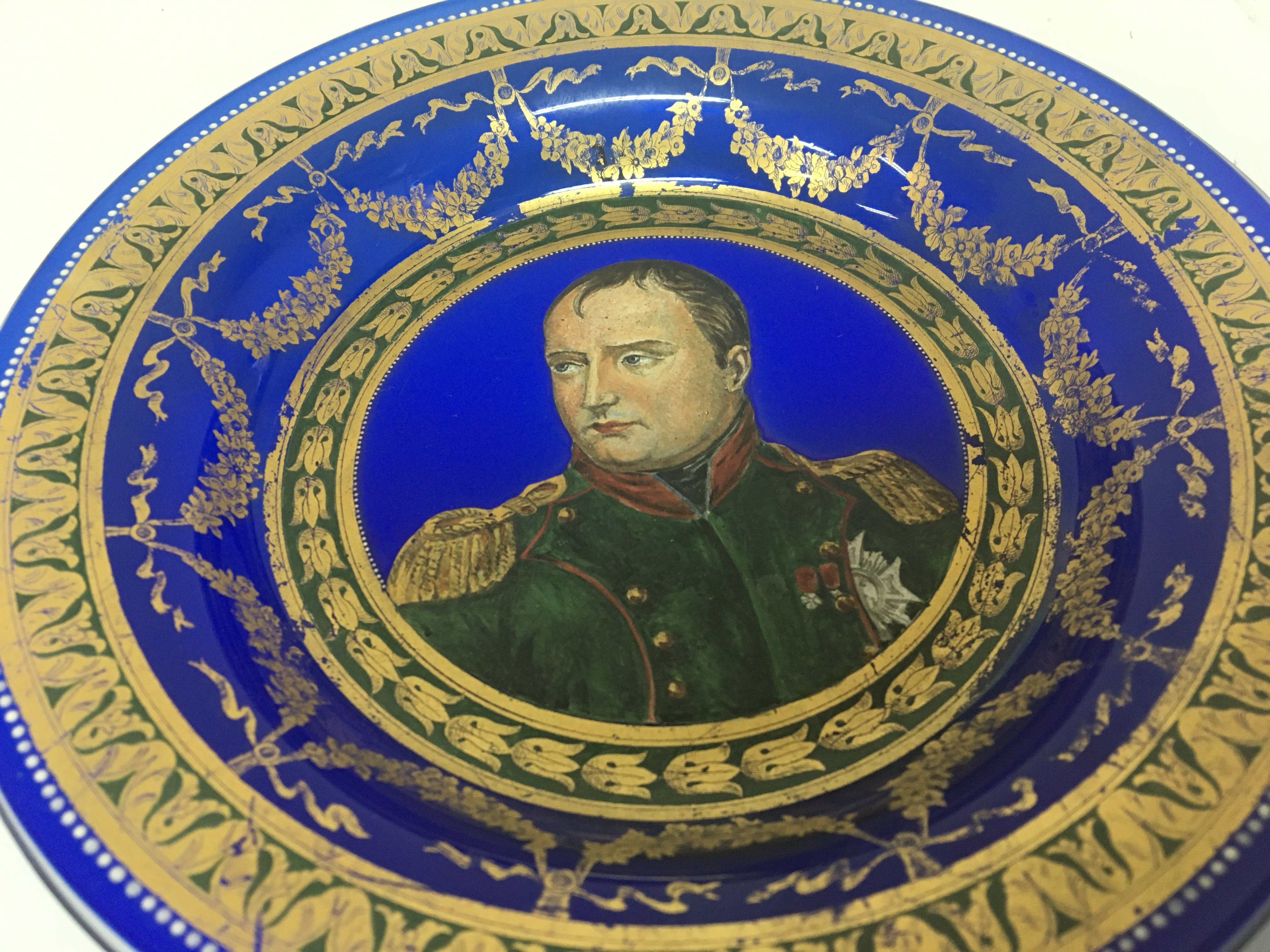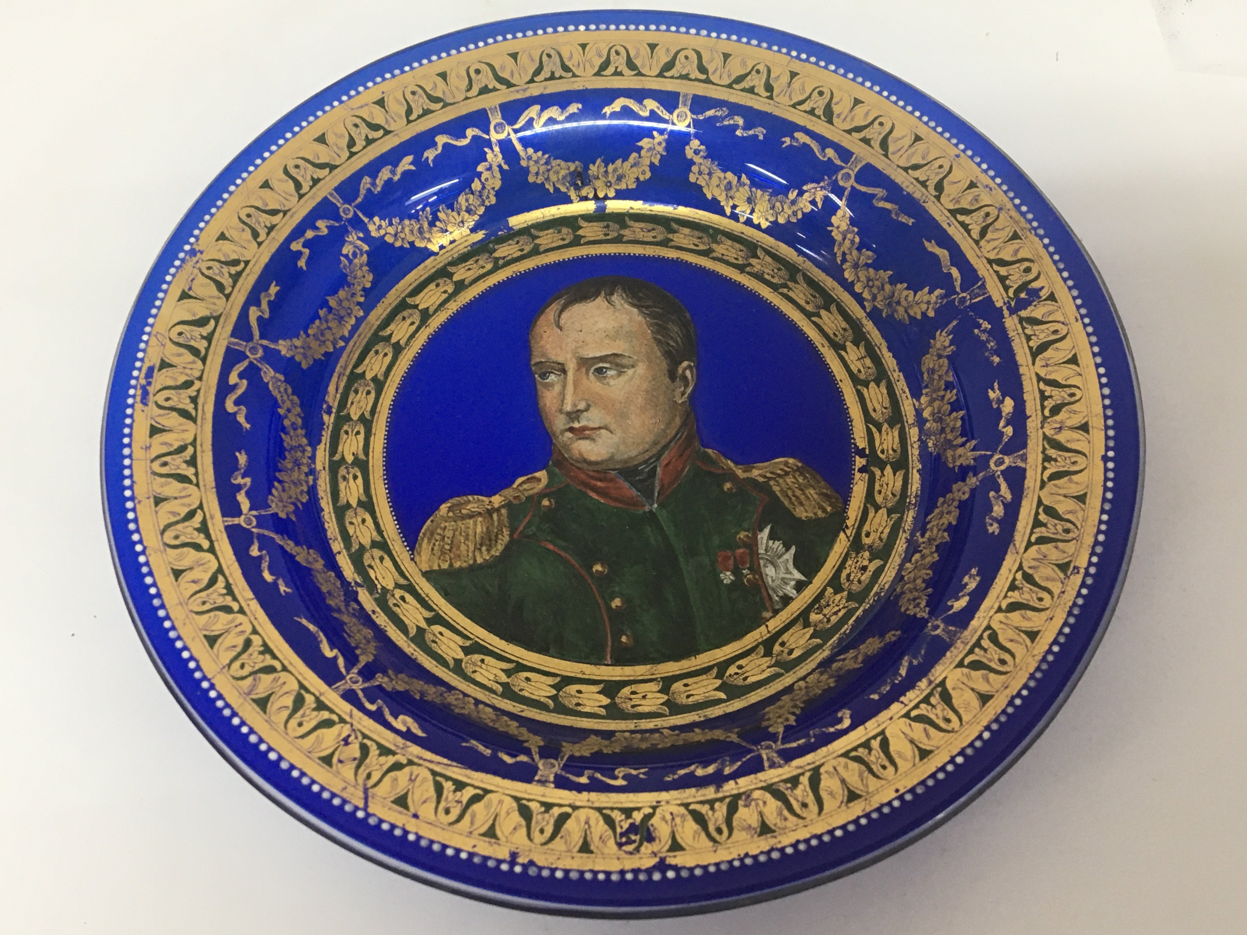 A Second Empire period enamel and gilt decorated blue glass dish depicting a portrait of Napoleon with applied French marks 3.E P.G no obvious damage diameter 19cm (Catagory D, Postage not available for this lot).