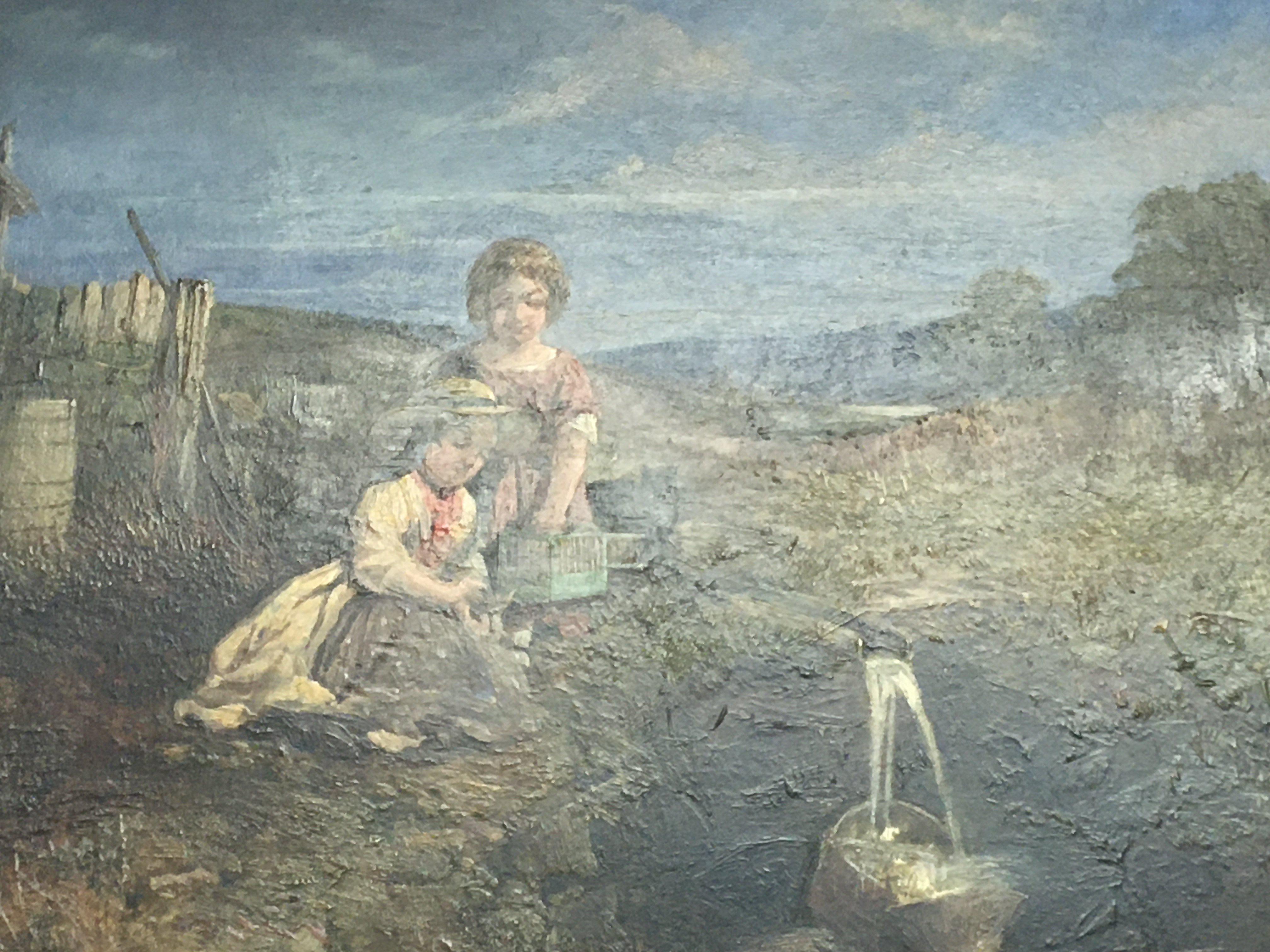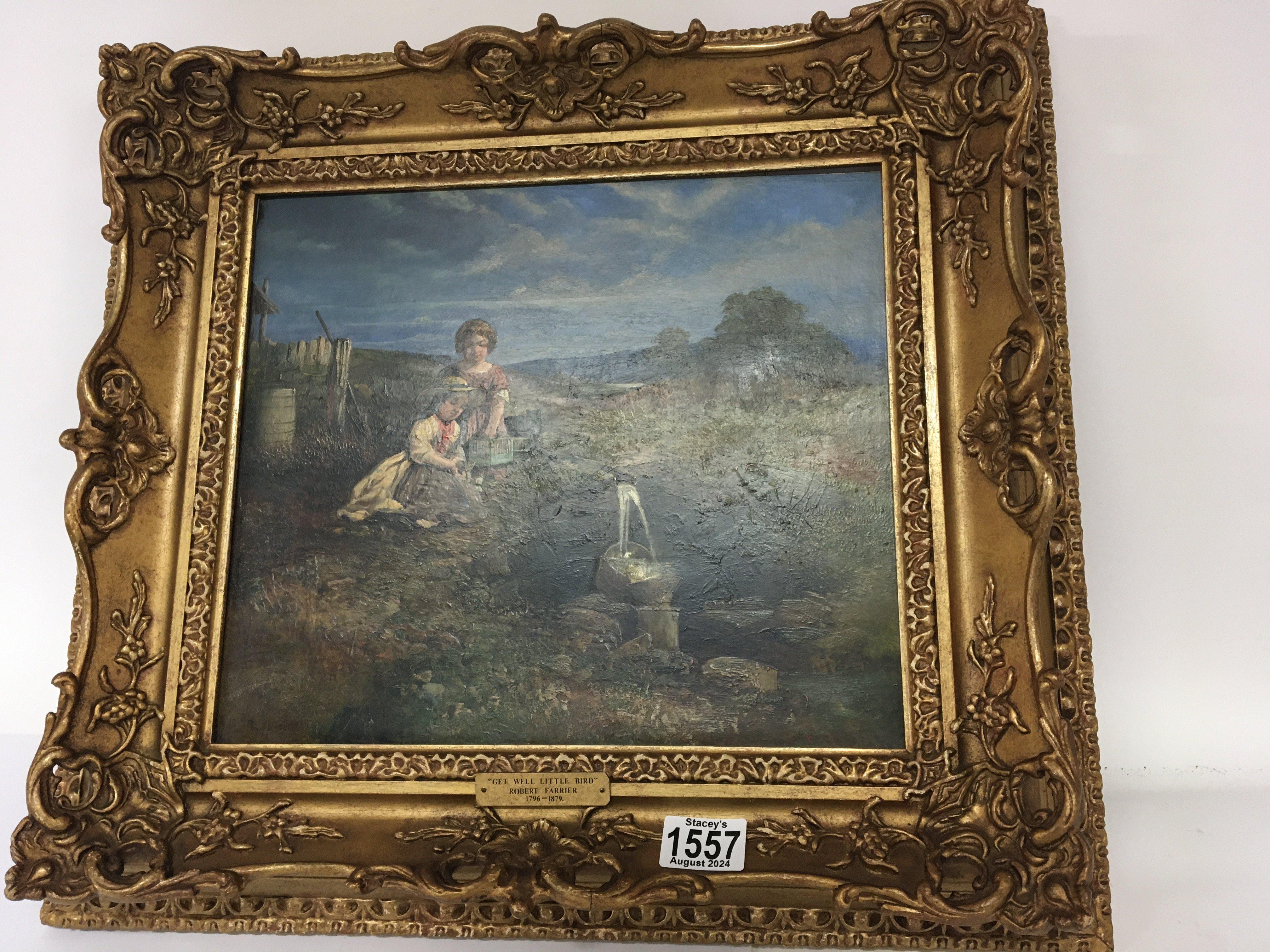 A Victorian gilt framed oil painting on panel entitled Get Well Little Bird two young children in a natural landscape with a bird. Signed lower right R Farrier Robert Farrier (1798-1878) 52x47cm