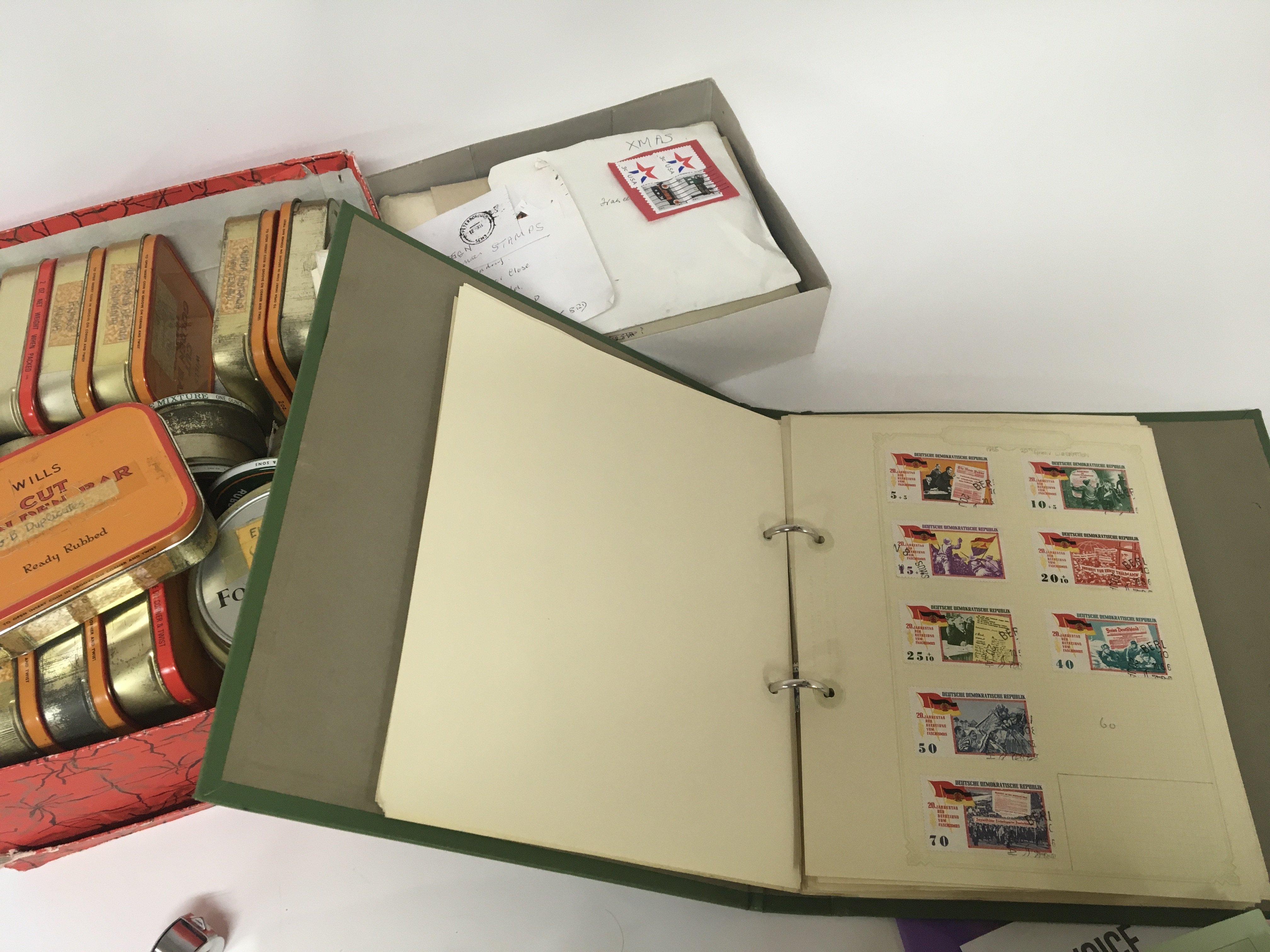 A collection of world stamps in tins and envelopes mainly used and second half of the 20th century and a green album of stamps. NO RESERVE