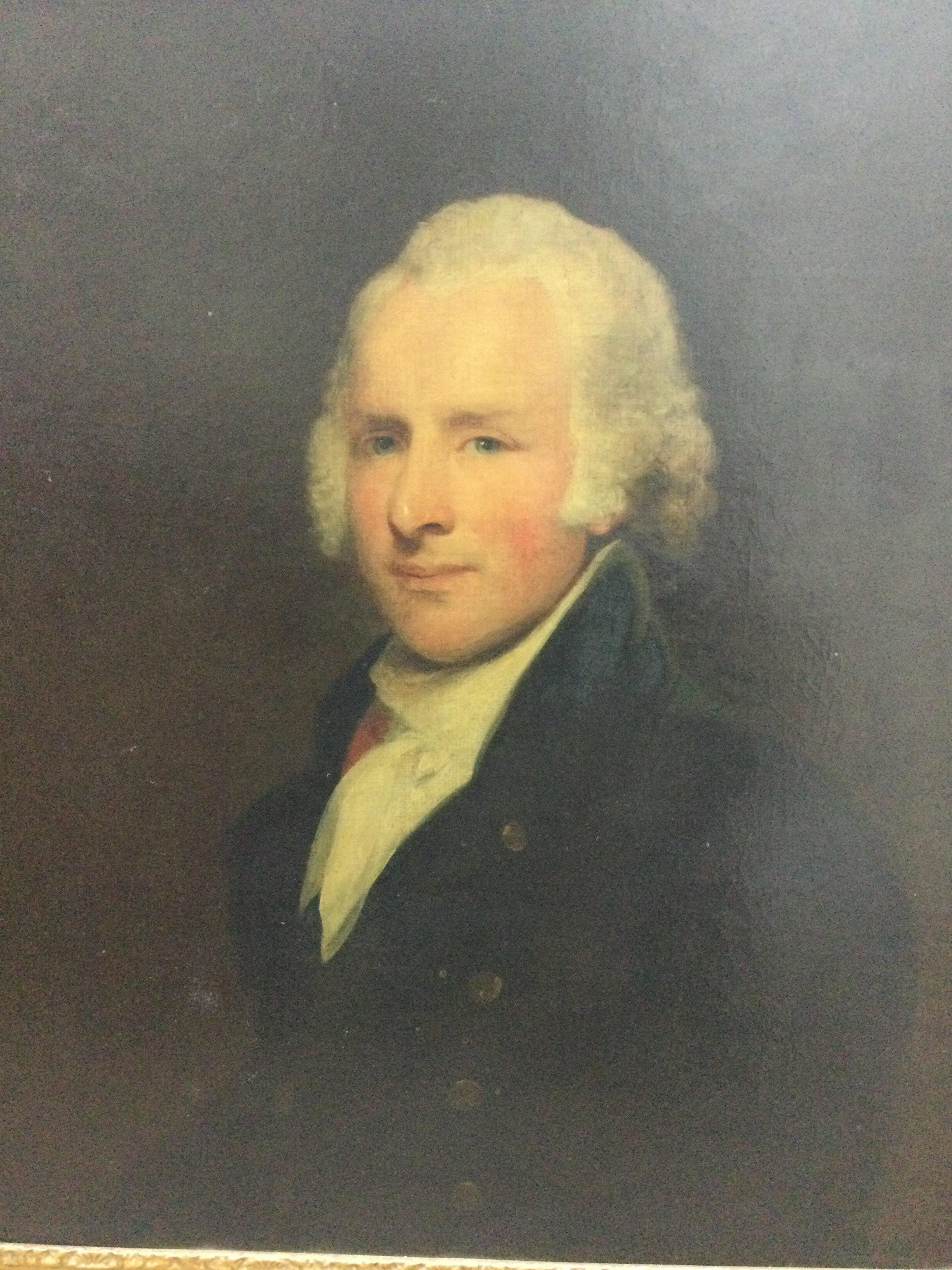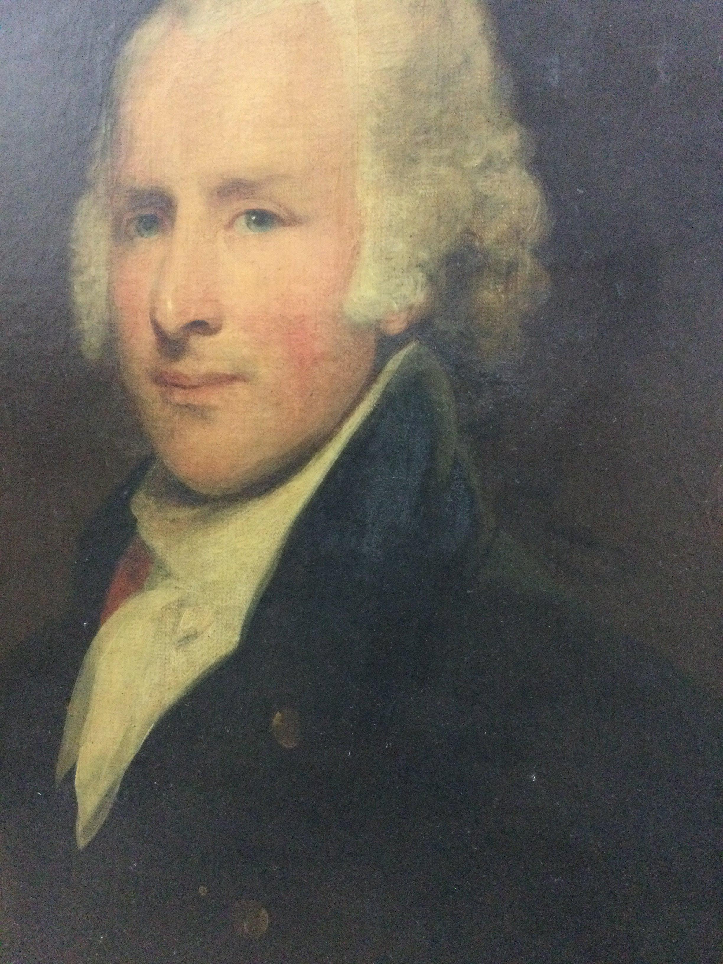A framed oil painting on canvas circle of Lemuel Francis Abbott portrait of gentleman in blue coat .60 cm x 78 cm .
