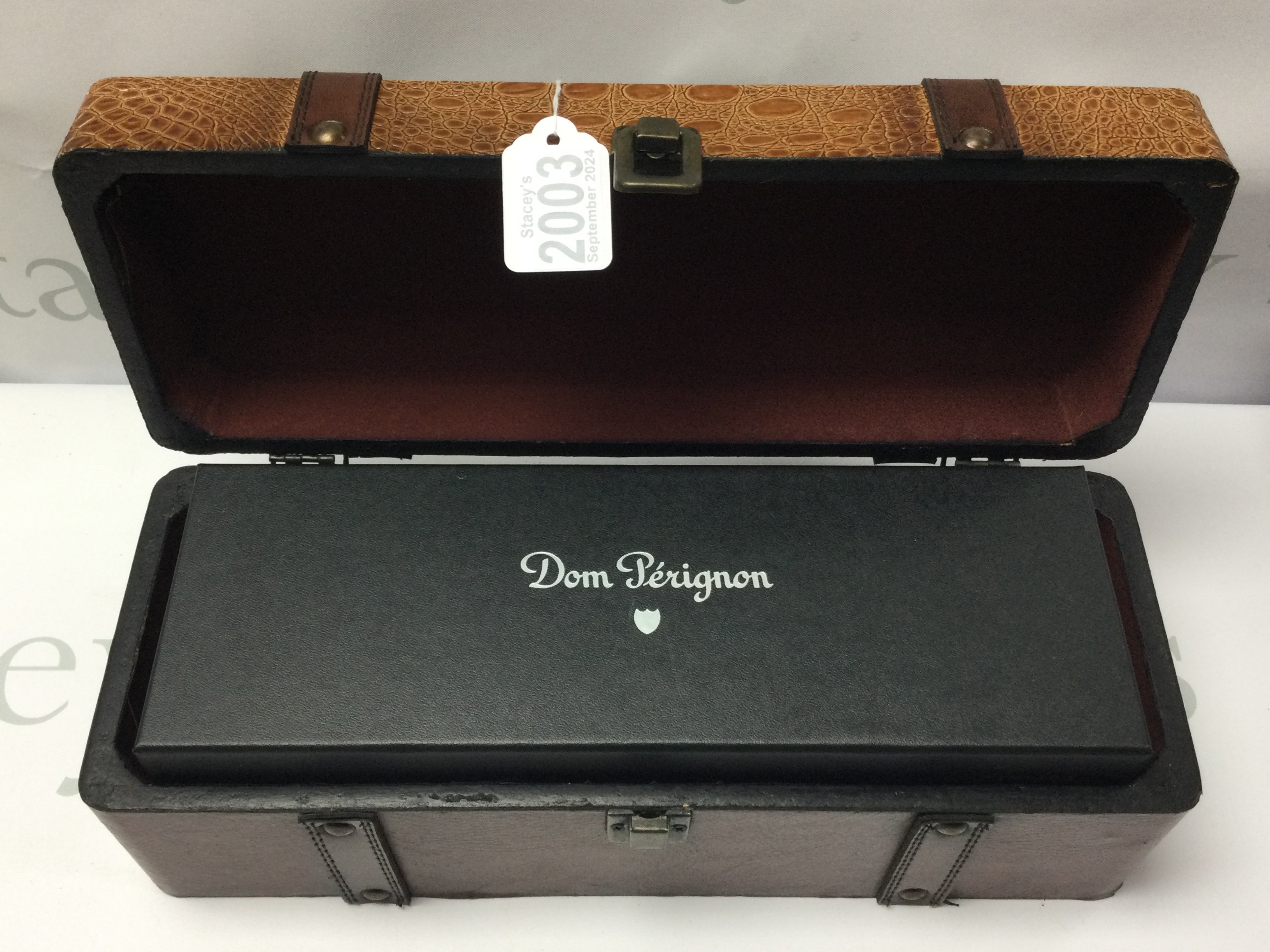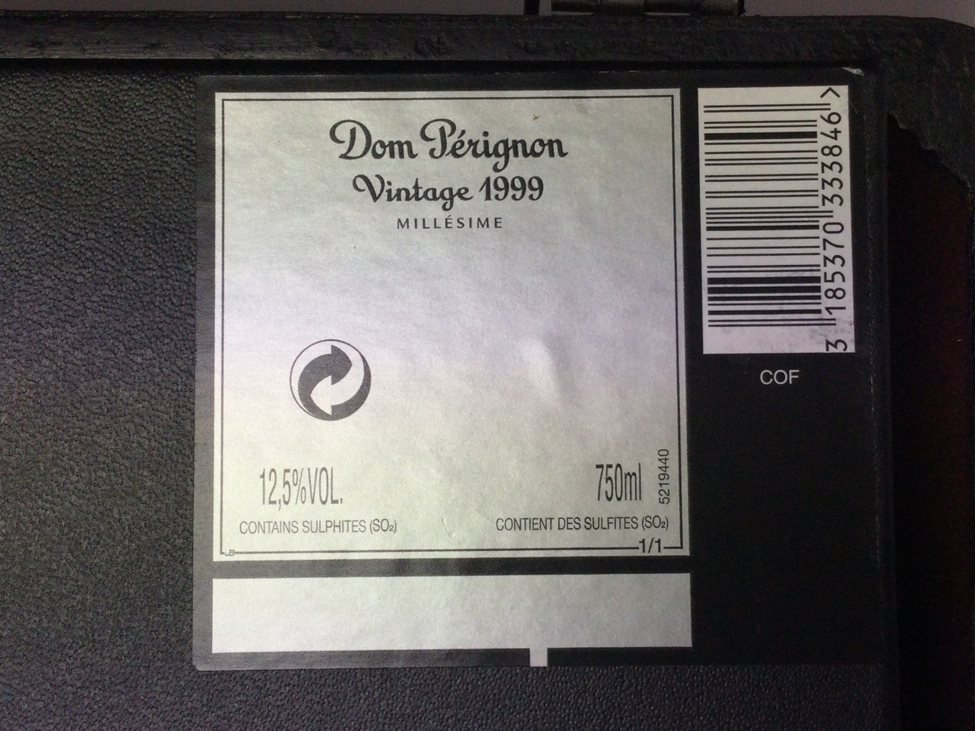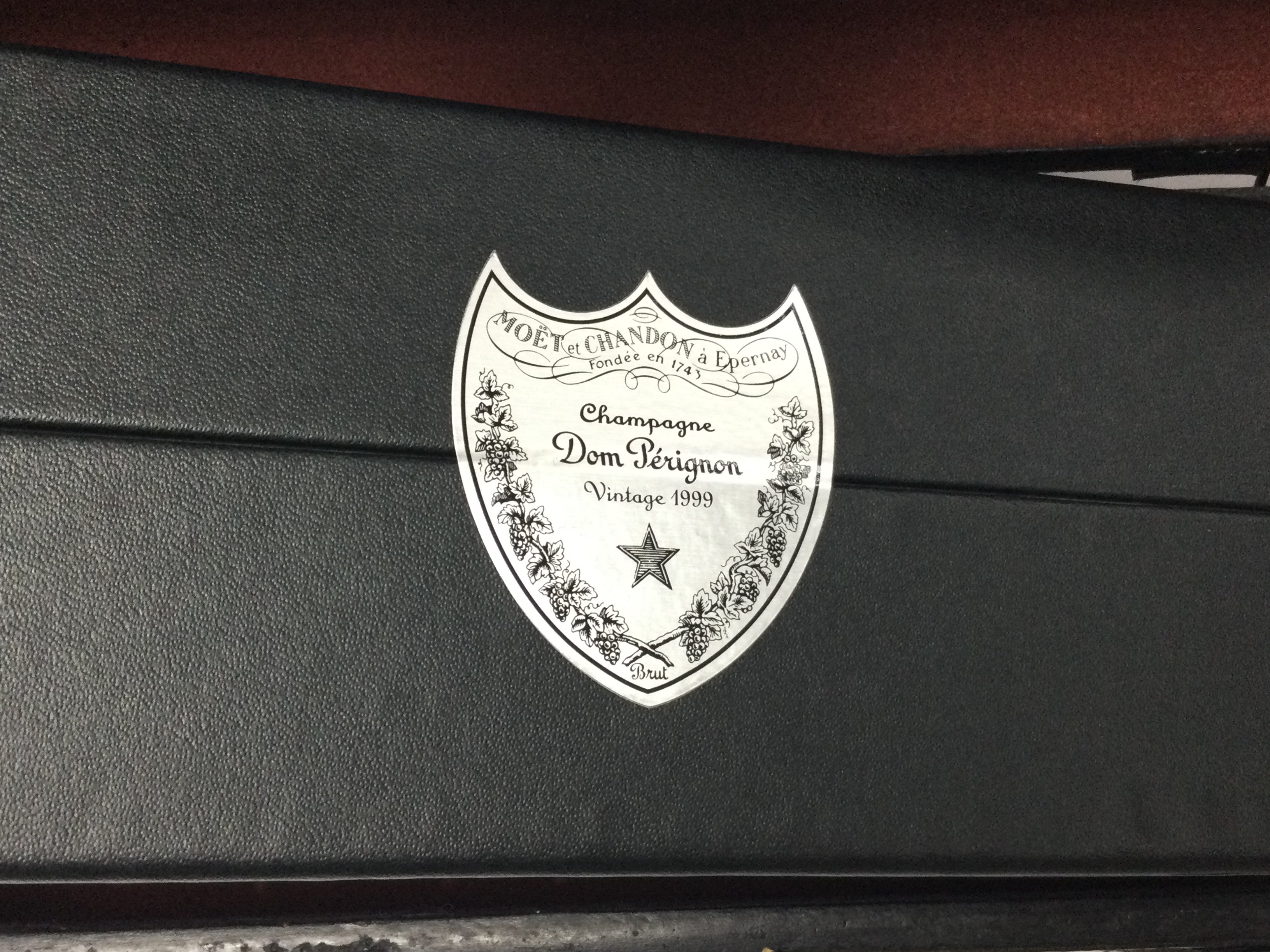 A vintage 1999 Dom Perignon 750ml sealed bottle of champagne, sealed box, with outer simulated leather bottle case. (D)