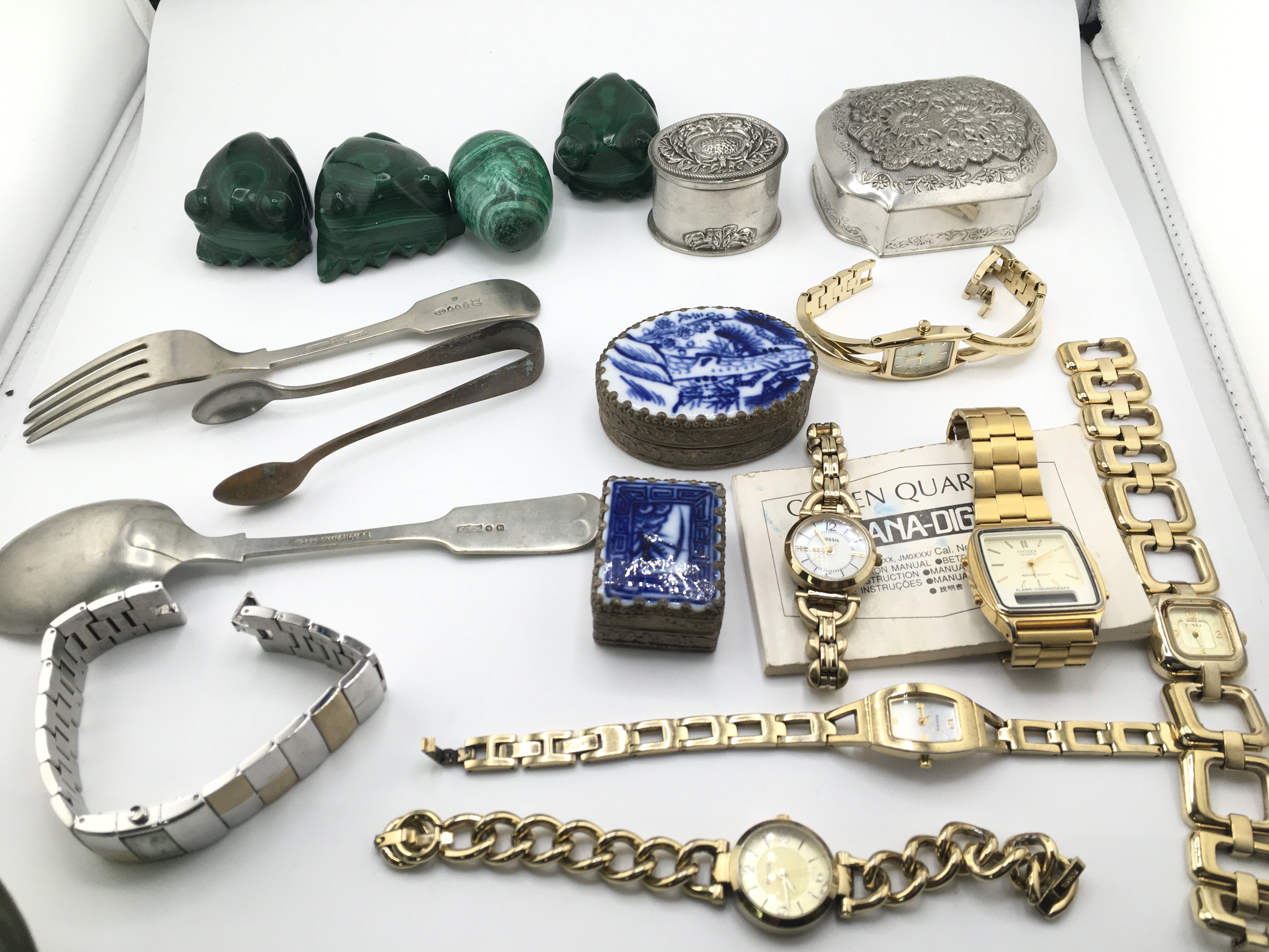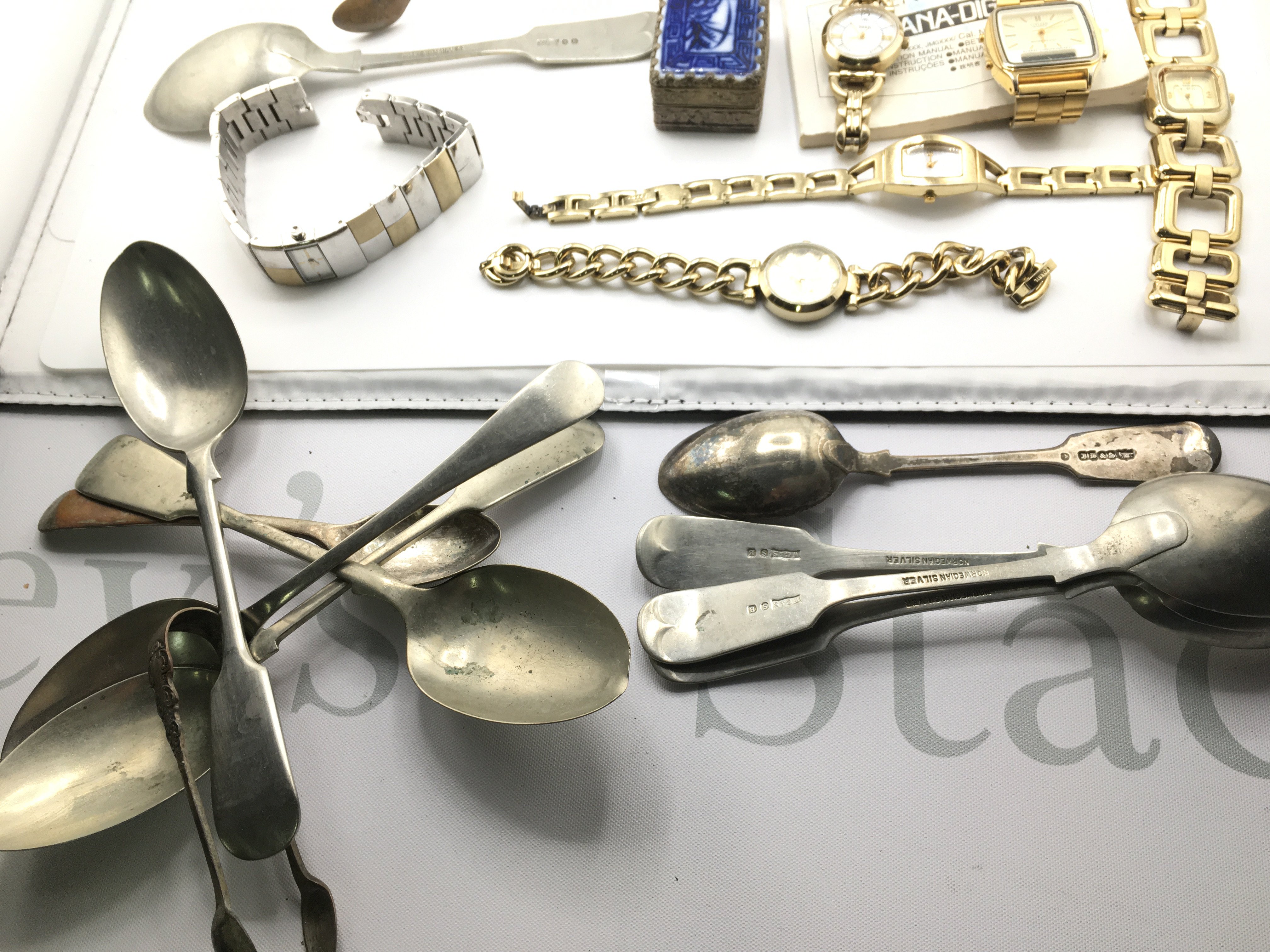 A collection of dress watches including DKNY and silver plated and other cutlery. Postage B