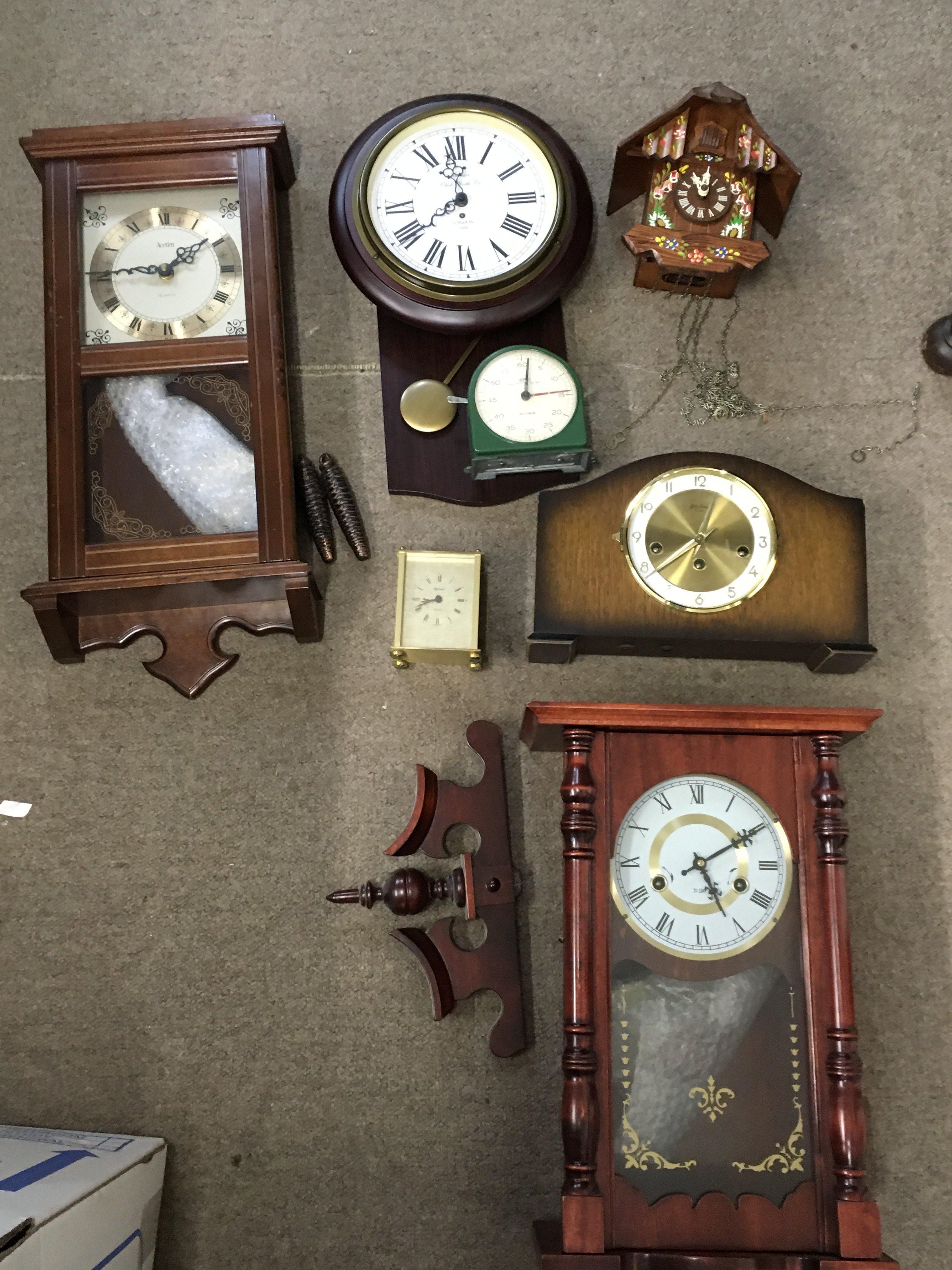 A collection of clocks including a Acctim wall clock, Bentina mantle clock etc. This lot cannot be posted. NO RESERVE