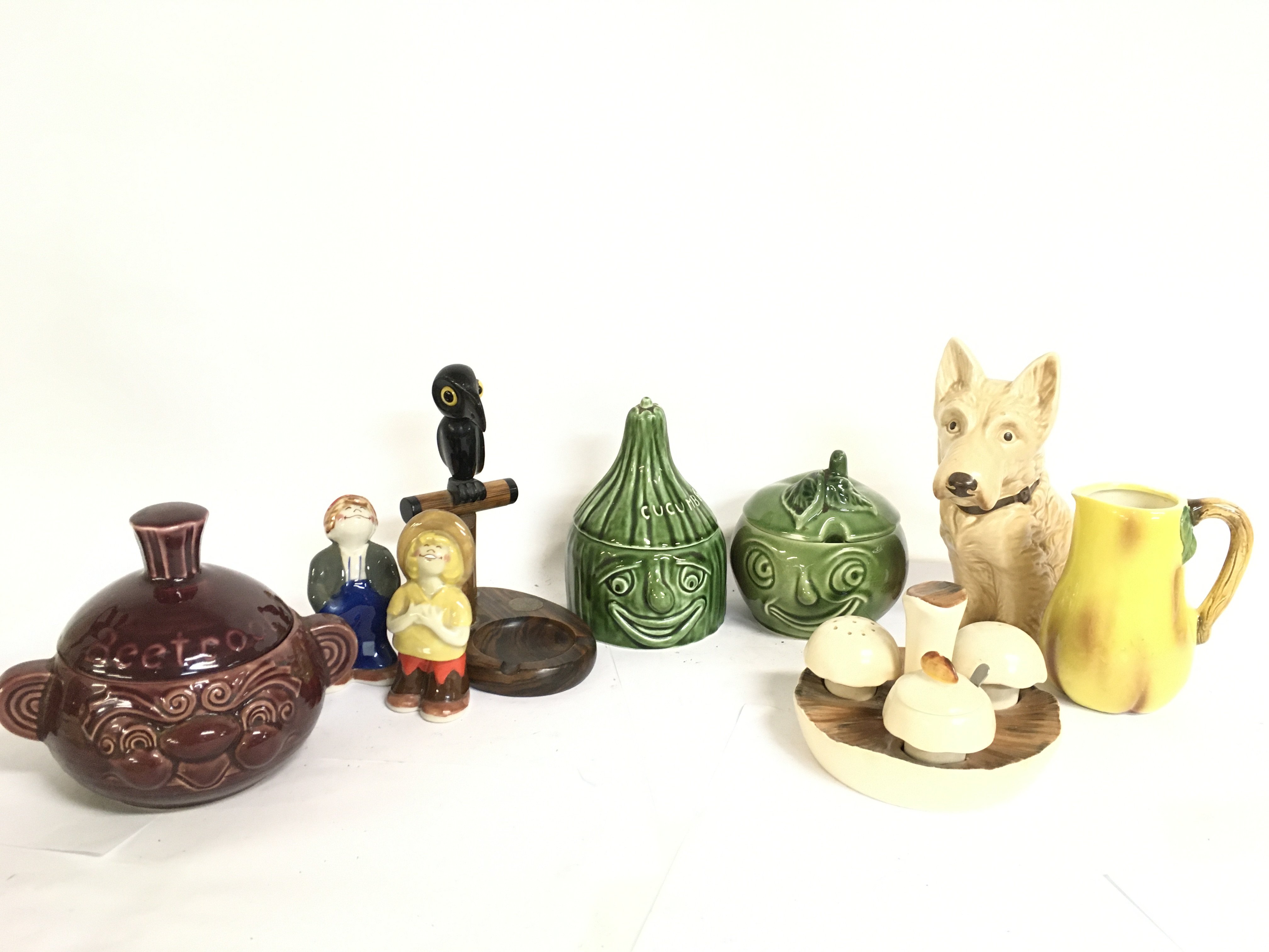 A collection of ceramics including Carlton Ware mushroom condiment set, Sylvac dog, Sadler kitchen jars, Wade S/P shakers. This lot cannot be posted. NO RESERVE