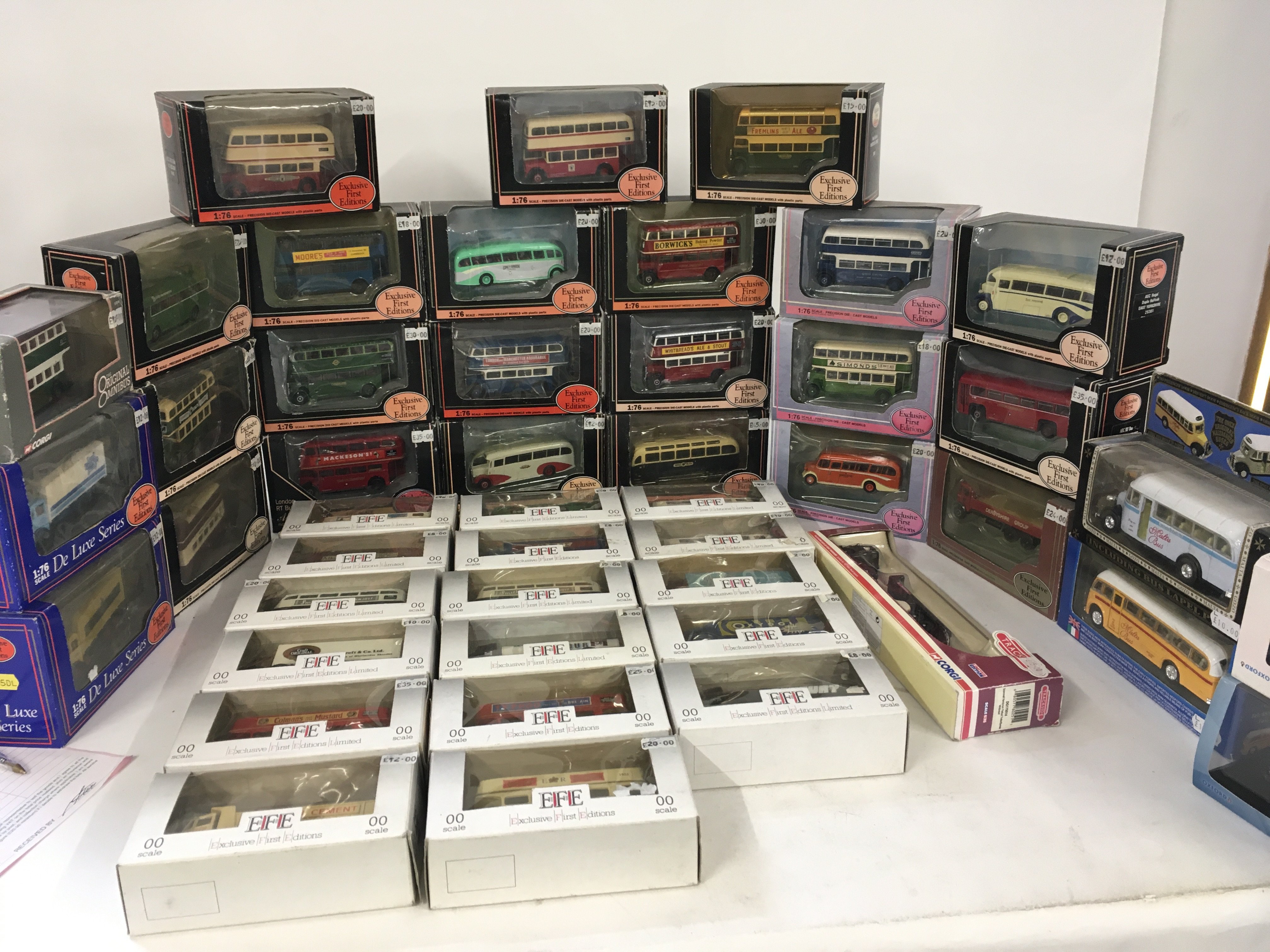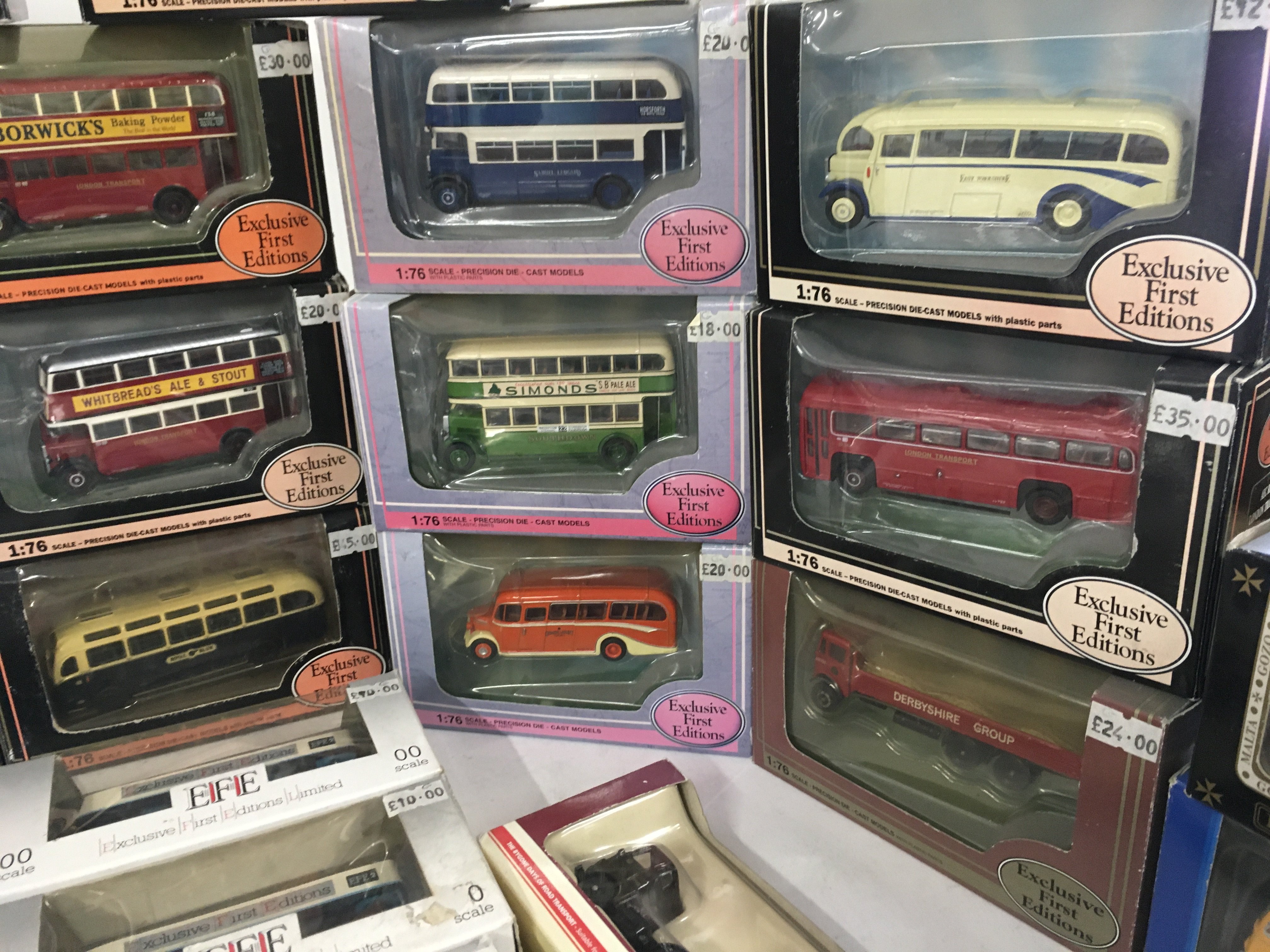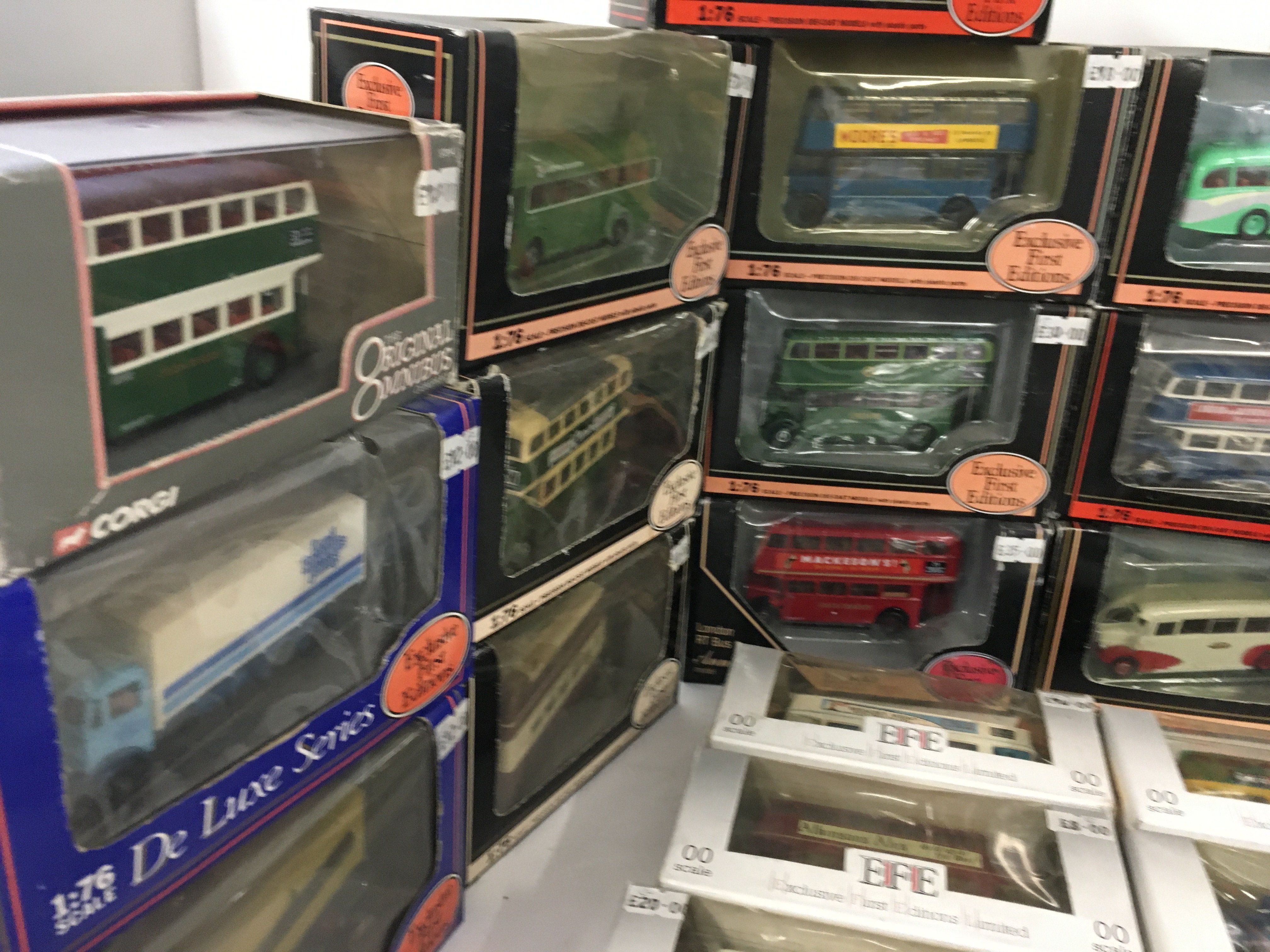 A collection in excess of 30 boxed model buses lorries and vans. Mostly EFE but also corgi and Oxford.
