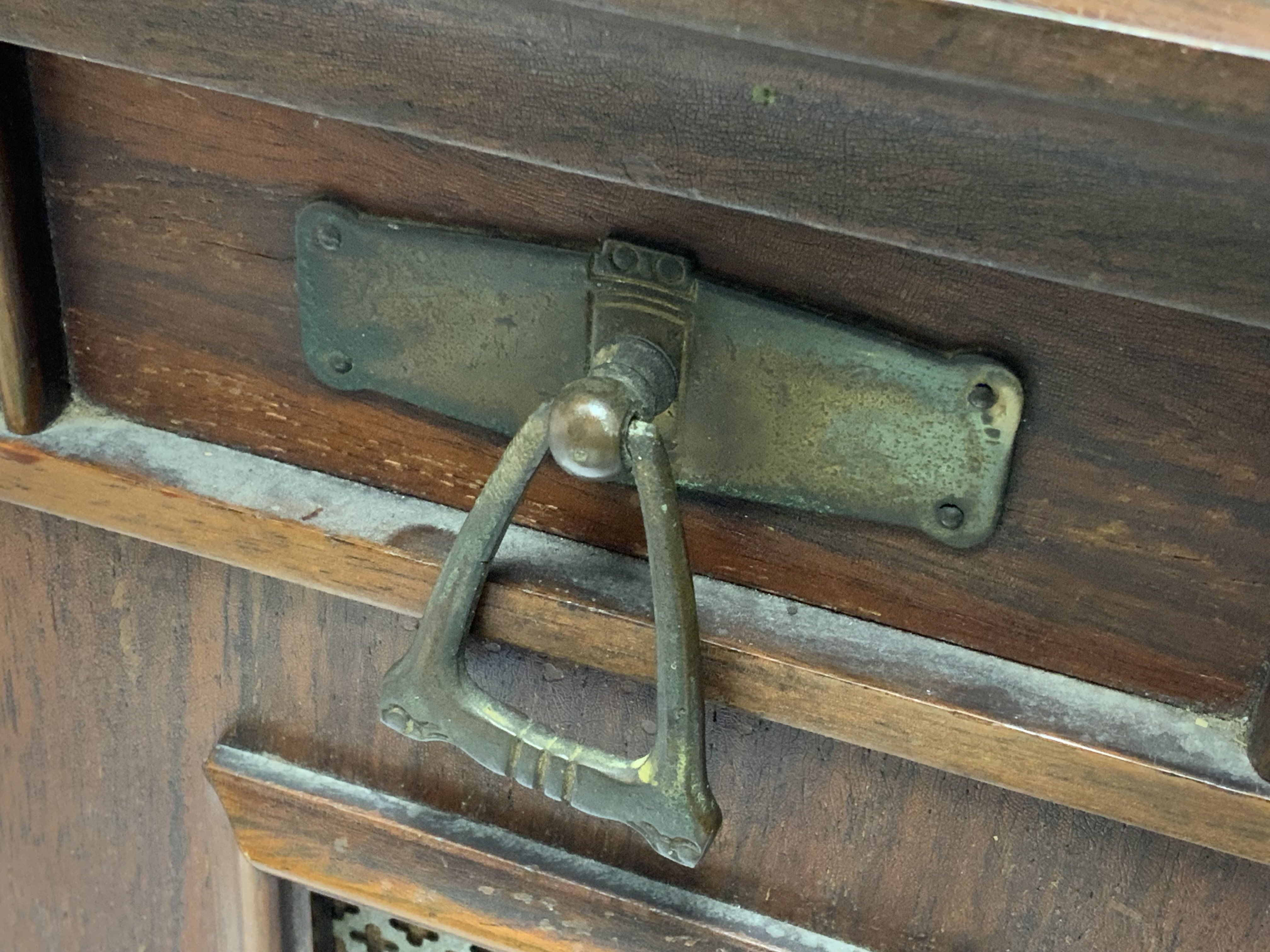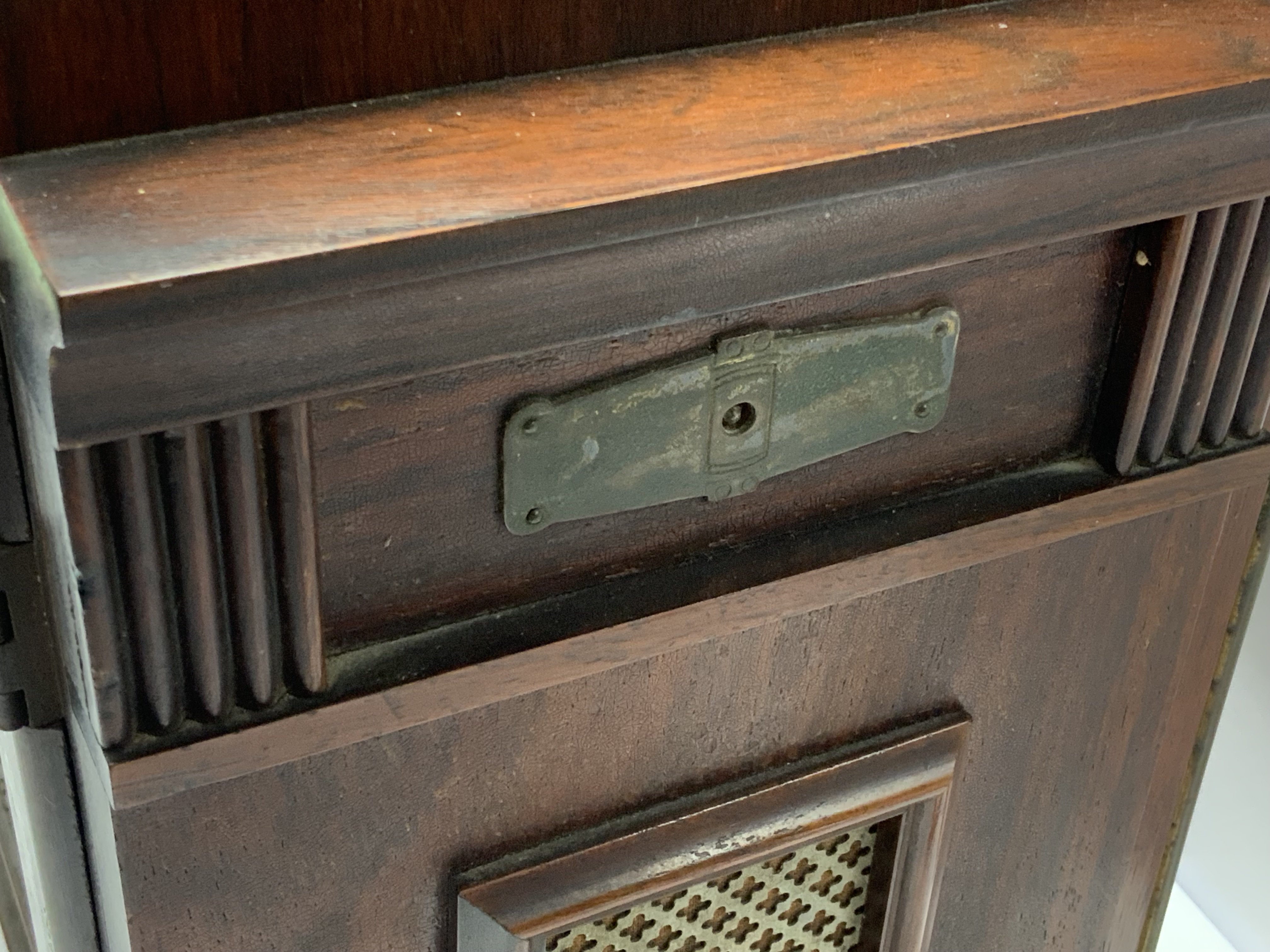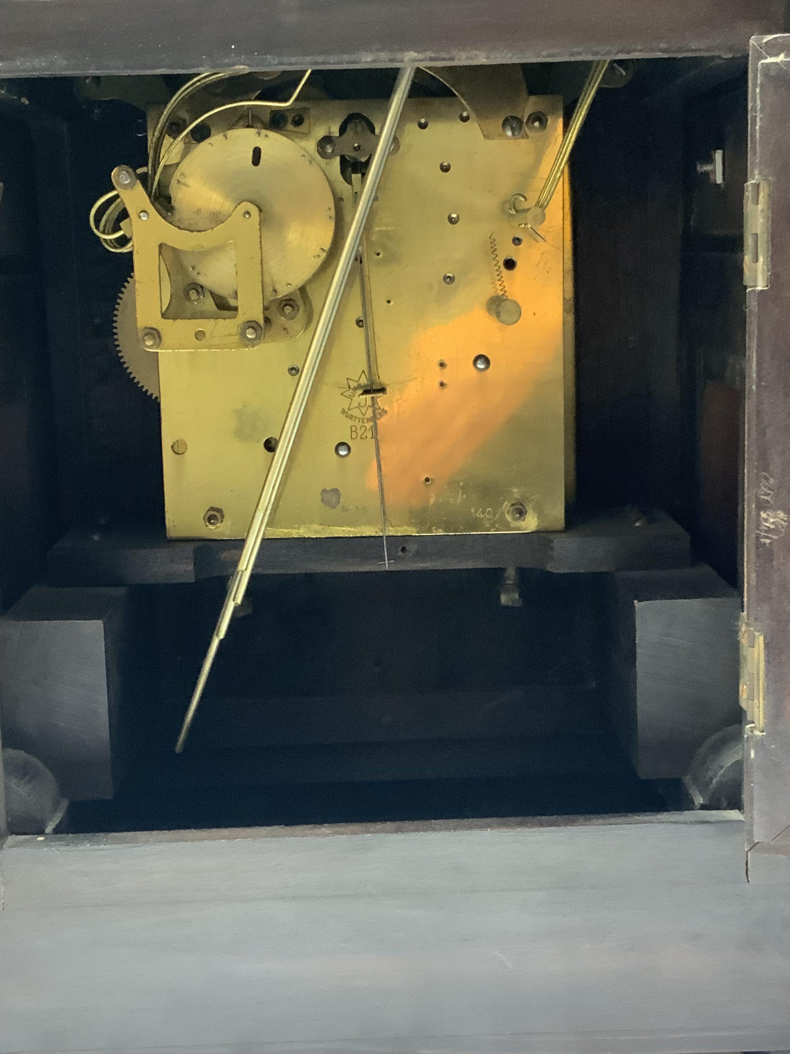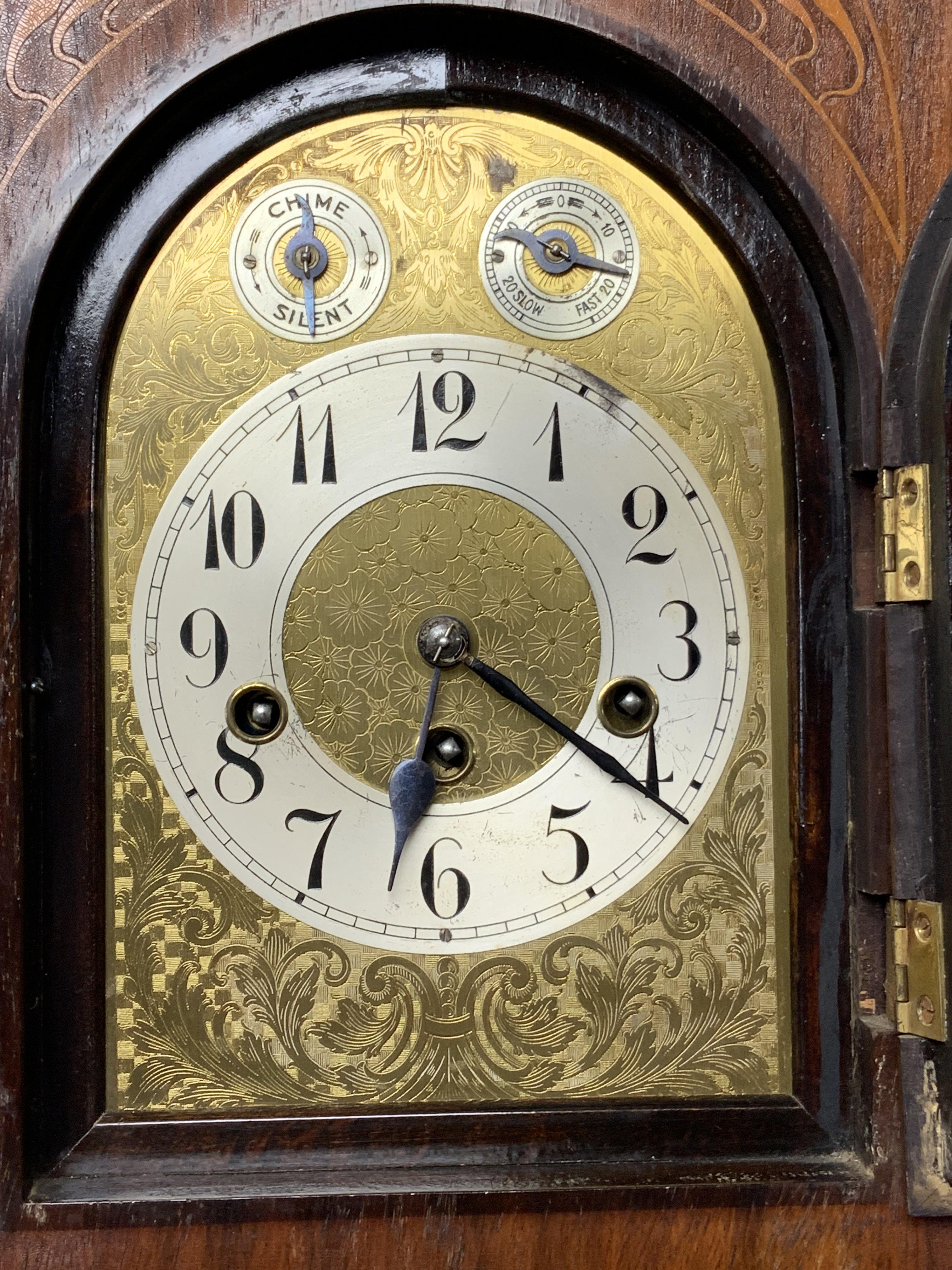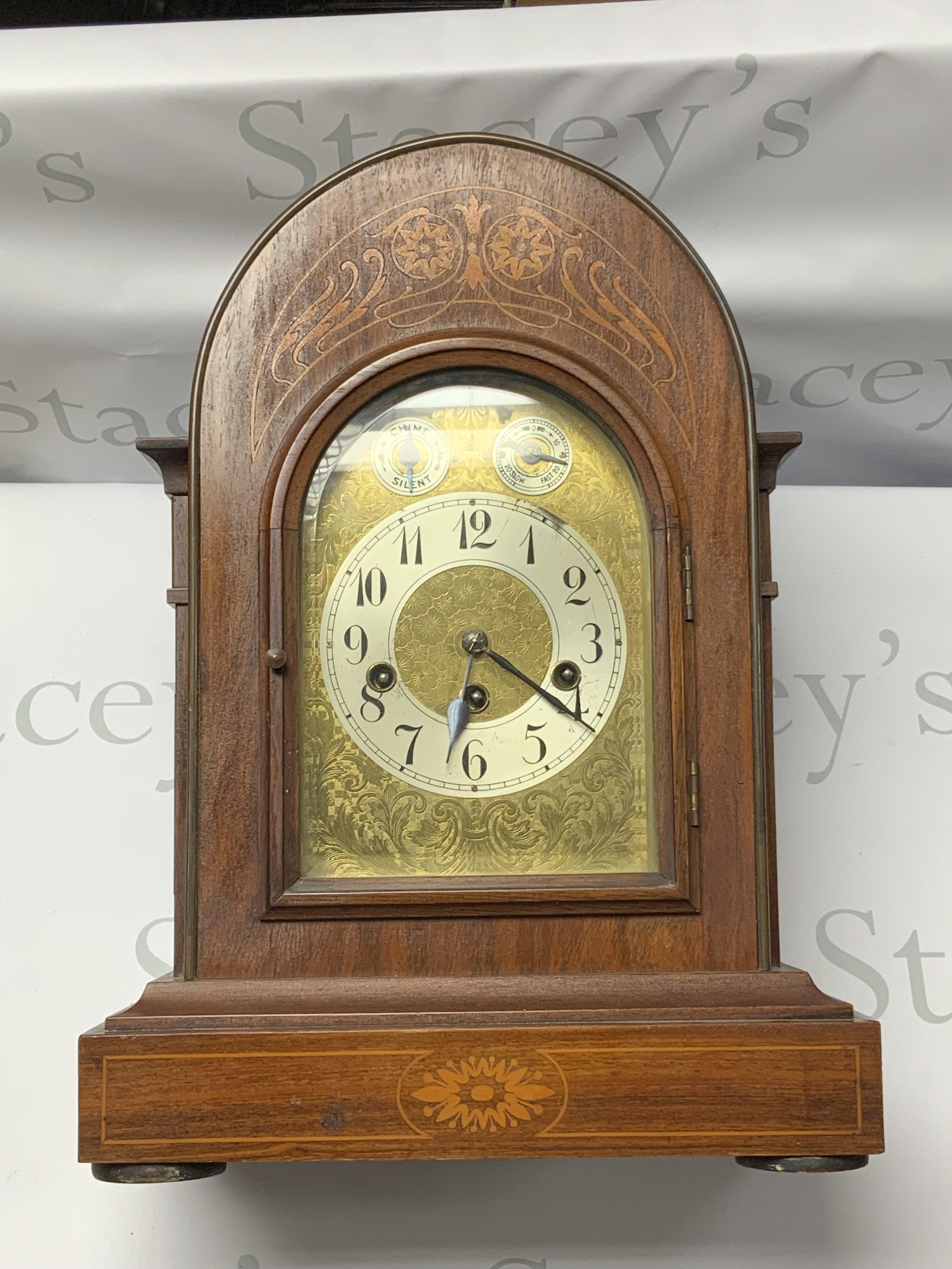 An Edwardian arched topped and inlaid chiming mantle clock. 44cm x 32cm x 21cm