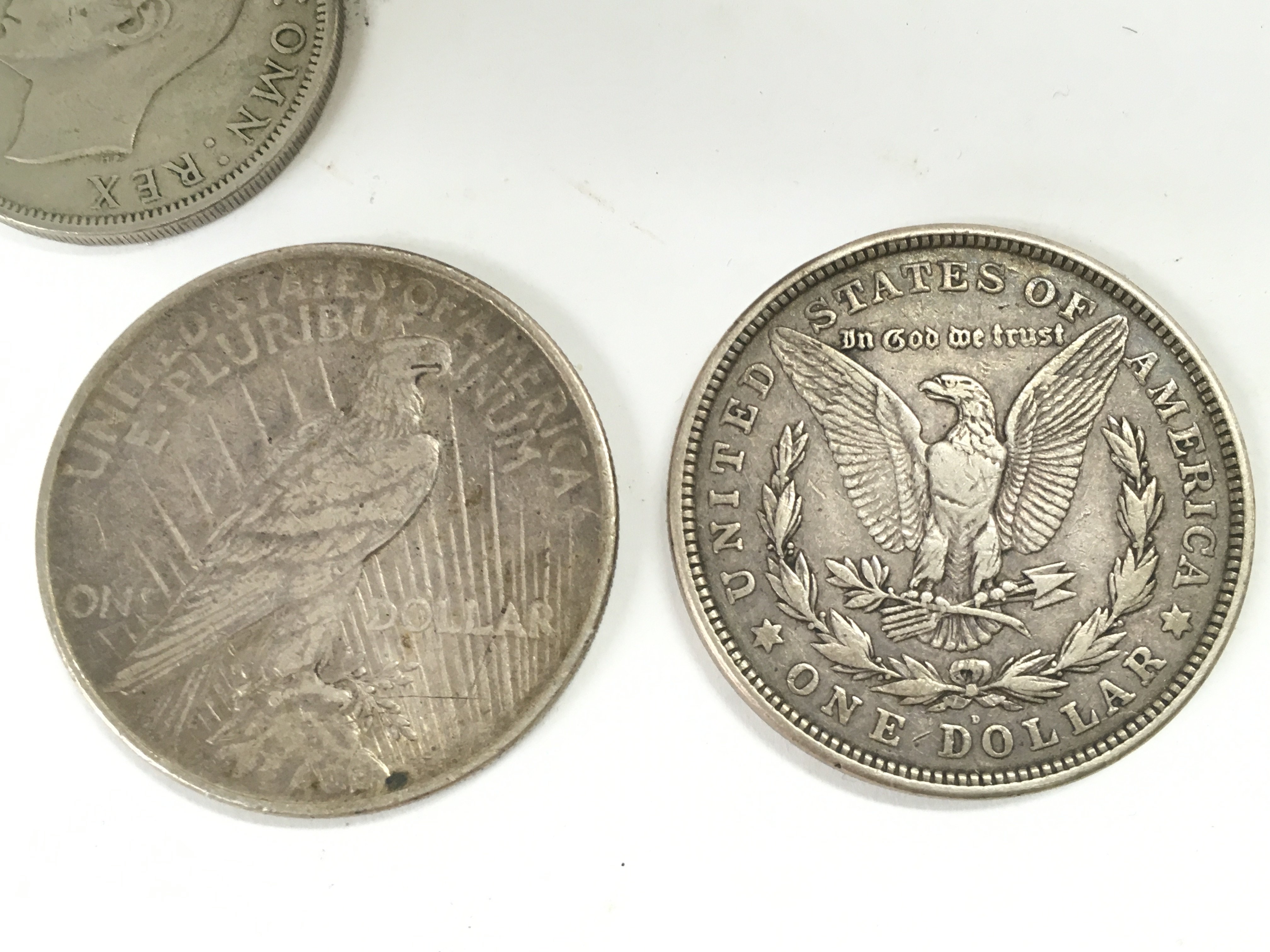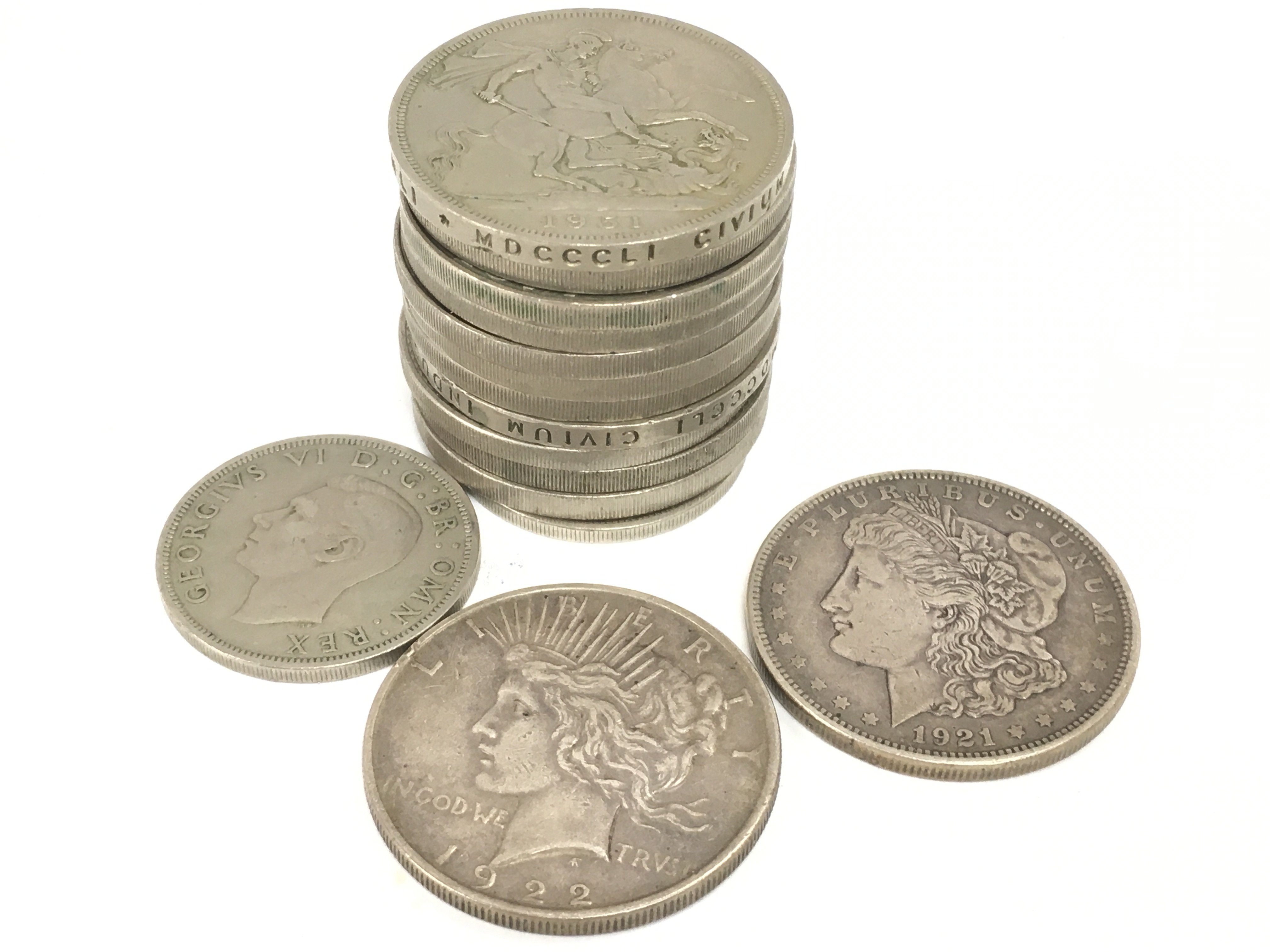 A collection of coins including two US dollars, 1921 and 1922. Postage category a