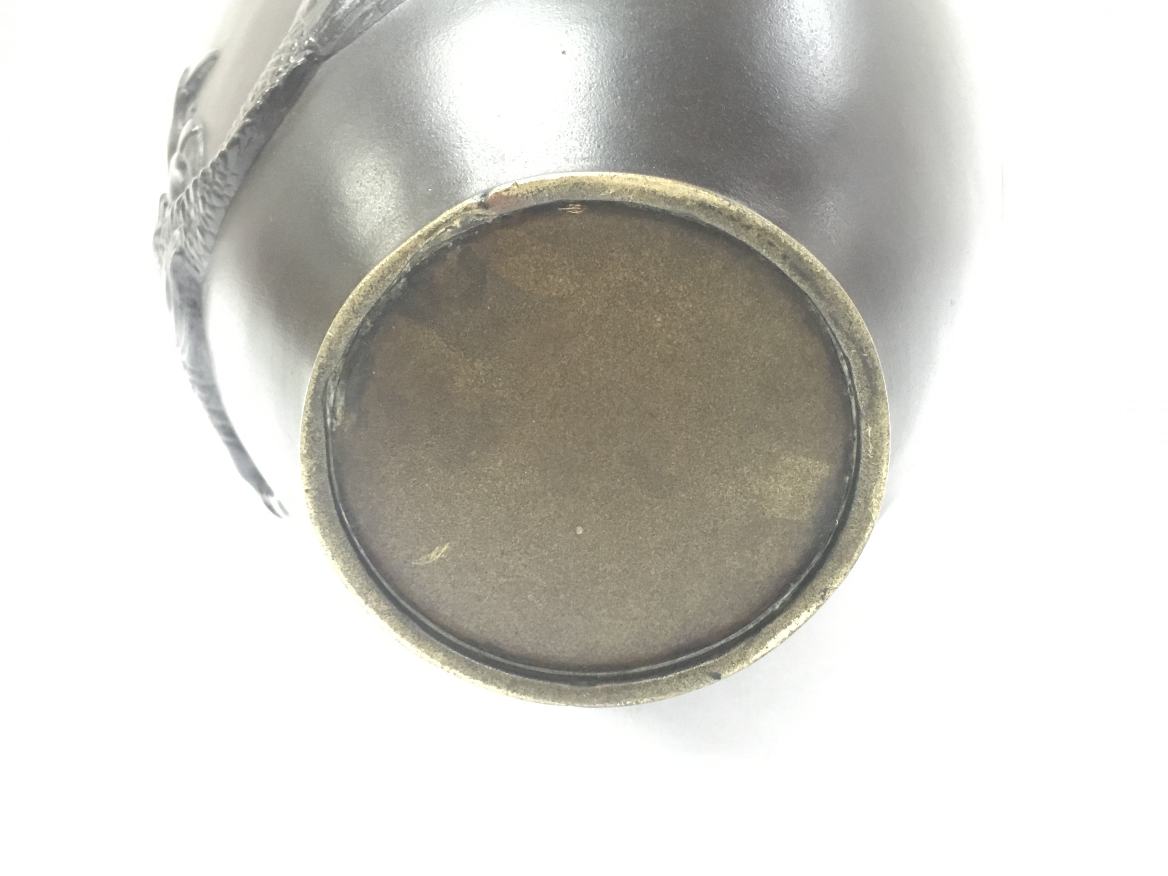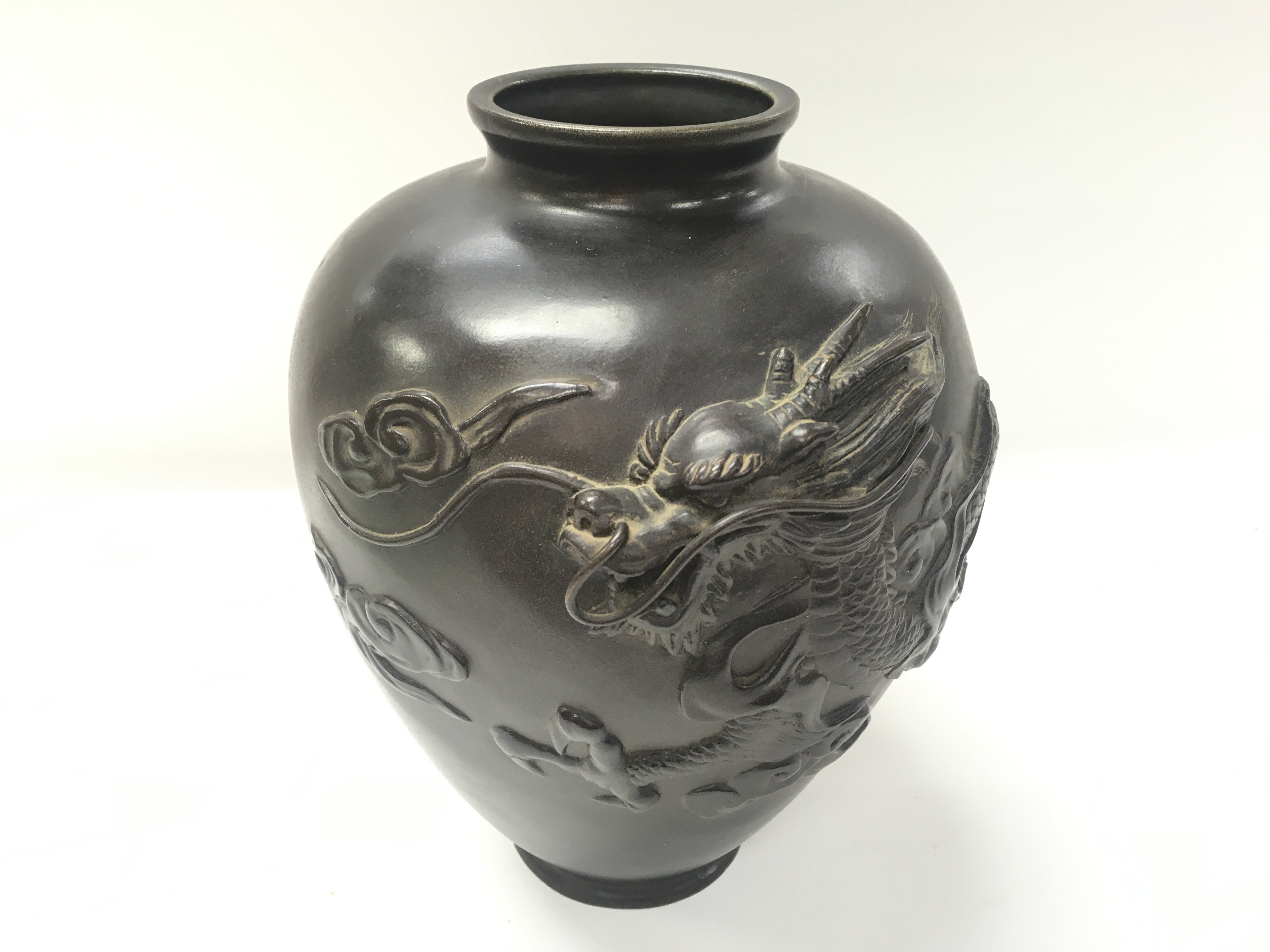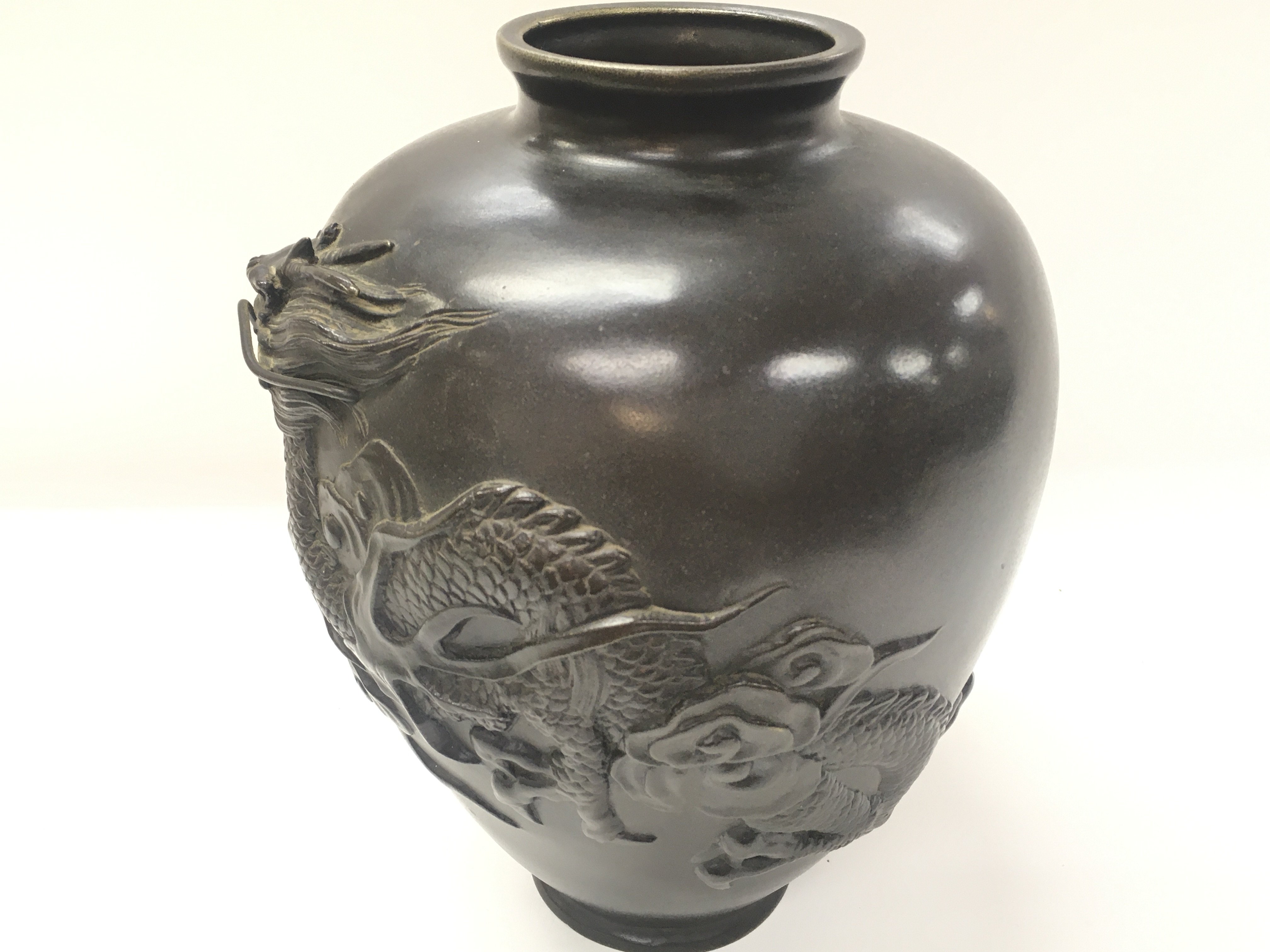 A Japanese early 20th century bronze vase featuring a raised dragon. Approximately 23cm high and 19cm wide.