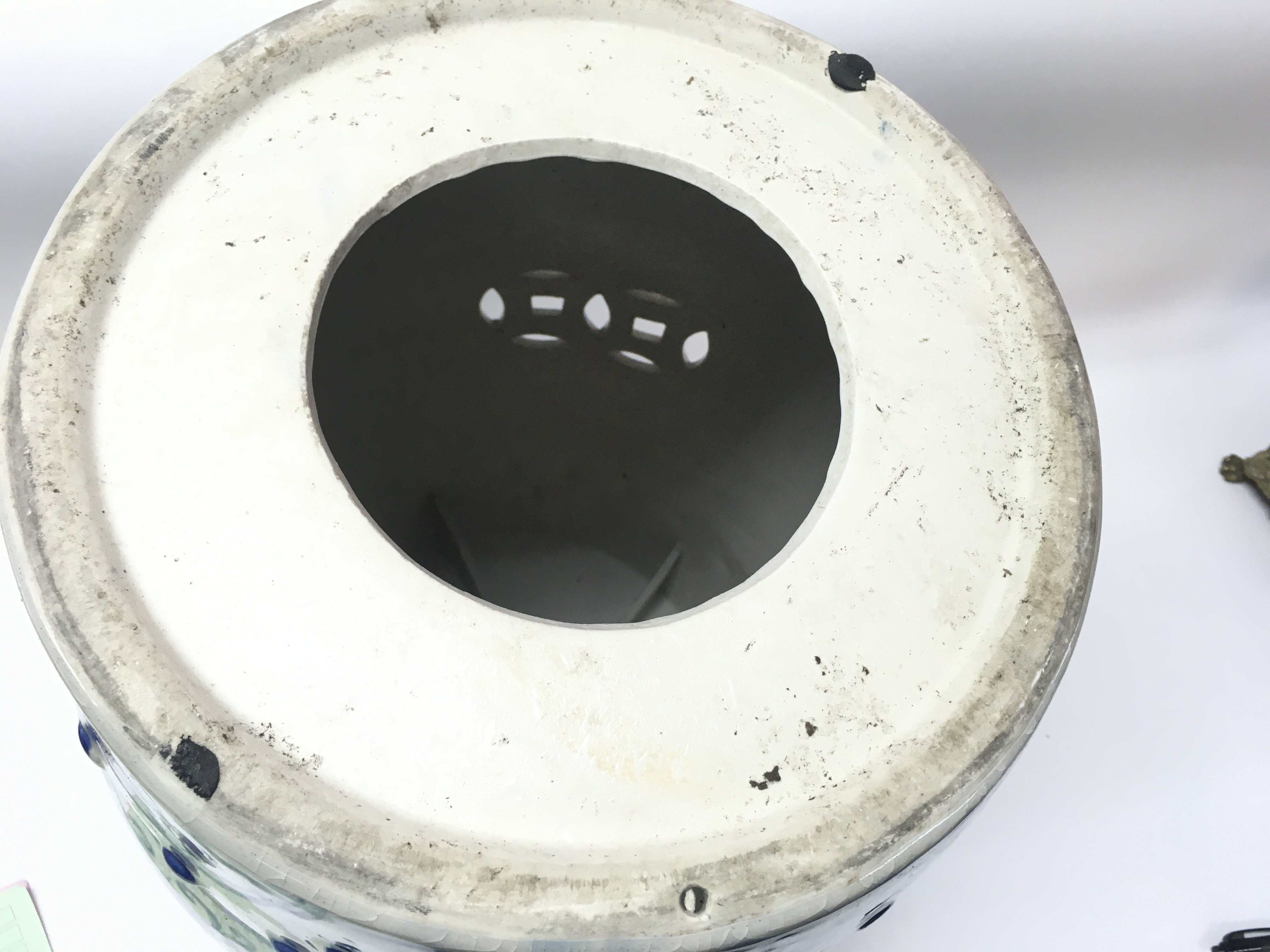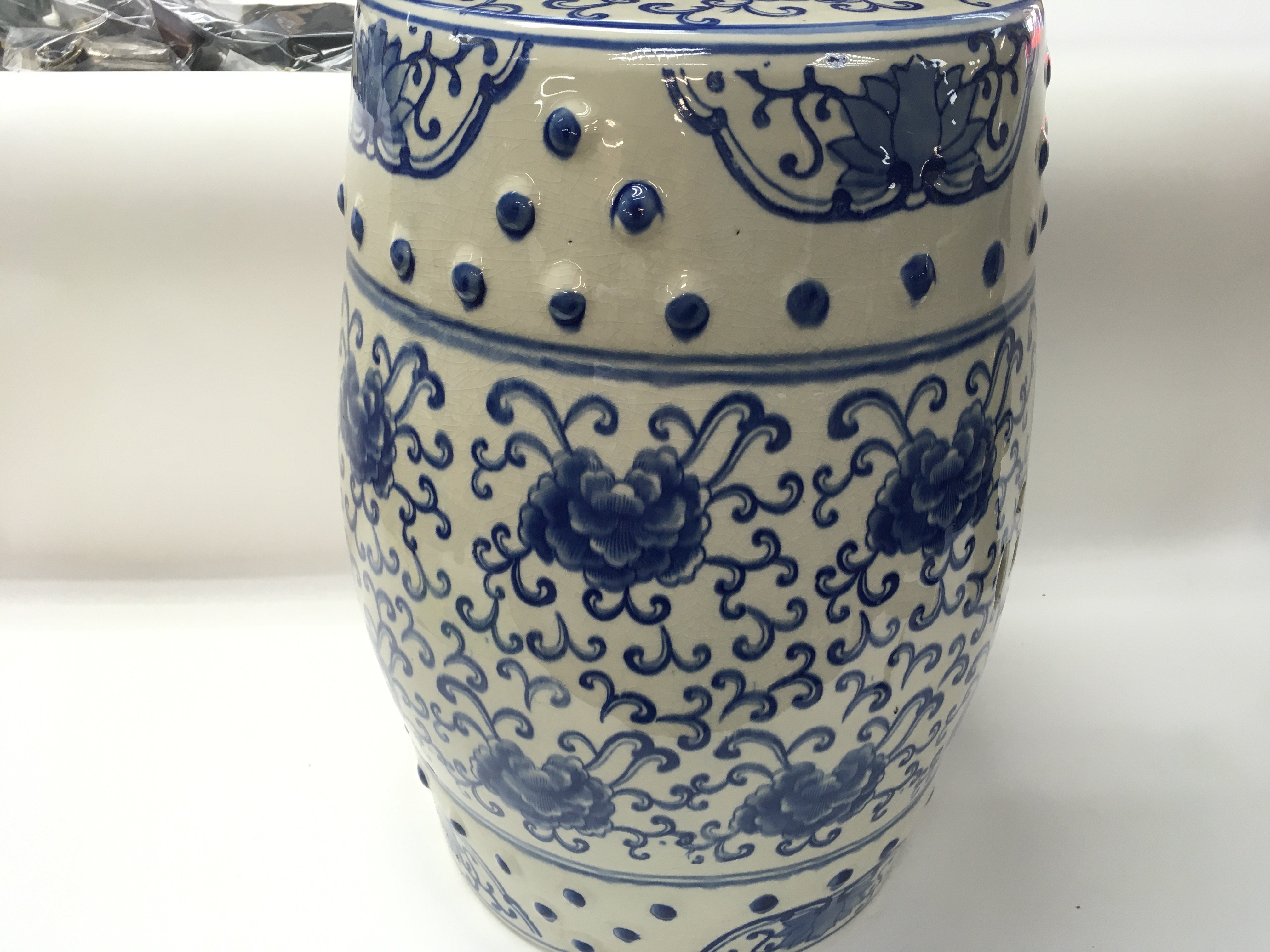A Chinese blue and white garden seat. 45cm tall by 34cm wide approximately. Postage D. NO RESERVE