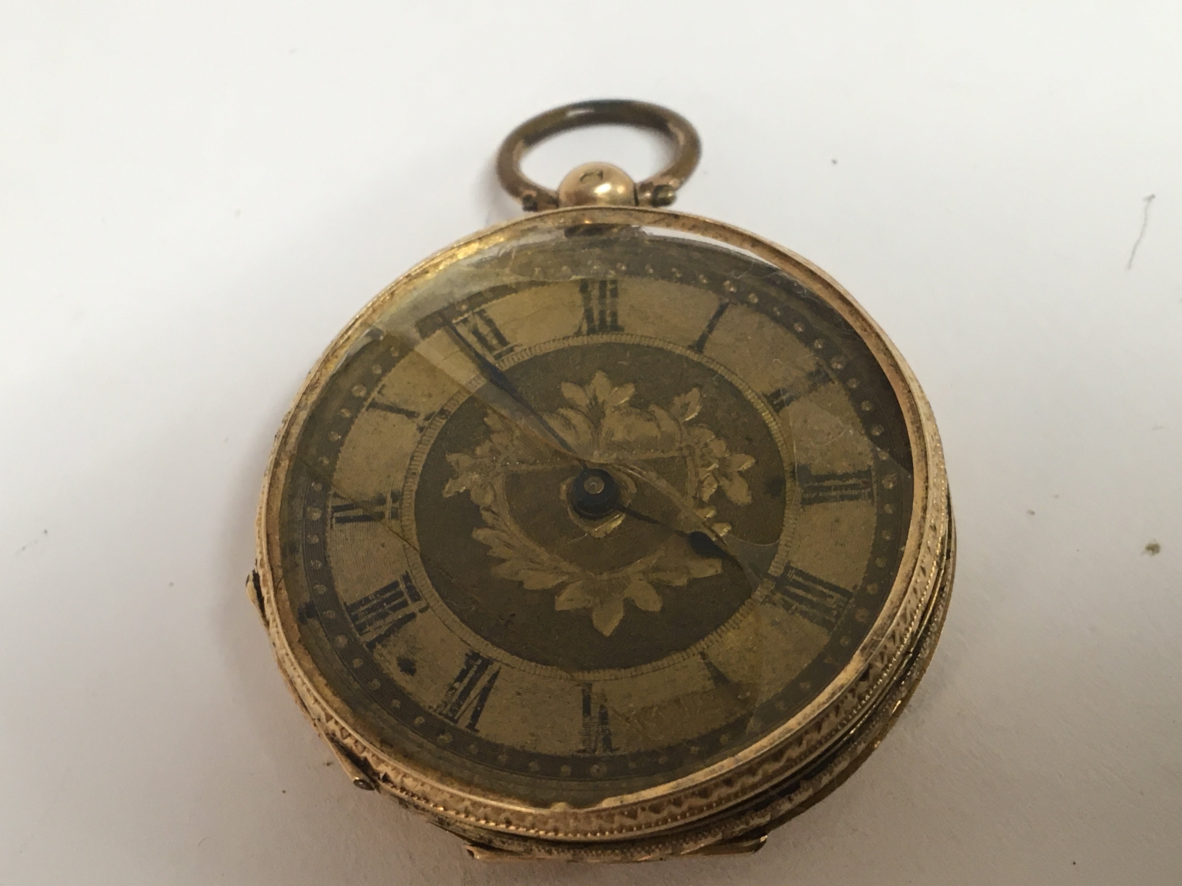 An 18carat gold key wind pocket watch open face damaged and not seen working spare or repair.