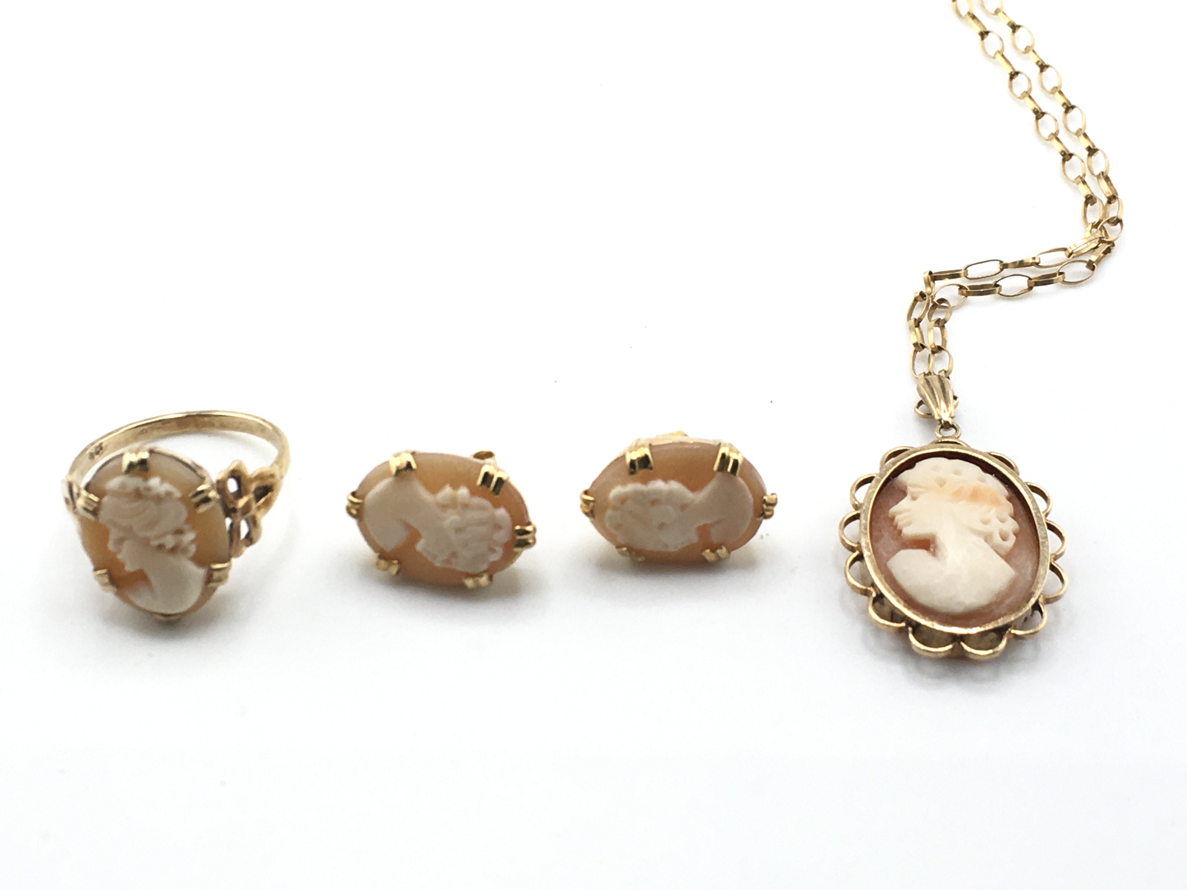 A 9ct gold cameo jewellery suite. 10.9g. Ring is size O 1/2 Postage B