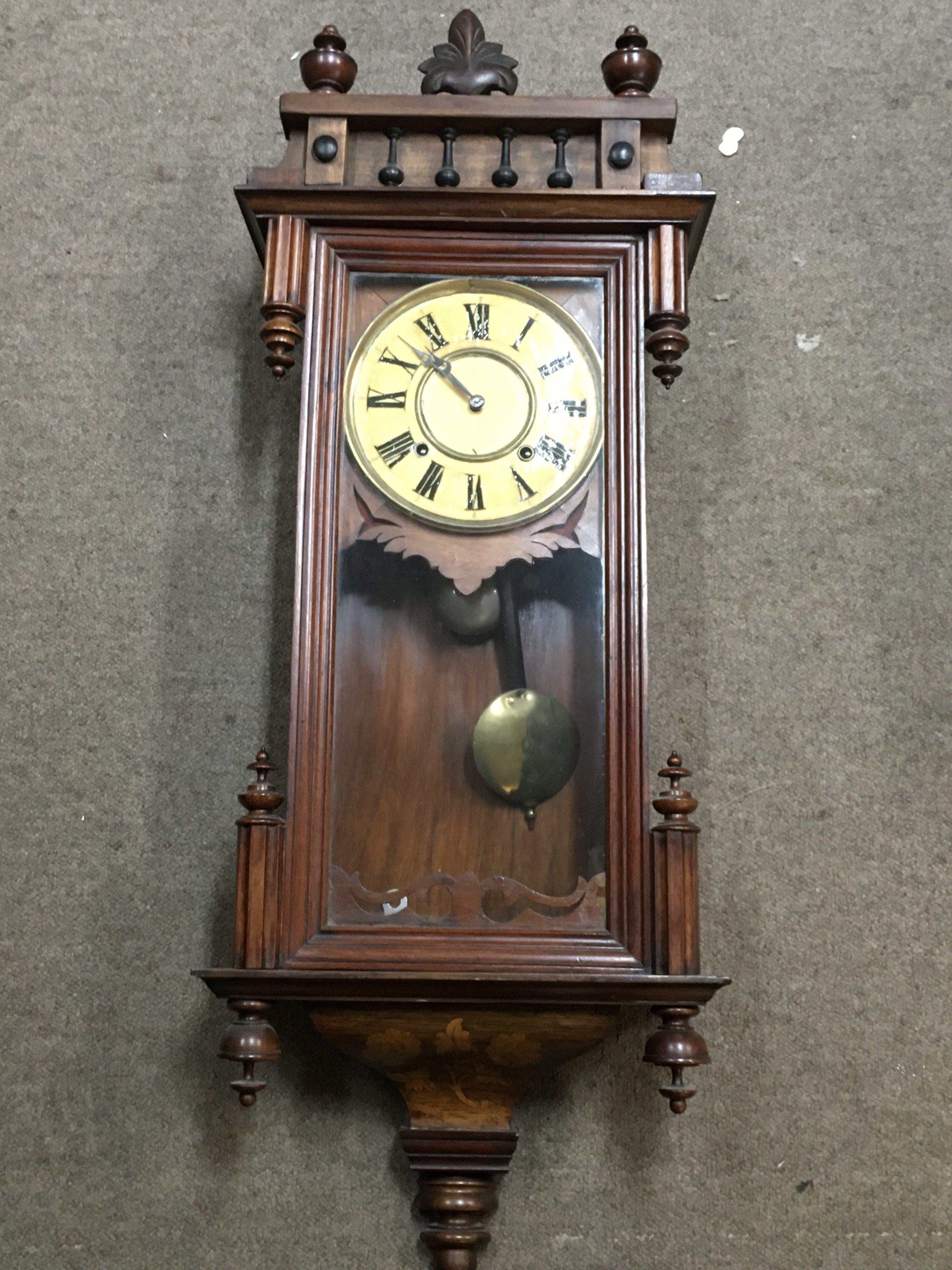 A Continental wall clock with inlaid and carved wood design. Dimensions approximately 16x38x100cm. NO RESERVE