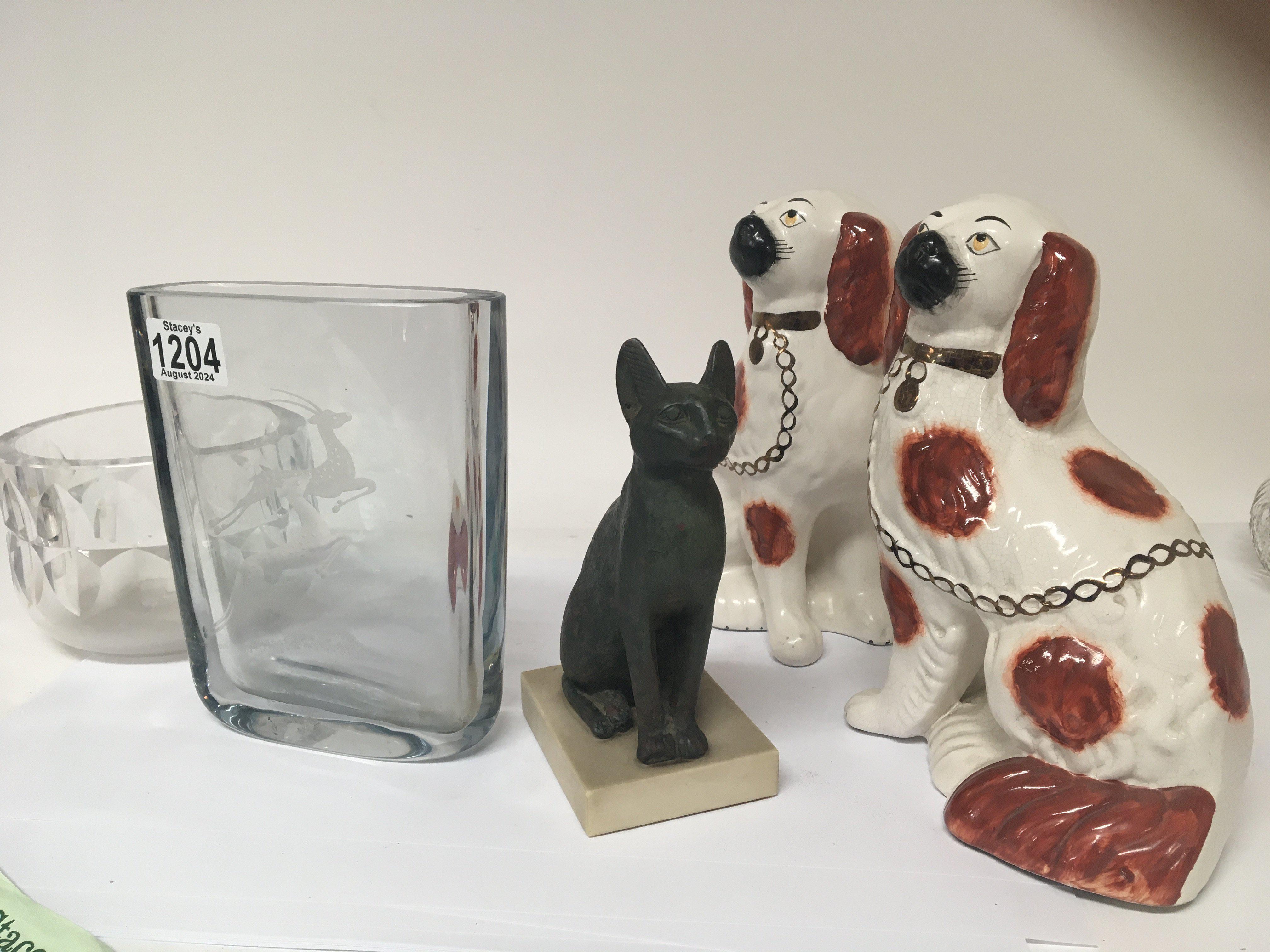 A signed modern design art glass vase with leaping Gazelles signed base a signed cut glass bowl a pair of Staffordshire dogs and an Egyptian influence figure of a Sphinx. NO RESERVE