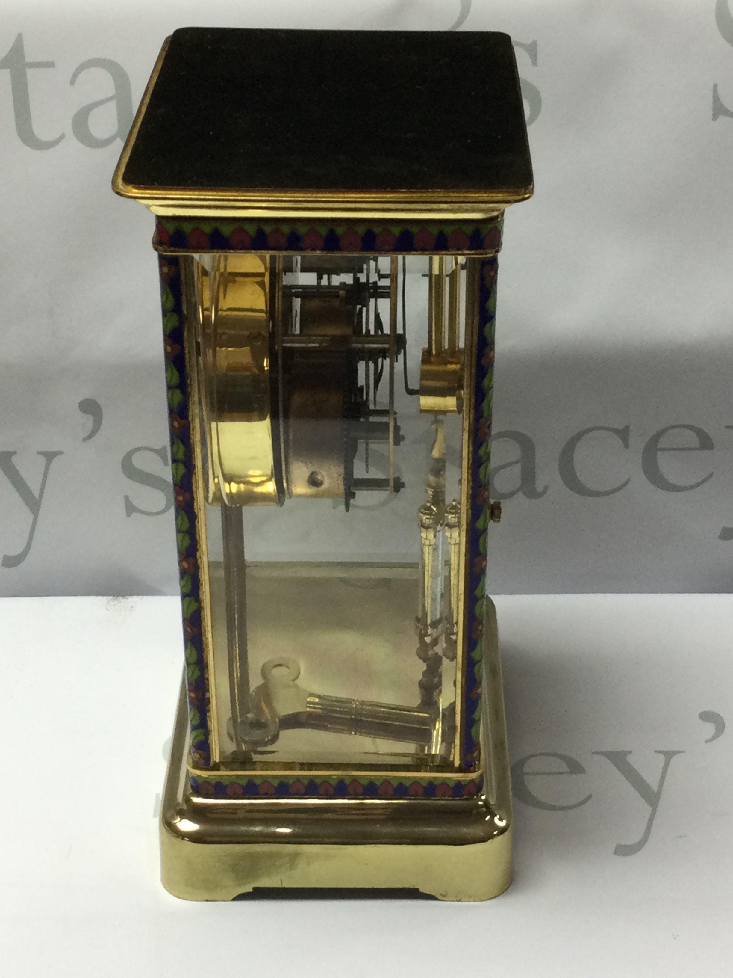 A good quality brass and cloisonné 4 glass clock with mercury pendulum, 29.5cm x 17.5cm x 13.5cm. (D, postage no offered for this lot).