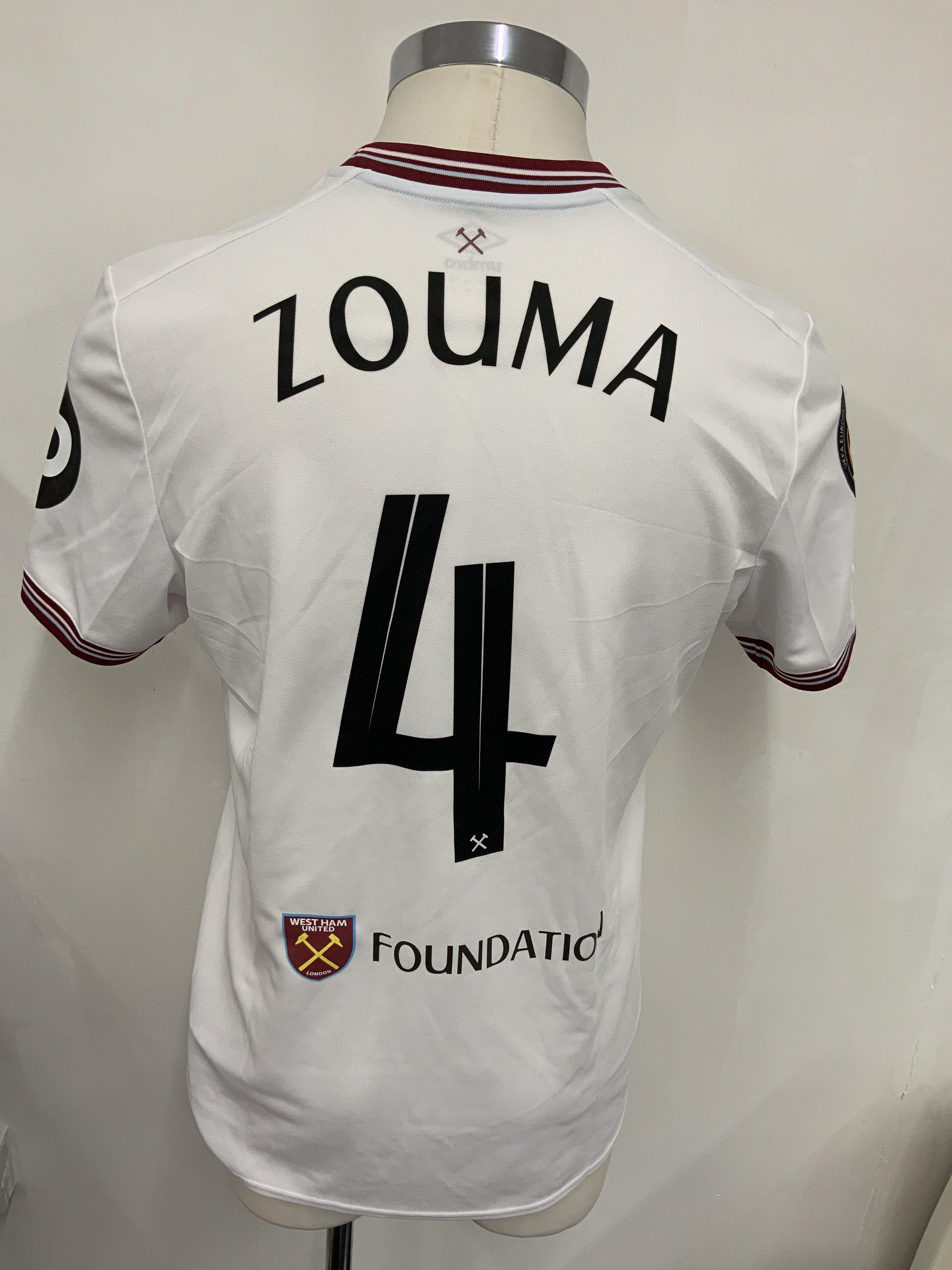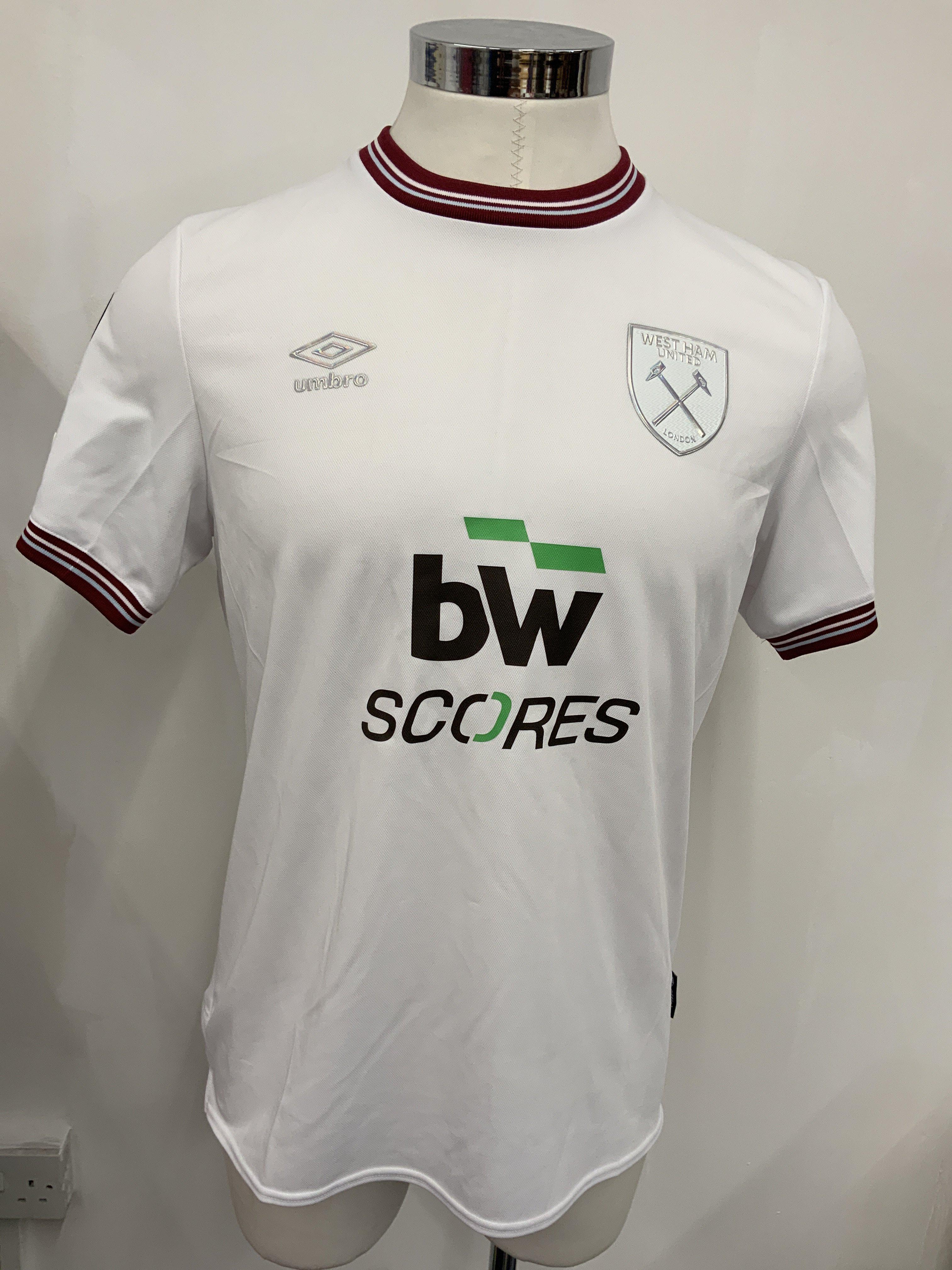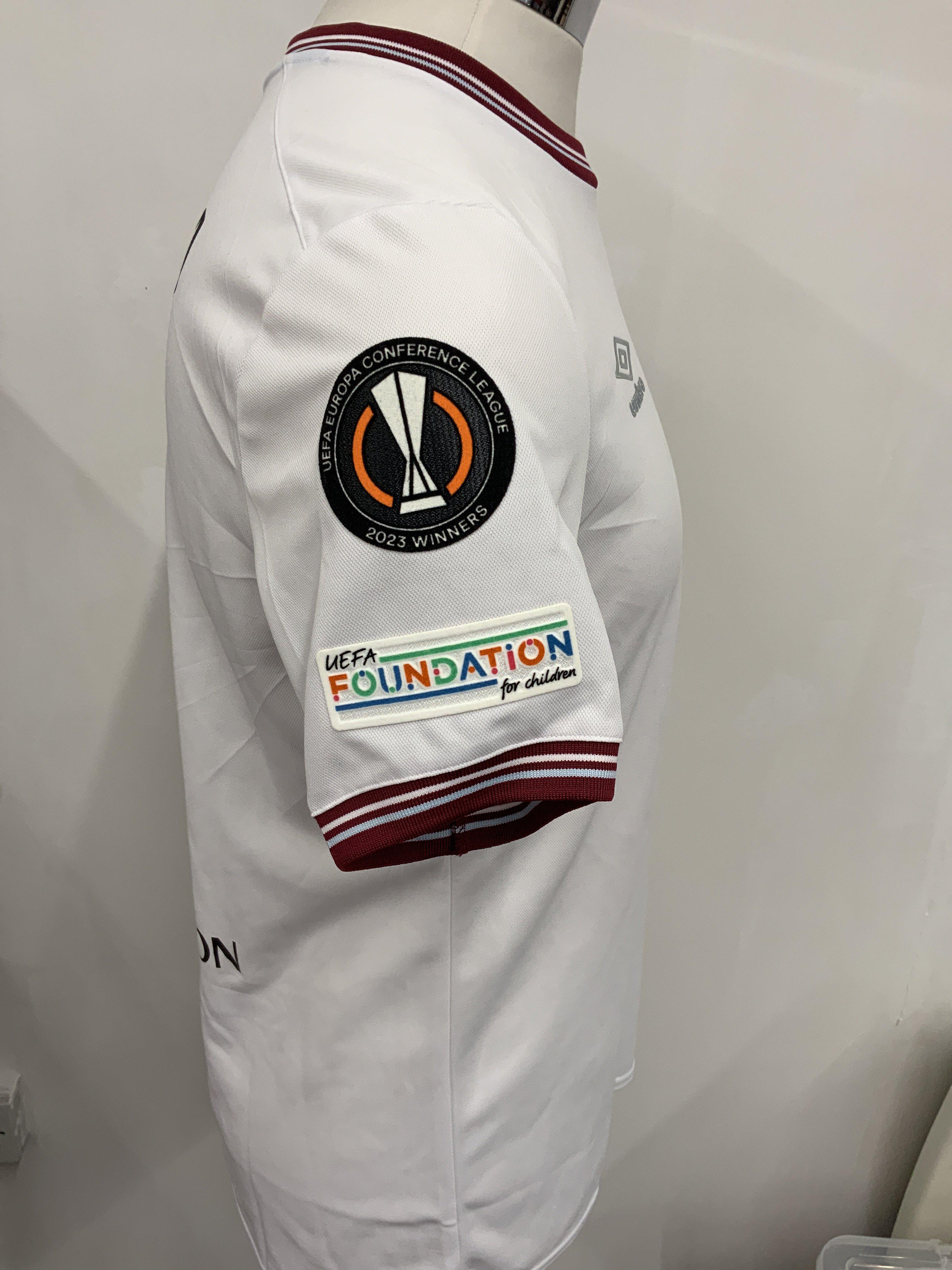 West Ham 23/24 Match Issued Europa League Football Shirt: White short sleeve with rare BW Scores sponsorship and Conference League Winners 2023 badging to arm. Number 4 Zouma to rear.