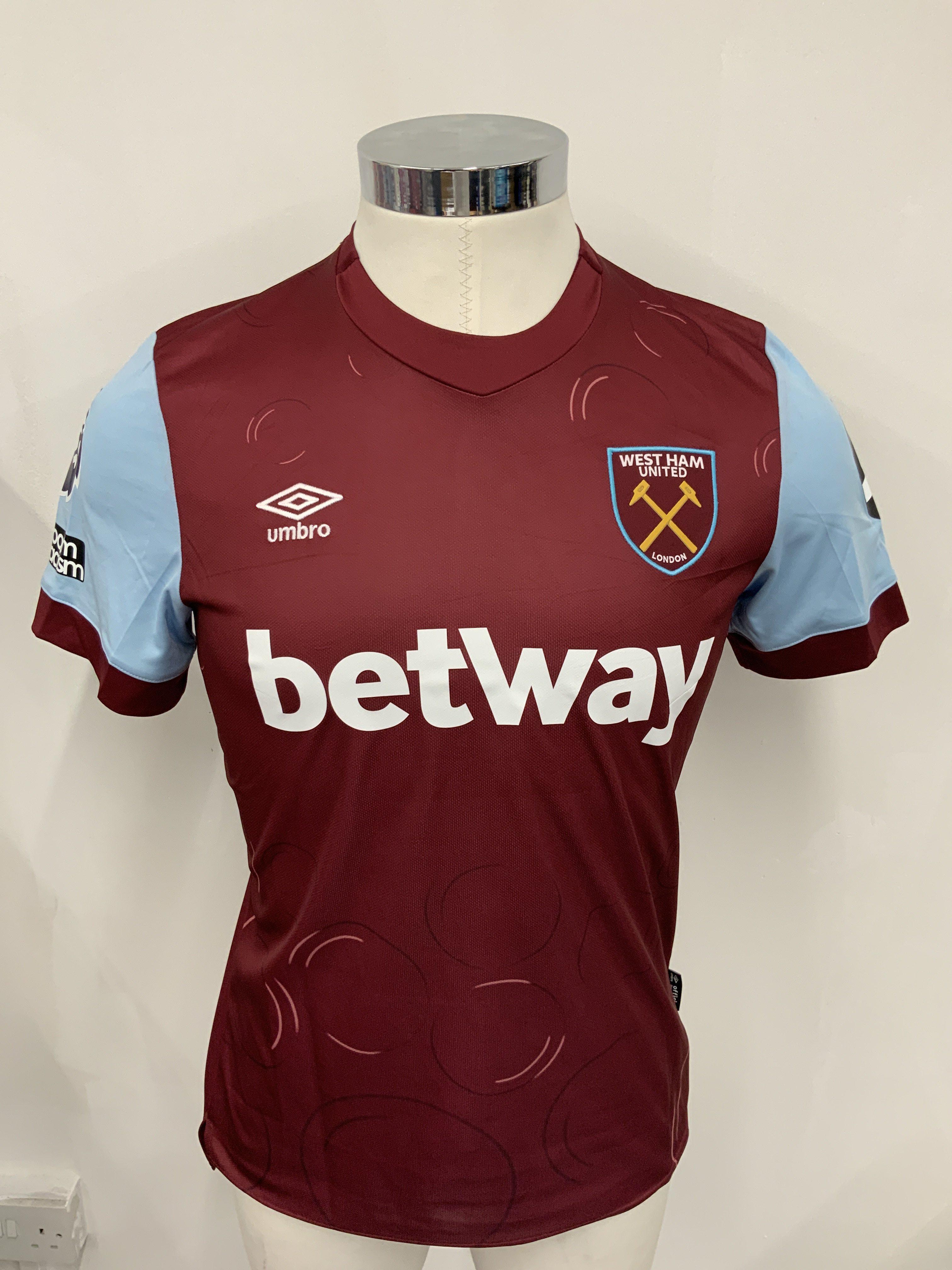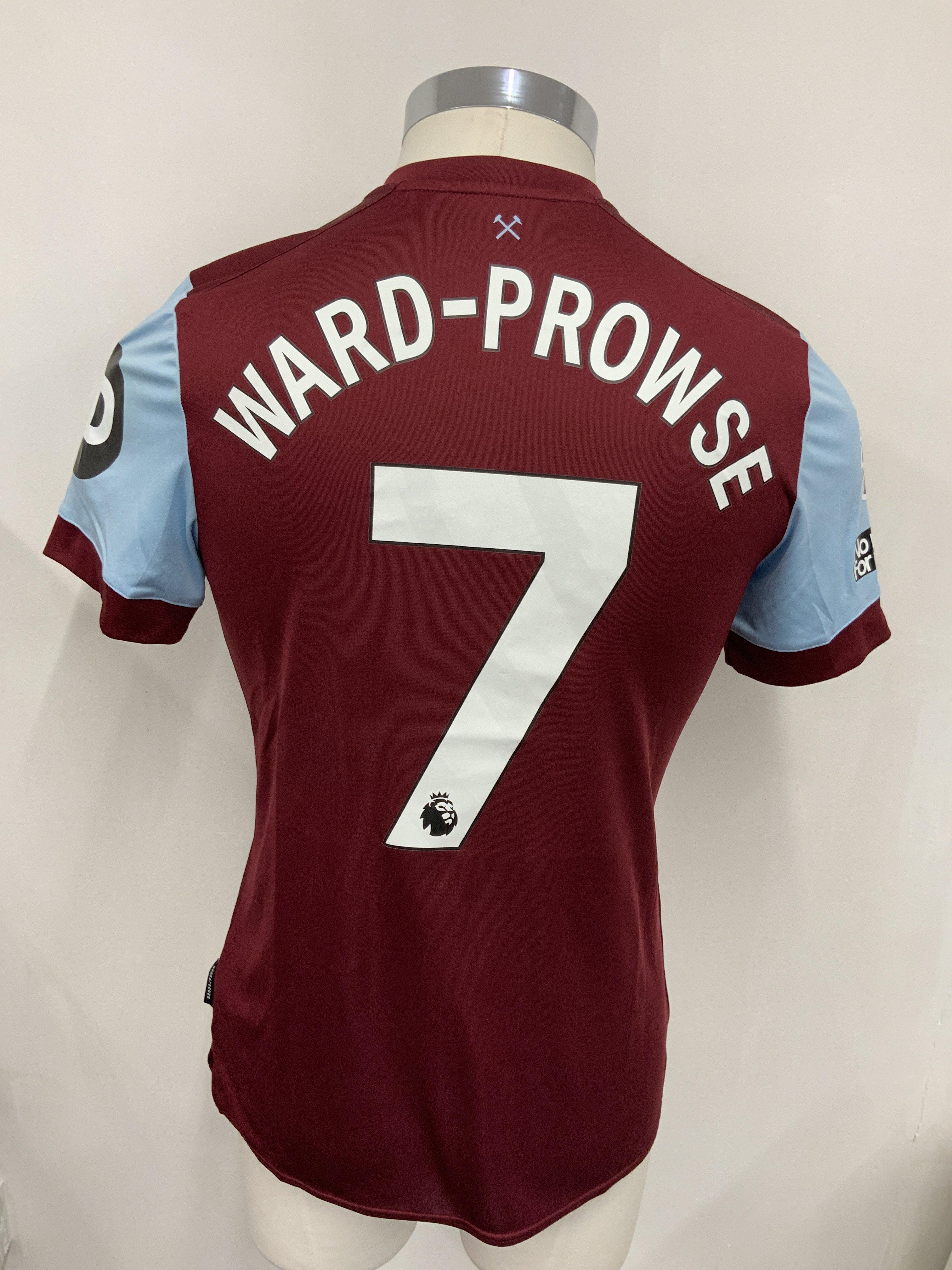 West Ham 2023 - 2024 Match Worn Football Shirt: Claret short sleeve with Premier League badging to arm. Number 7 Ward- Prowse to rear. James scored in the 3-1 victory over Luton in the last home match of the season wearing this shirt.