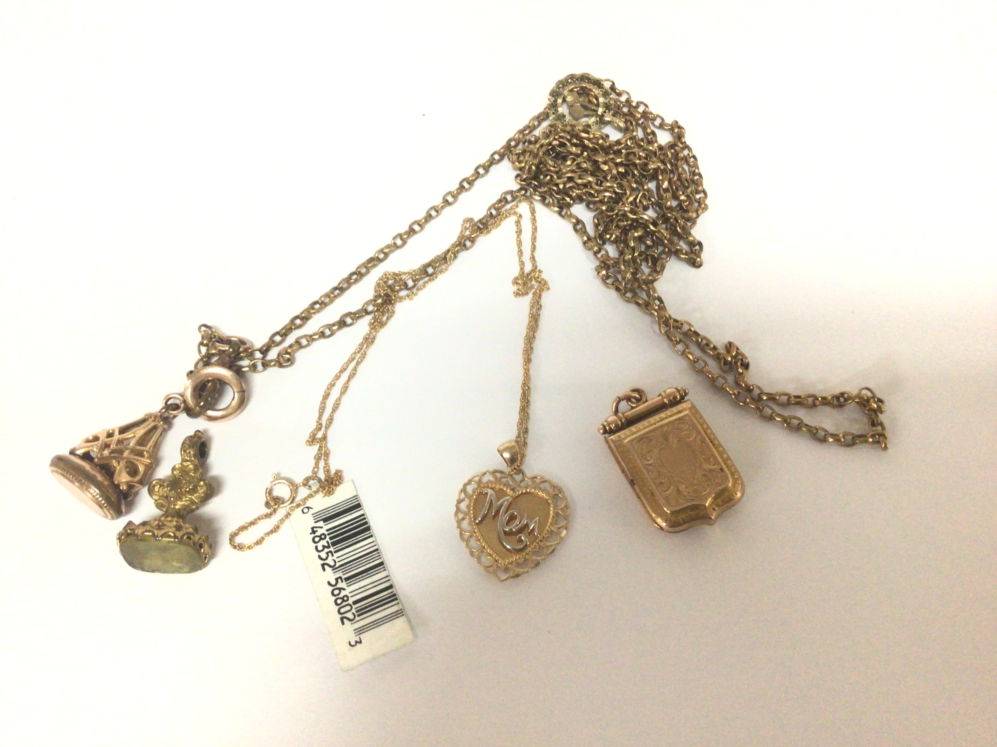 A gold plated antique long guard chain seal fobs and a modern gold heart shaped pendent with attached chain a Victorian locket and small pendent.