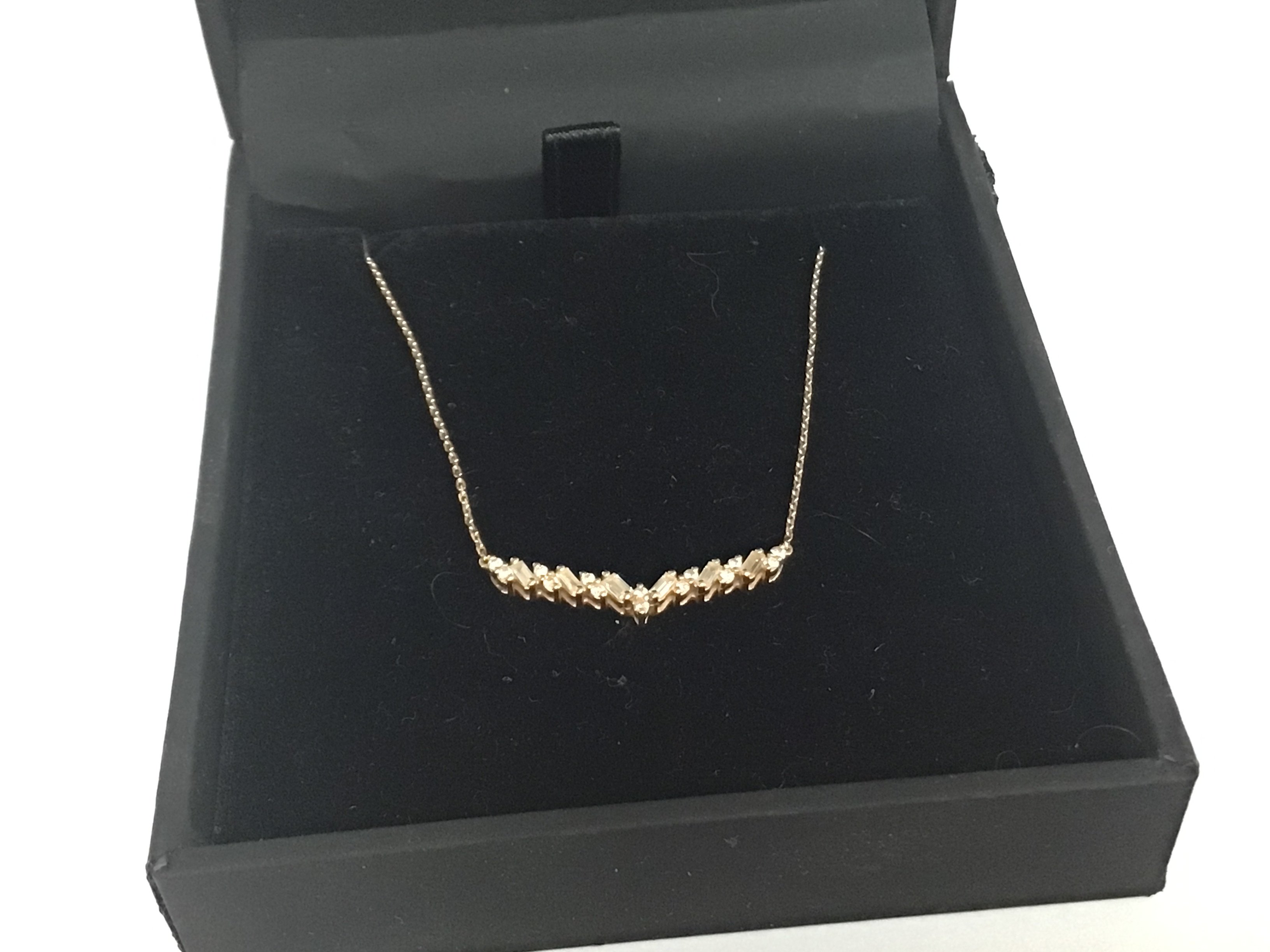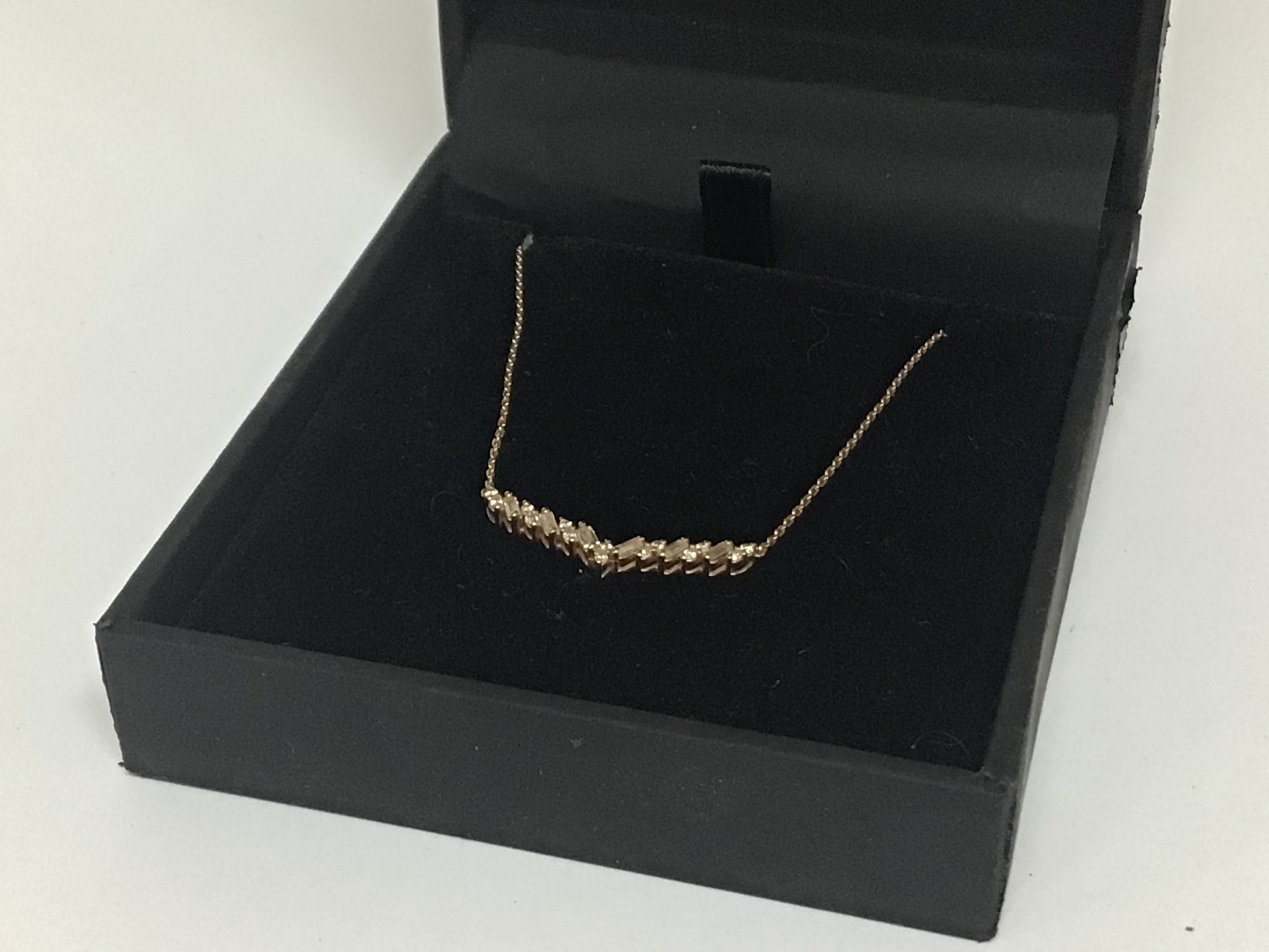 A 14carat gold (585) necklace set with a row of small baguette stones in a fitted box weight 1.5g