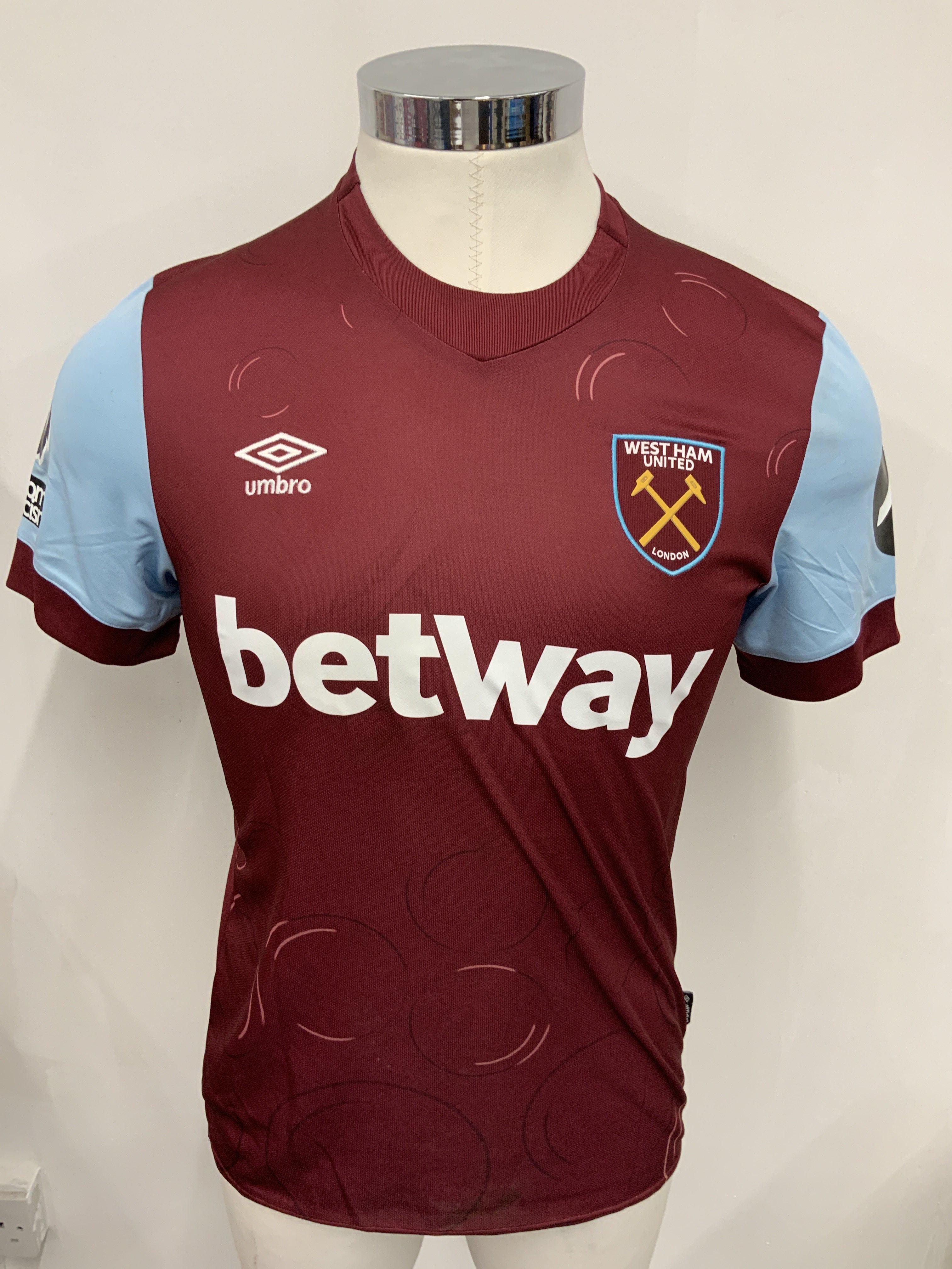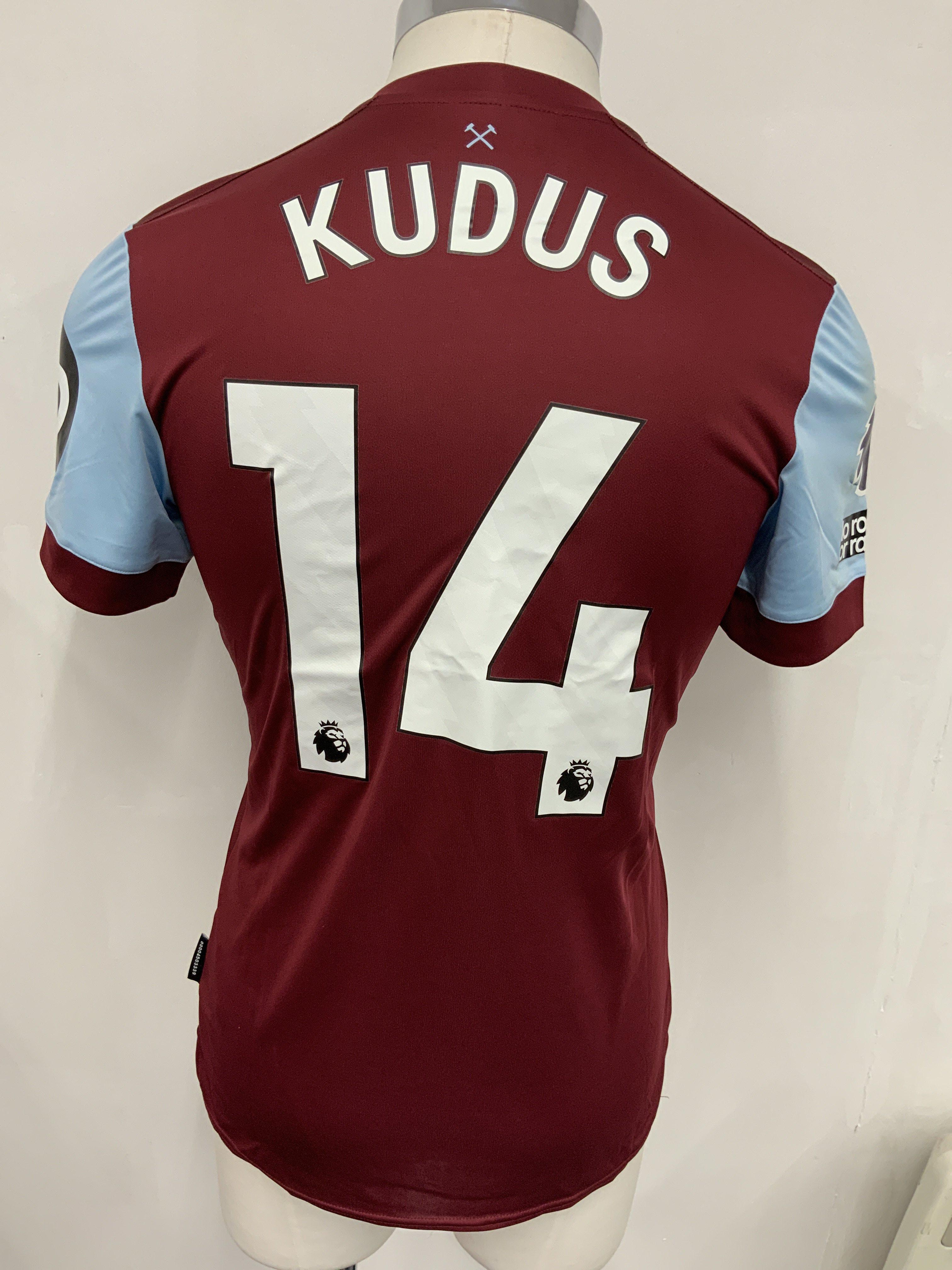 West Ham 2023 - 2024 Match Worn Football Shirt: Claret short sleeve with Premier League badging to arm. Number 14 Kudus to rear. He famously scored wearing this shirt v Newcastle and tried to borrow ball boys stool for celebration. Unwashed.