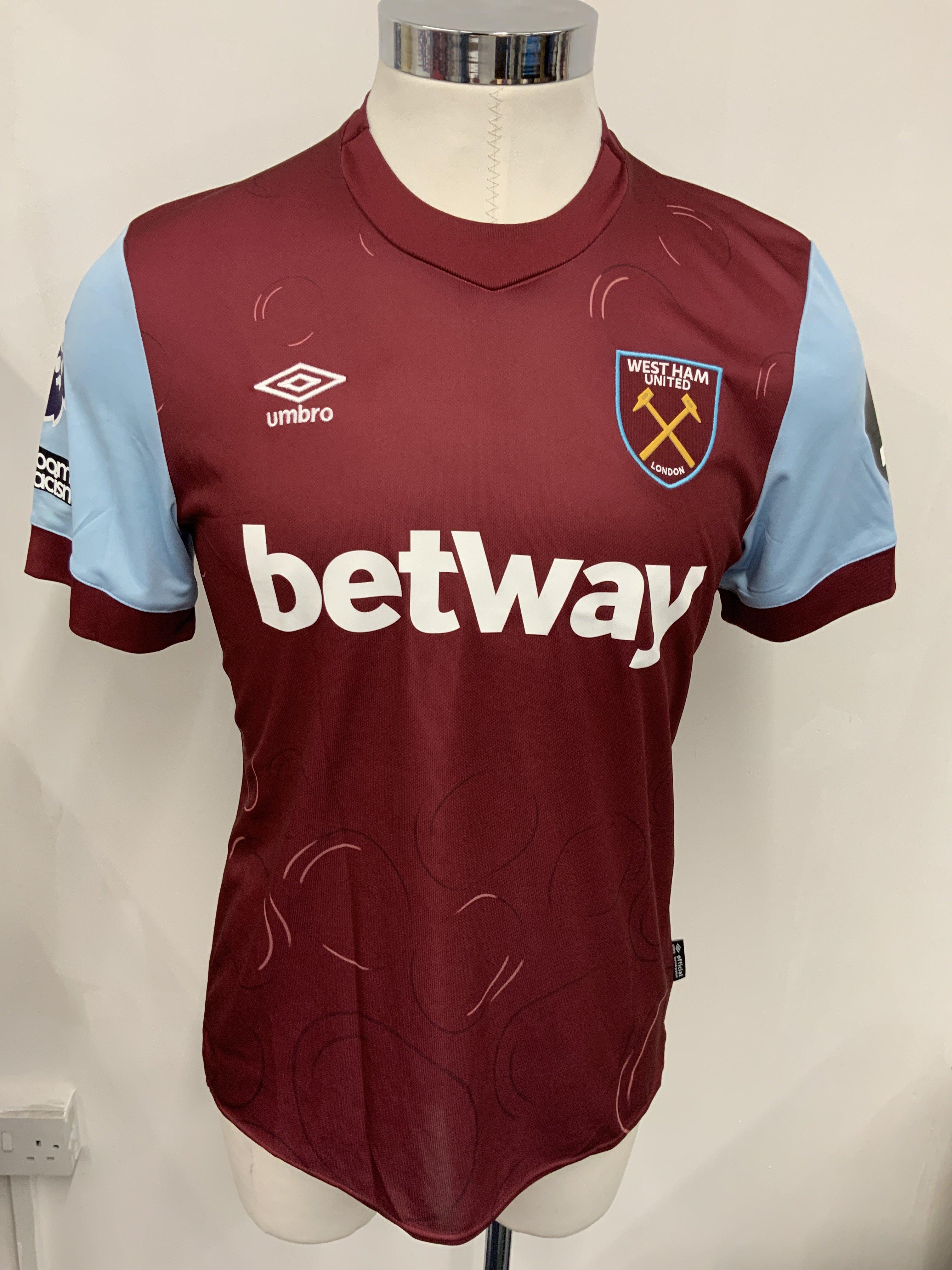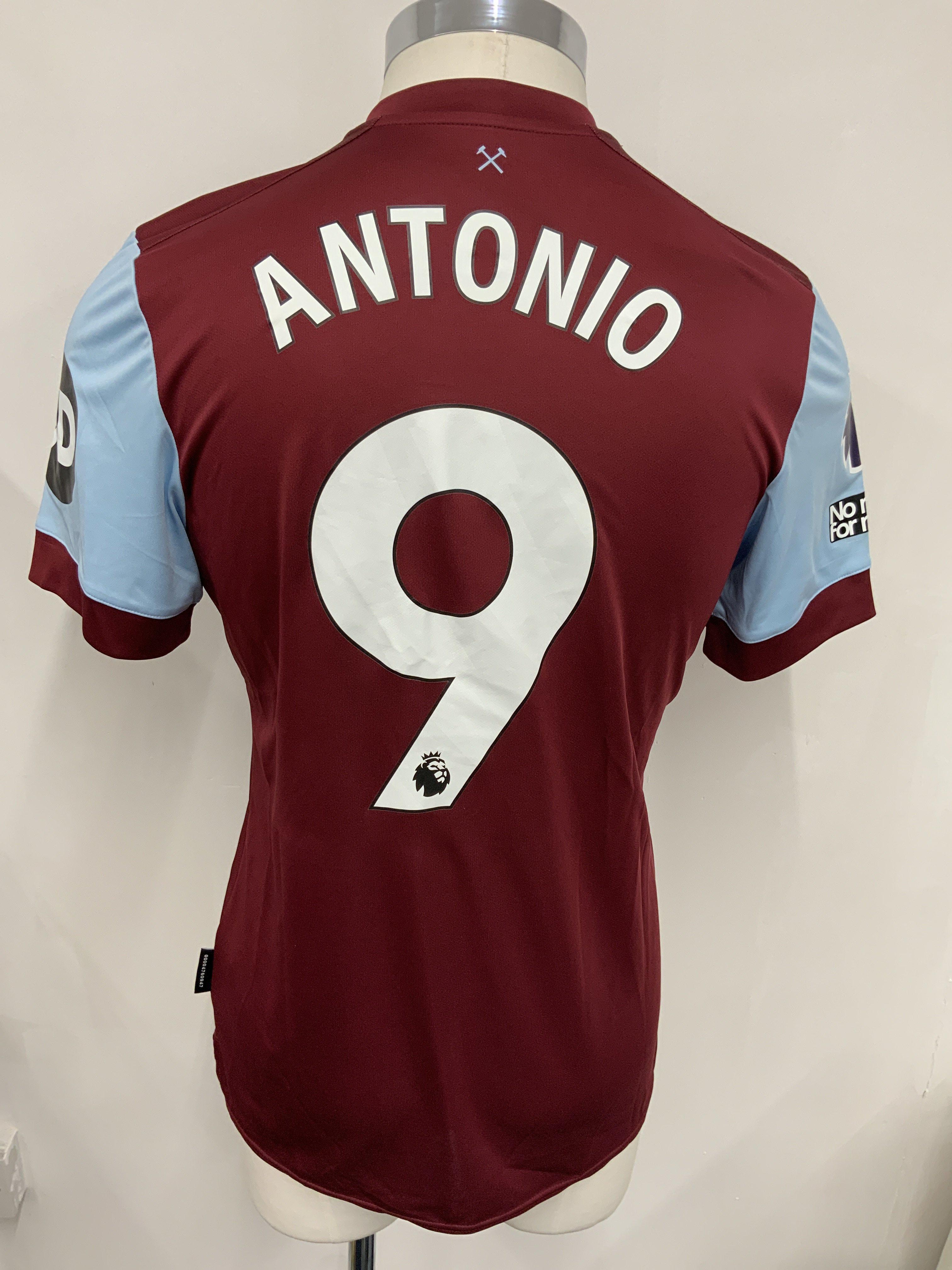 West Ham 2023 - 2024 Match Worn Football Shirt: Claret short sleeve with Premier League badging to arm. Number 9 Antonio to rear. Michail wore this in the last match of the season at Manchester City. Unwashed.