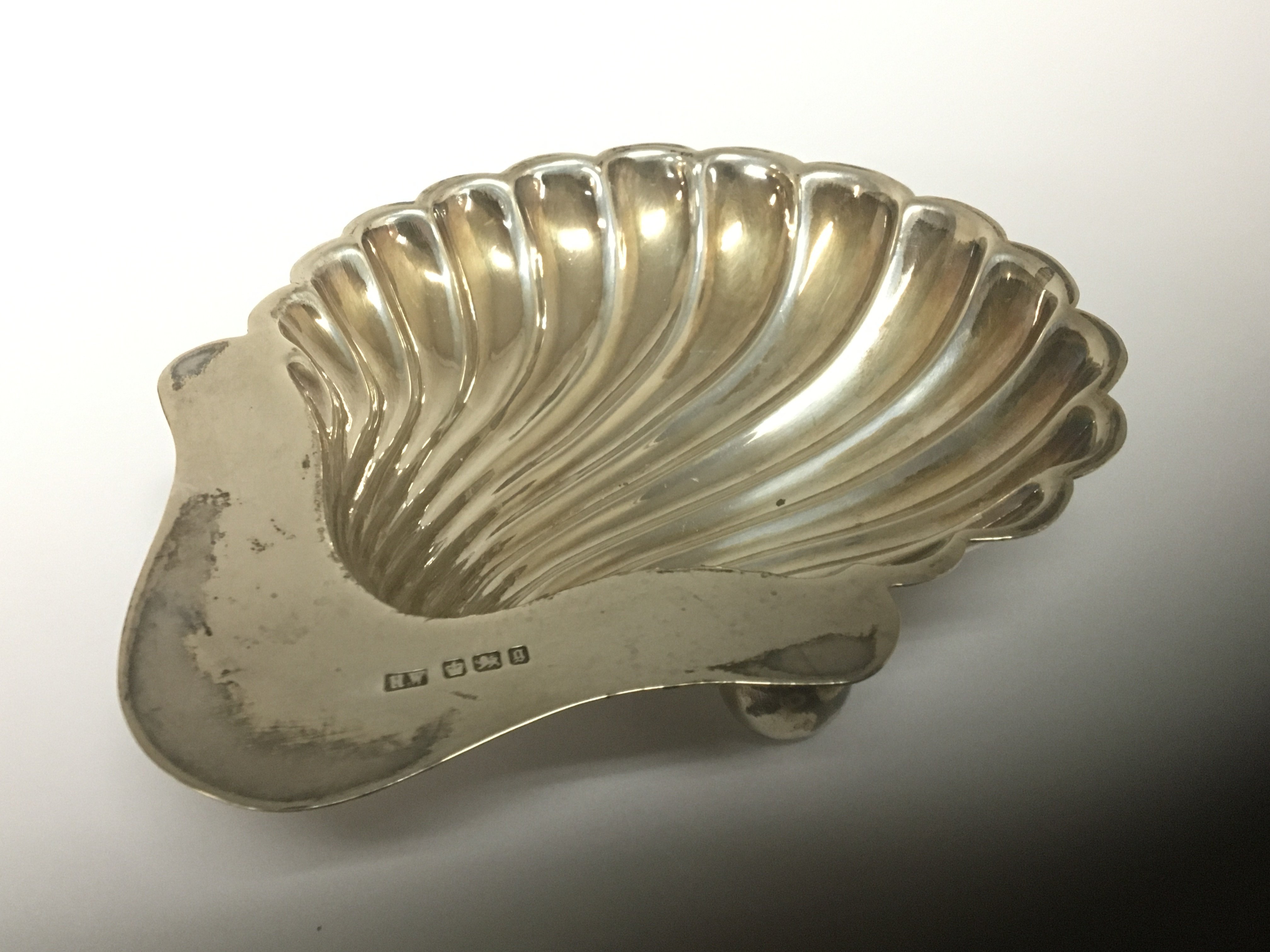 A silver shell shaped dish on small round feet Sheffield hallmarks.