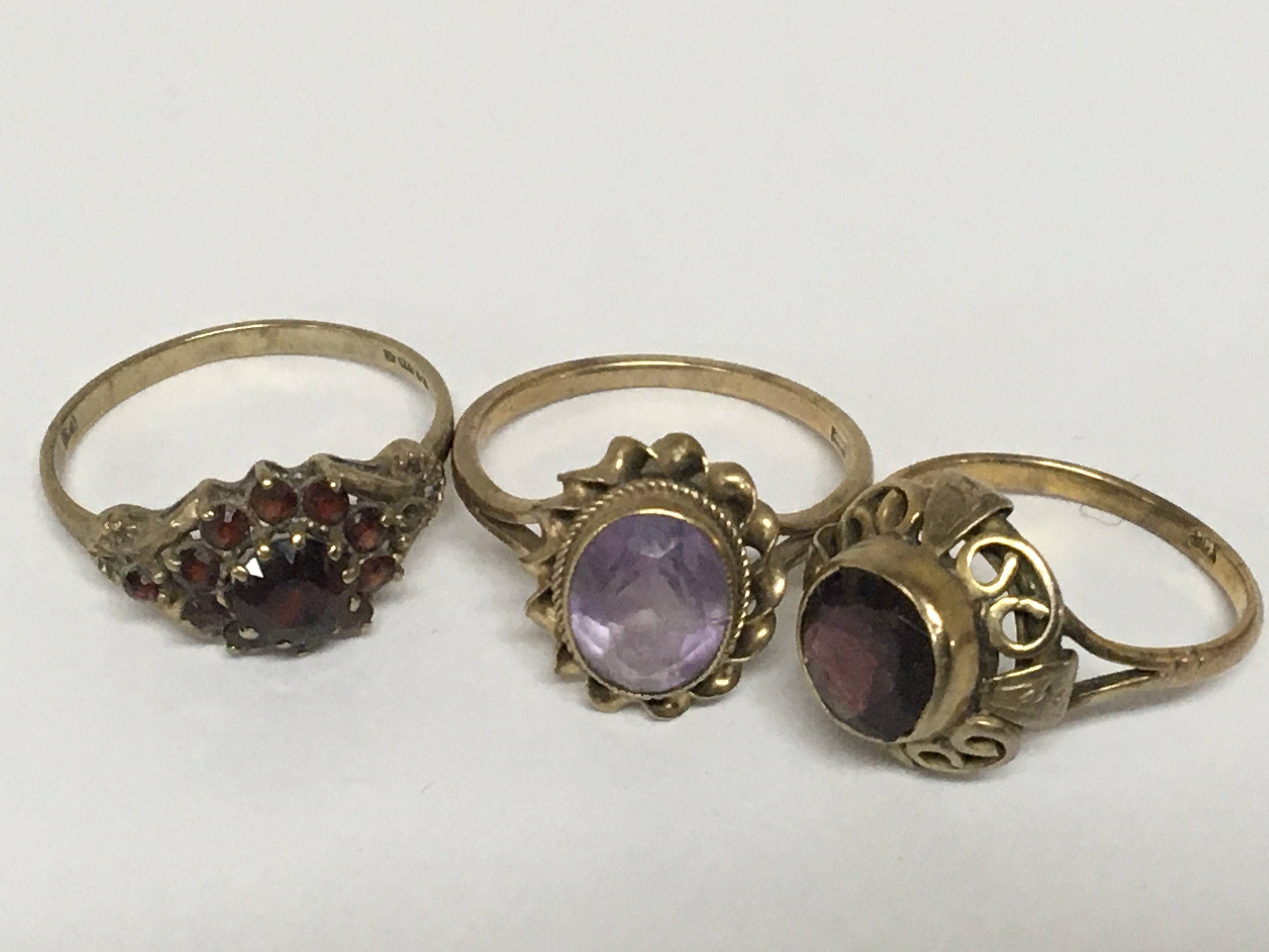Three 9carat gold rings set with amethyst and garnet stones weight 7g
