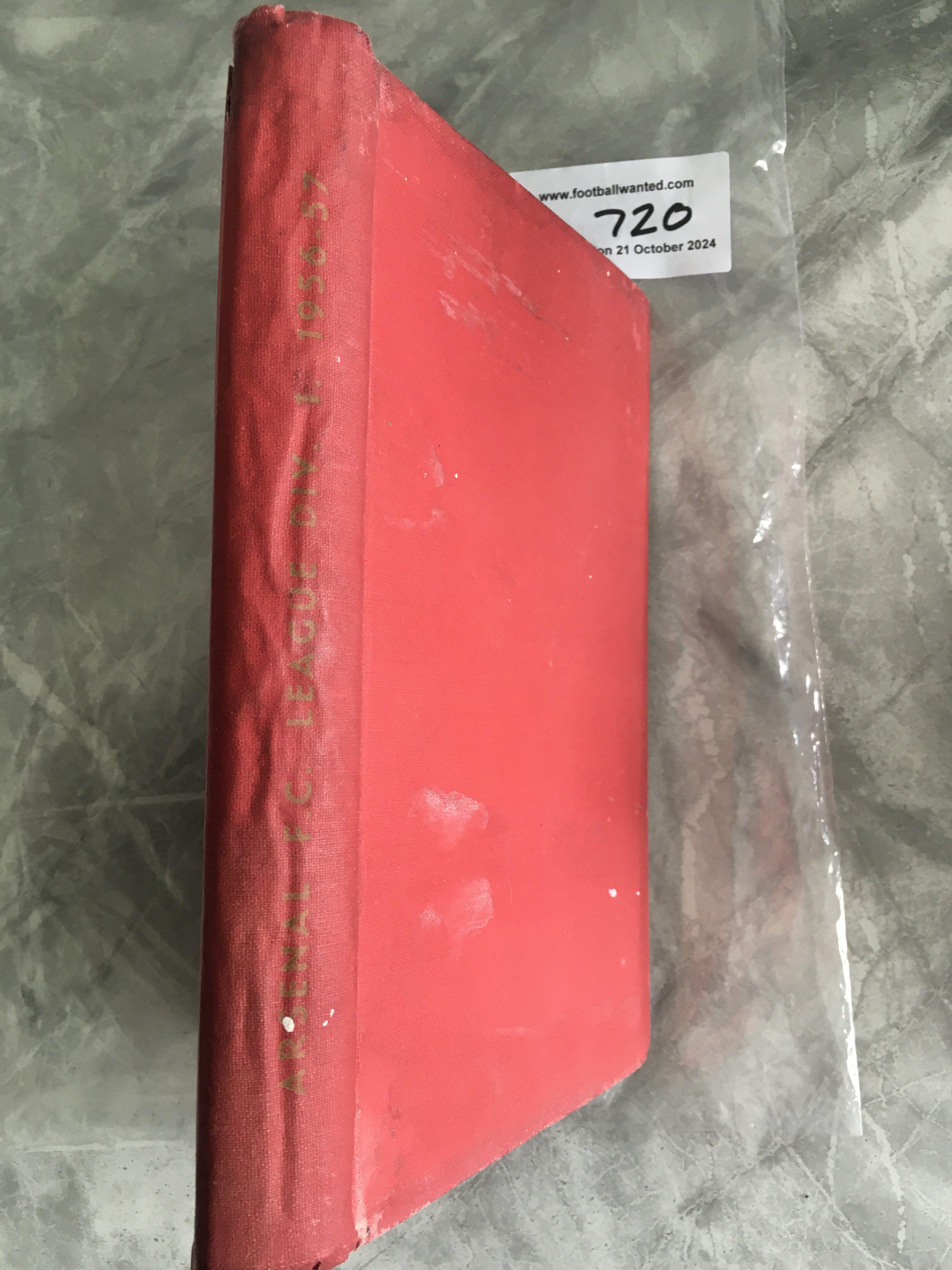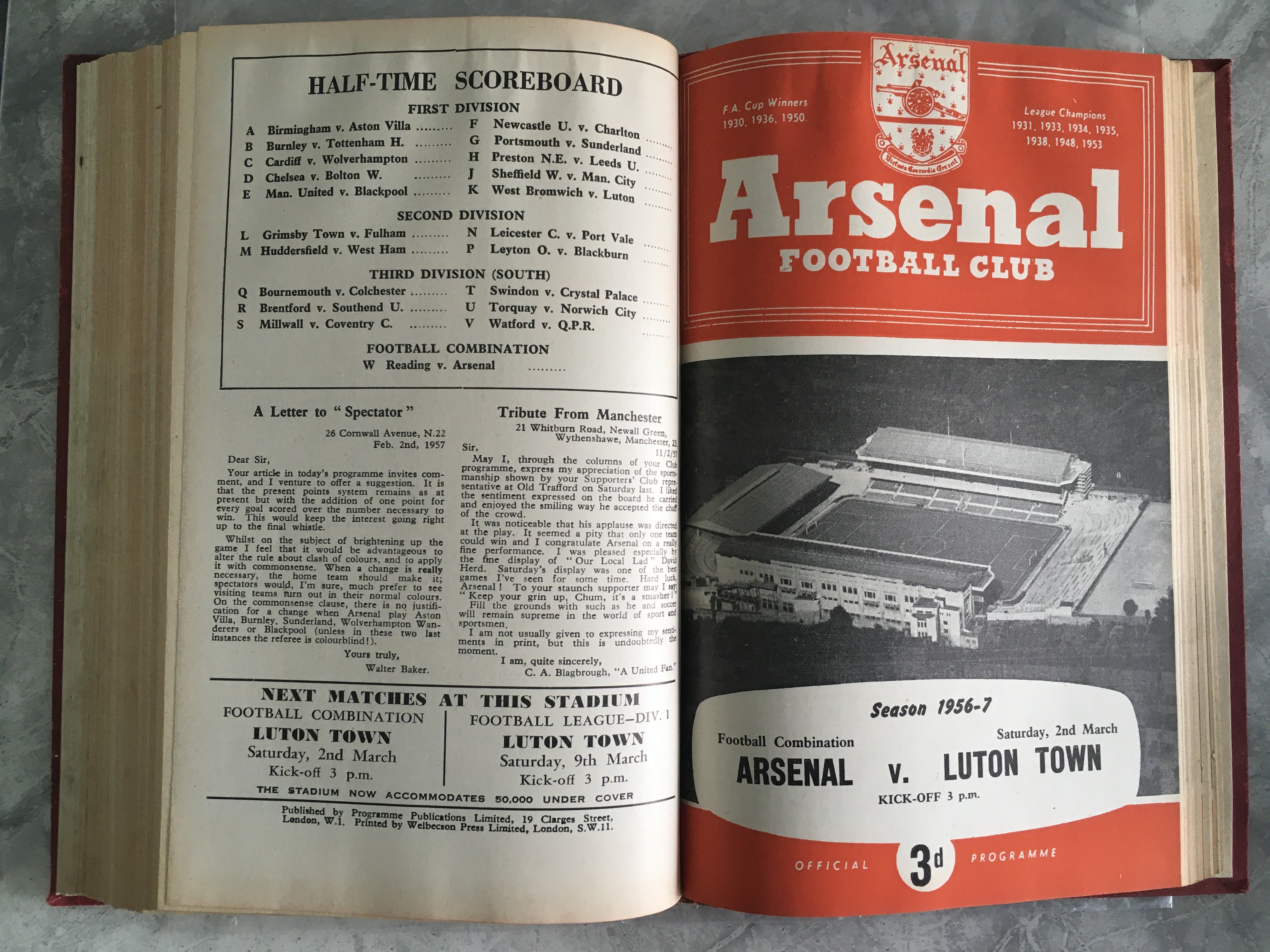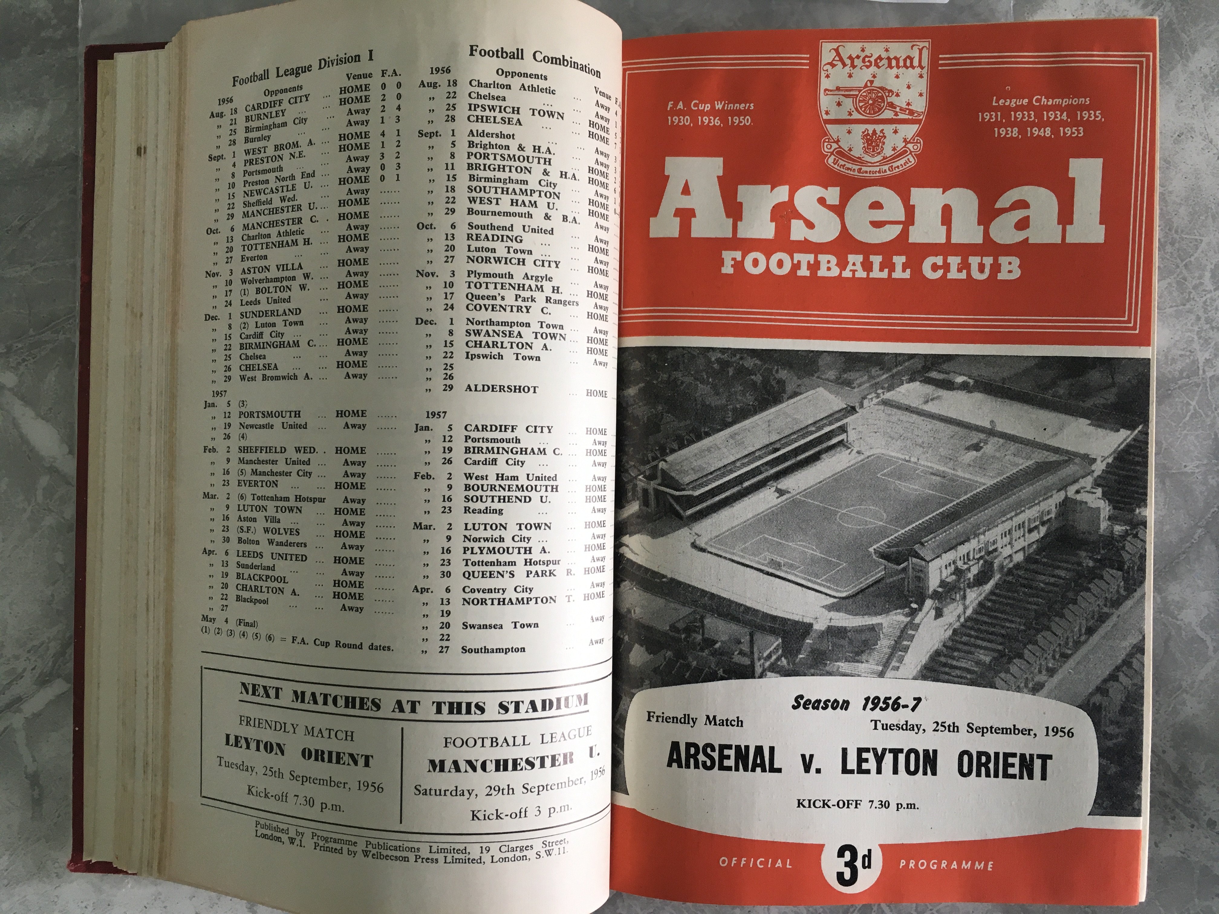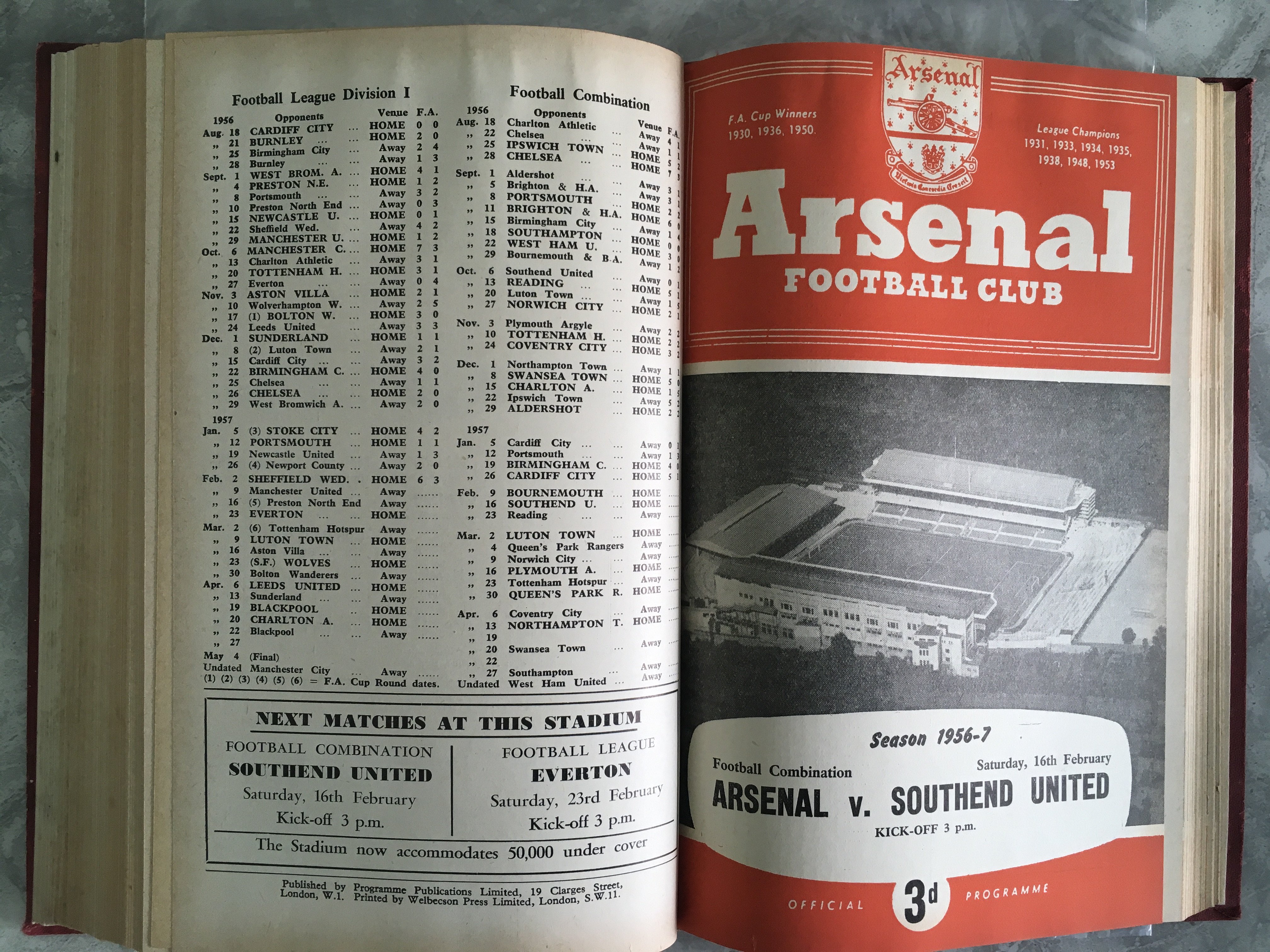 Arsenal 56/57 Bound Volume Of Home Football Programmes: Almost certainly all matches for both 1st team and reserves with Friendlies and neutral ground games played at Highbury. All have covers and appear unwritten. Includes British Army v Belgium Army, Wycombe v Corinthians and Friendlies v Orient and Red Star. Programmes excellent but some water damage to boards.