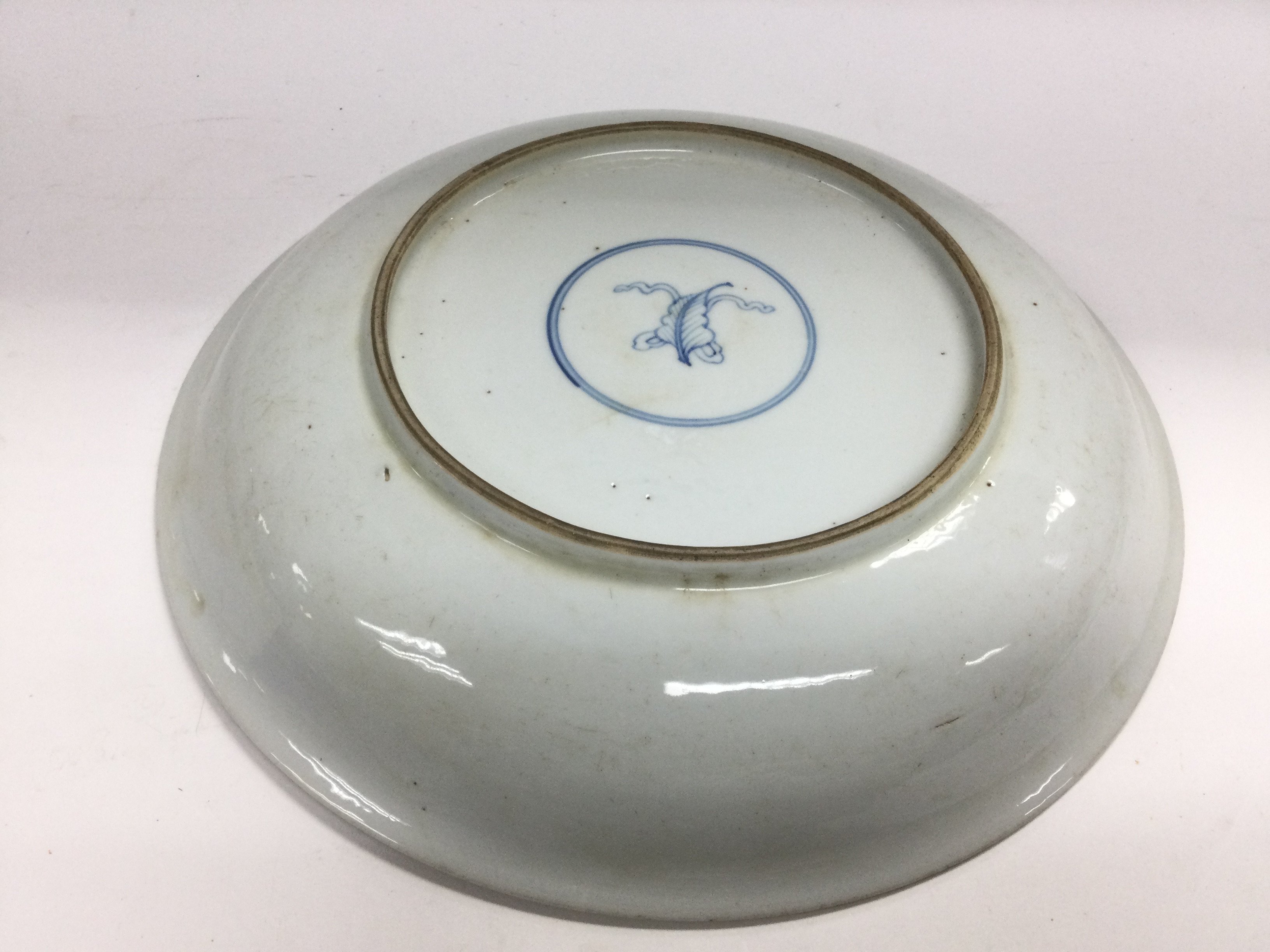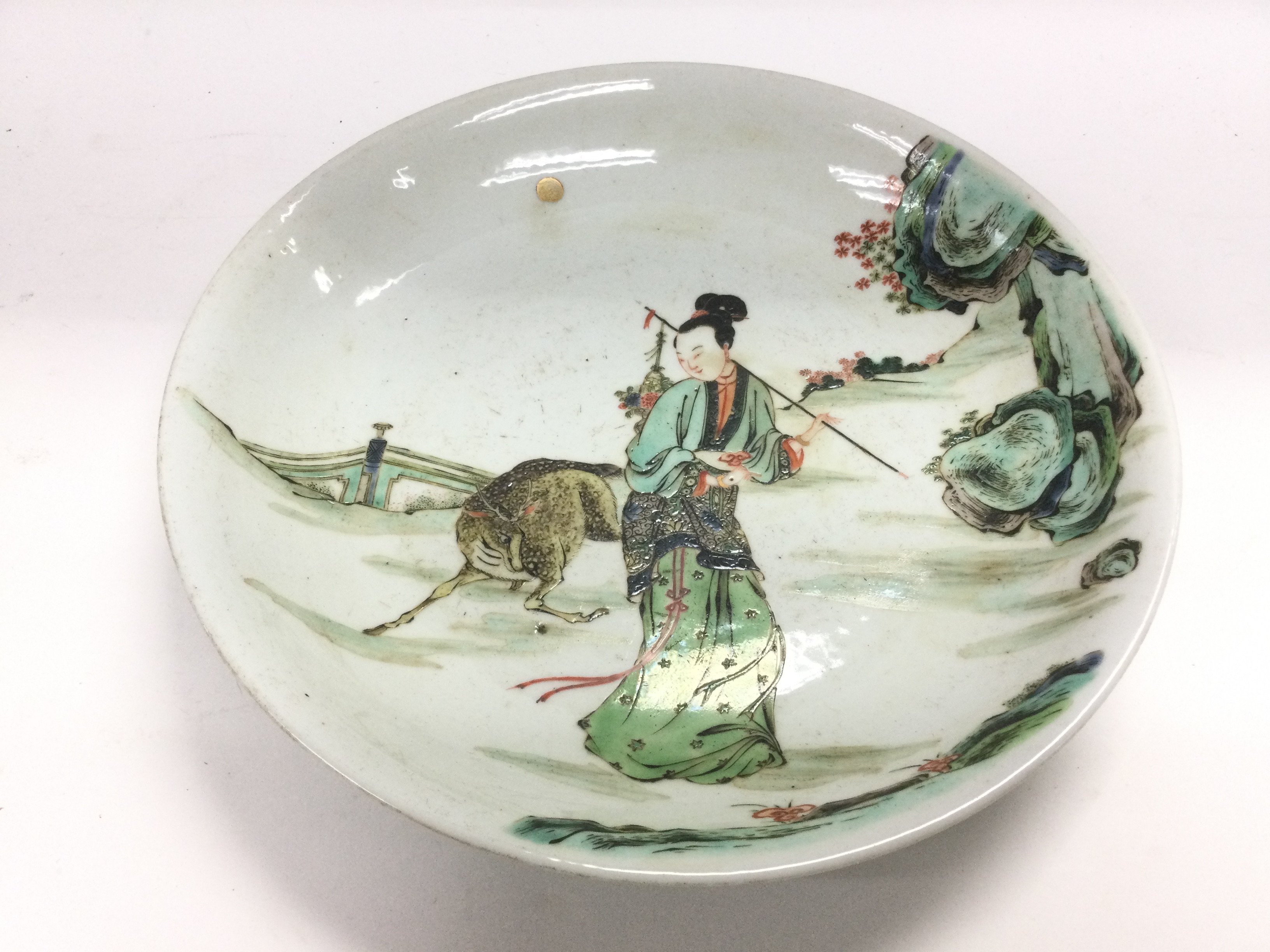 A famille rose dish decorated with figures in a landscape setting, diameter approx 28cm. Shipping category D.
