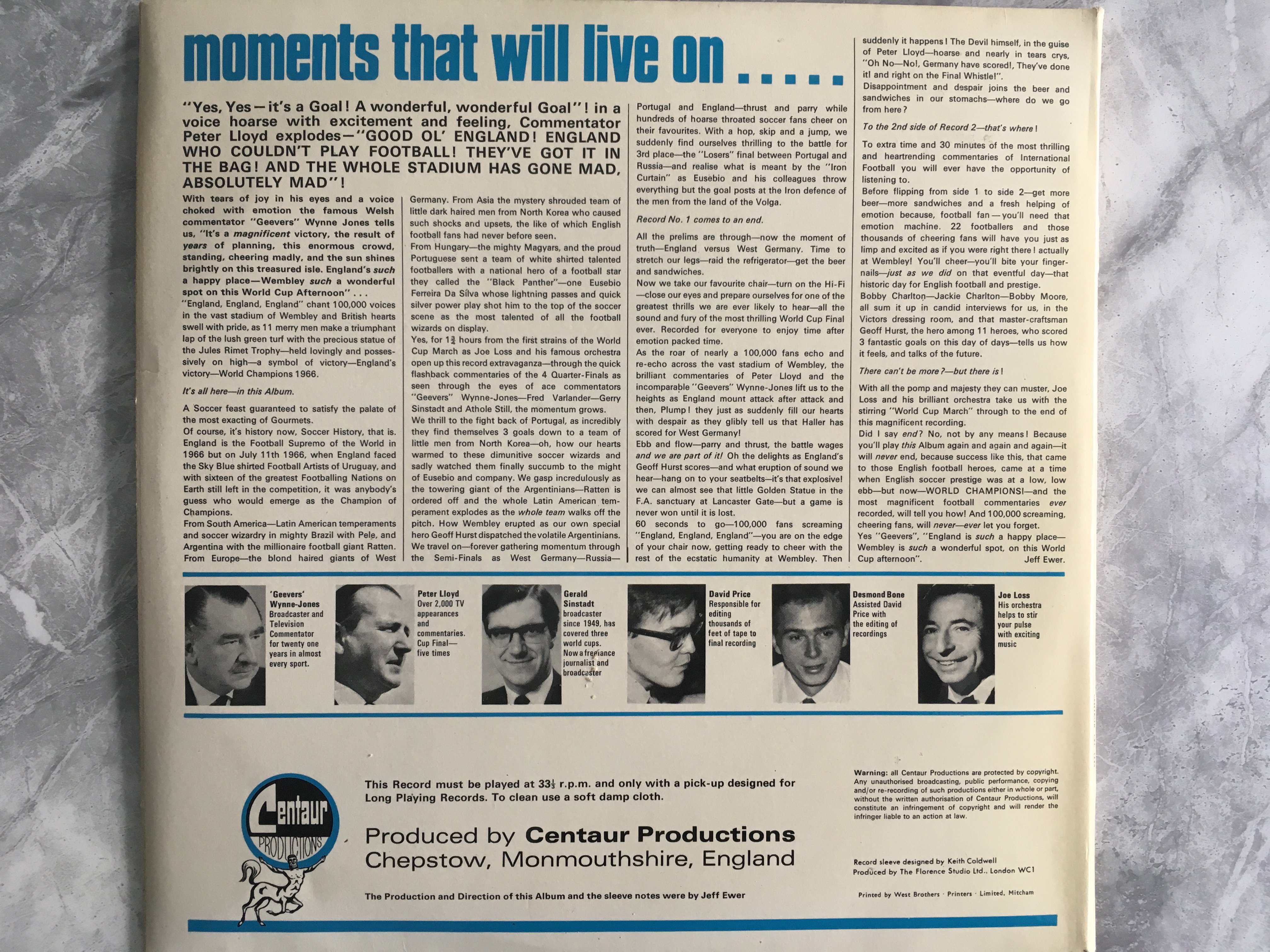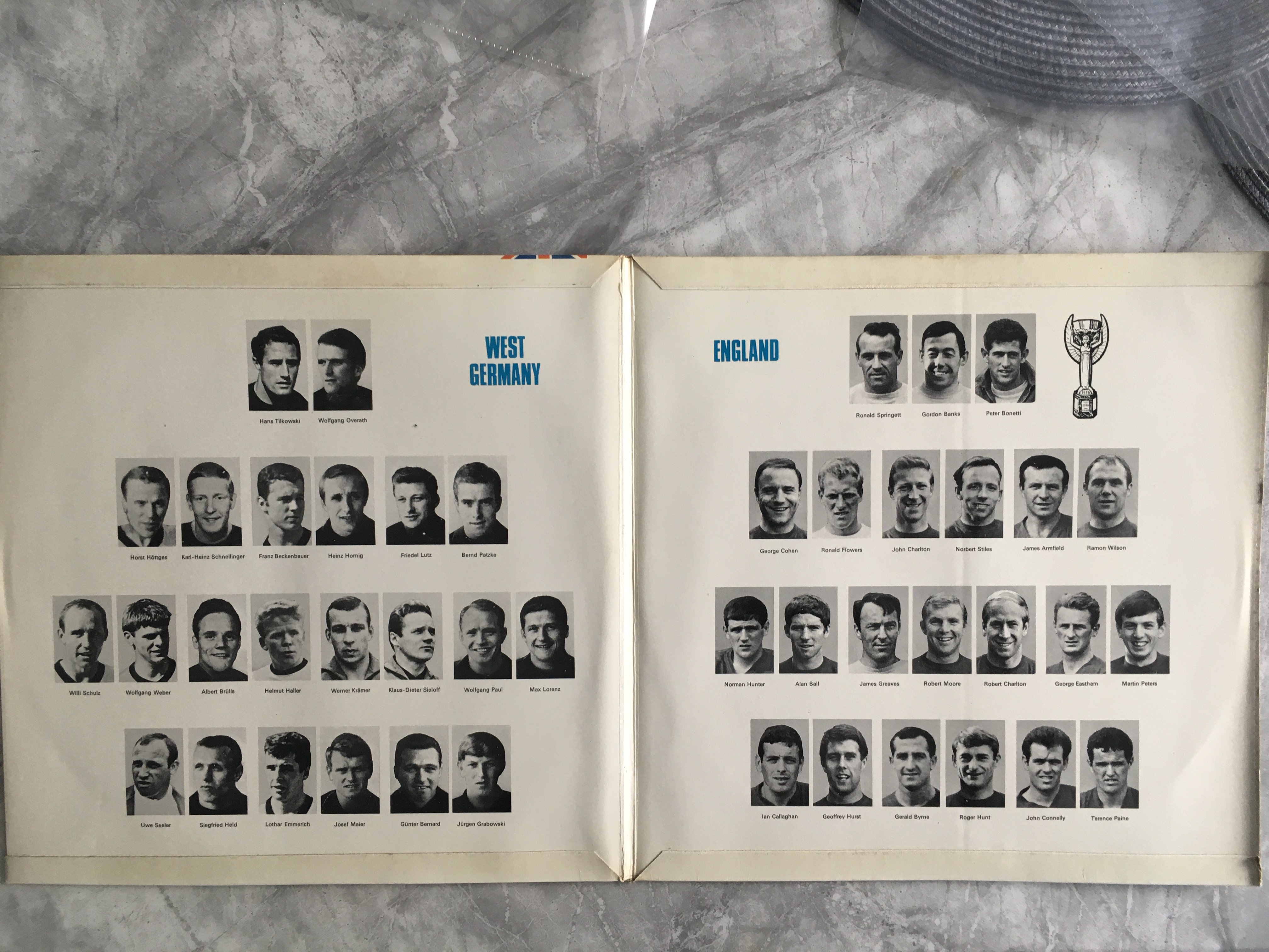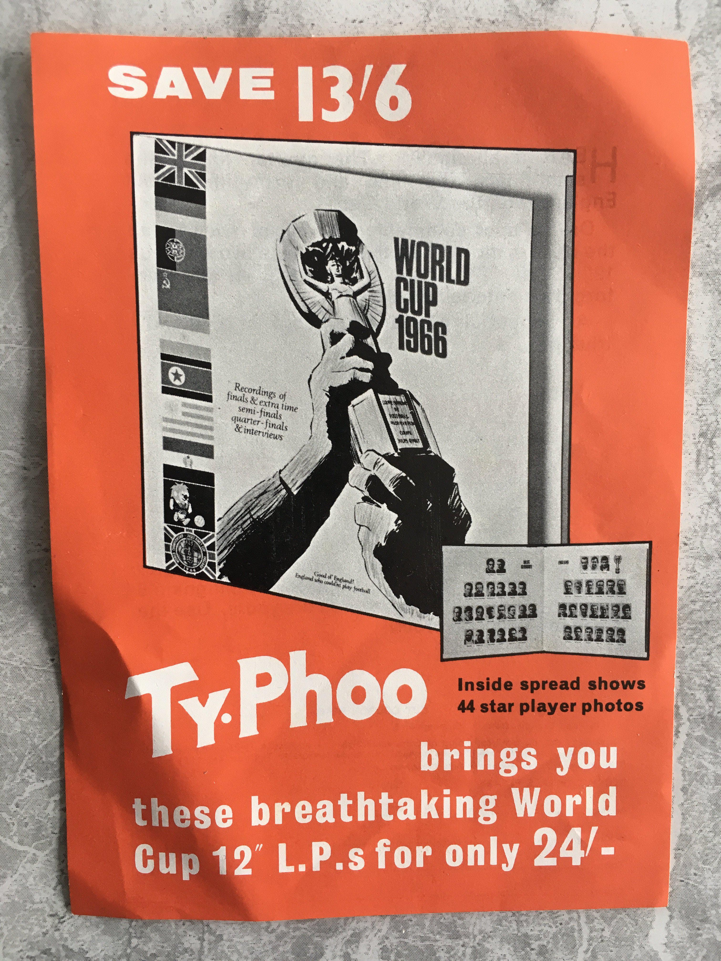 1966 World Cup Final LP + Rare Advertisement: Double LP record in original covers which consist of the final semi final quarter final and interviews. Inside the squads of England and West Germany are pictured. This was expensive in the day costing 37/6 but with the record comes a small advertising leaflet from Typhoo offering in exchange for 4 Typhoo Tea packets availability to purchase at 24 Shillings. (2)