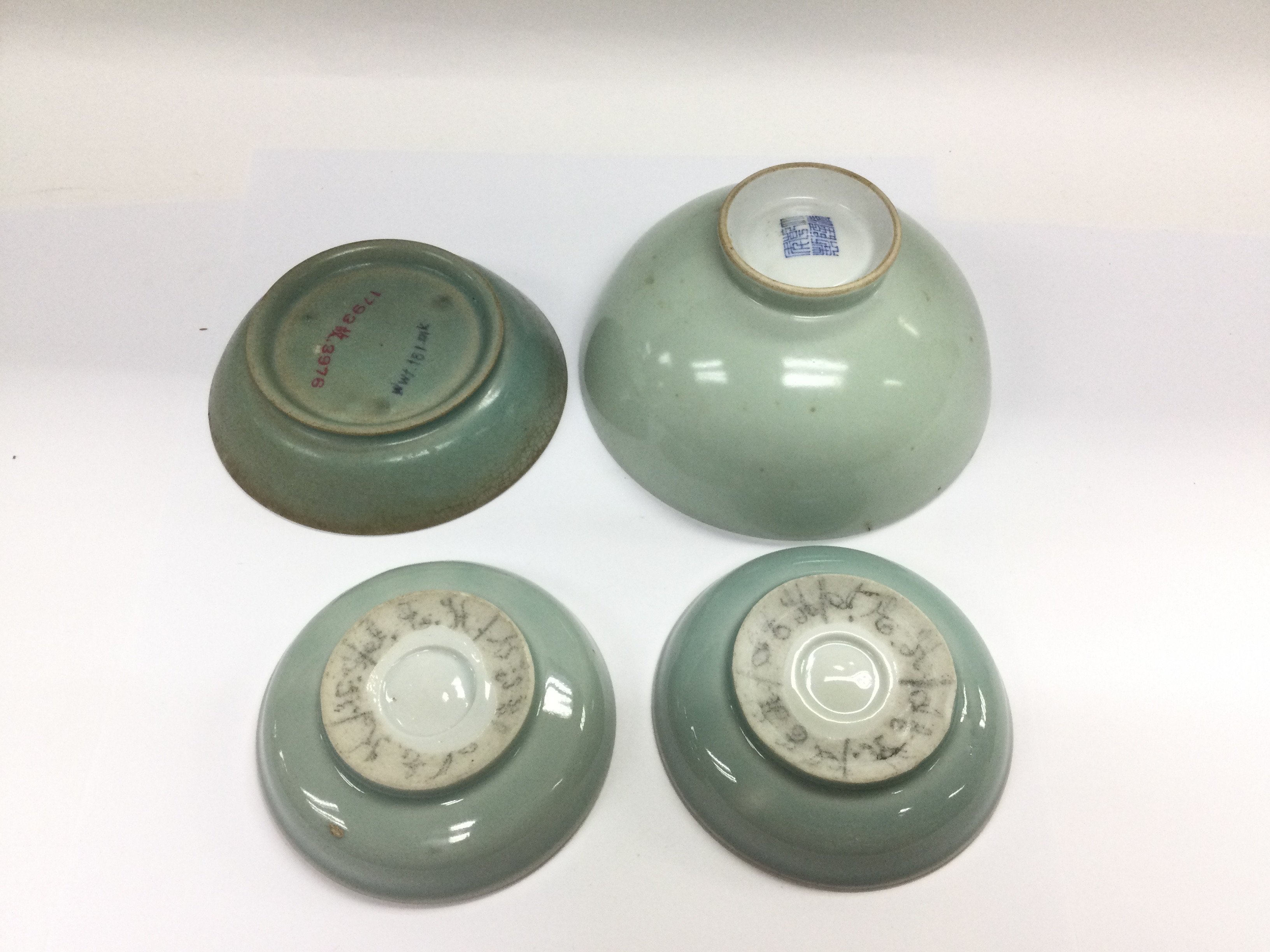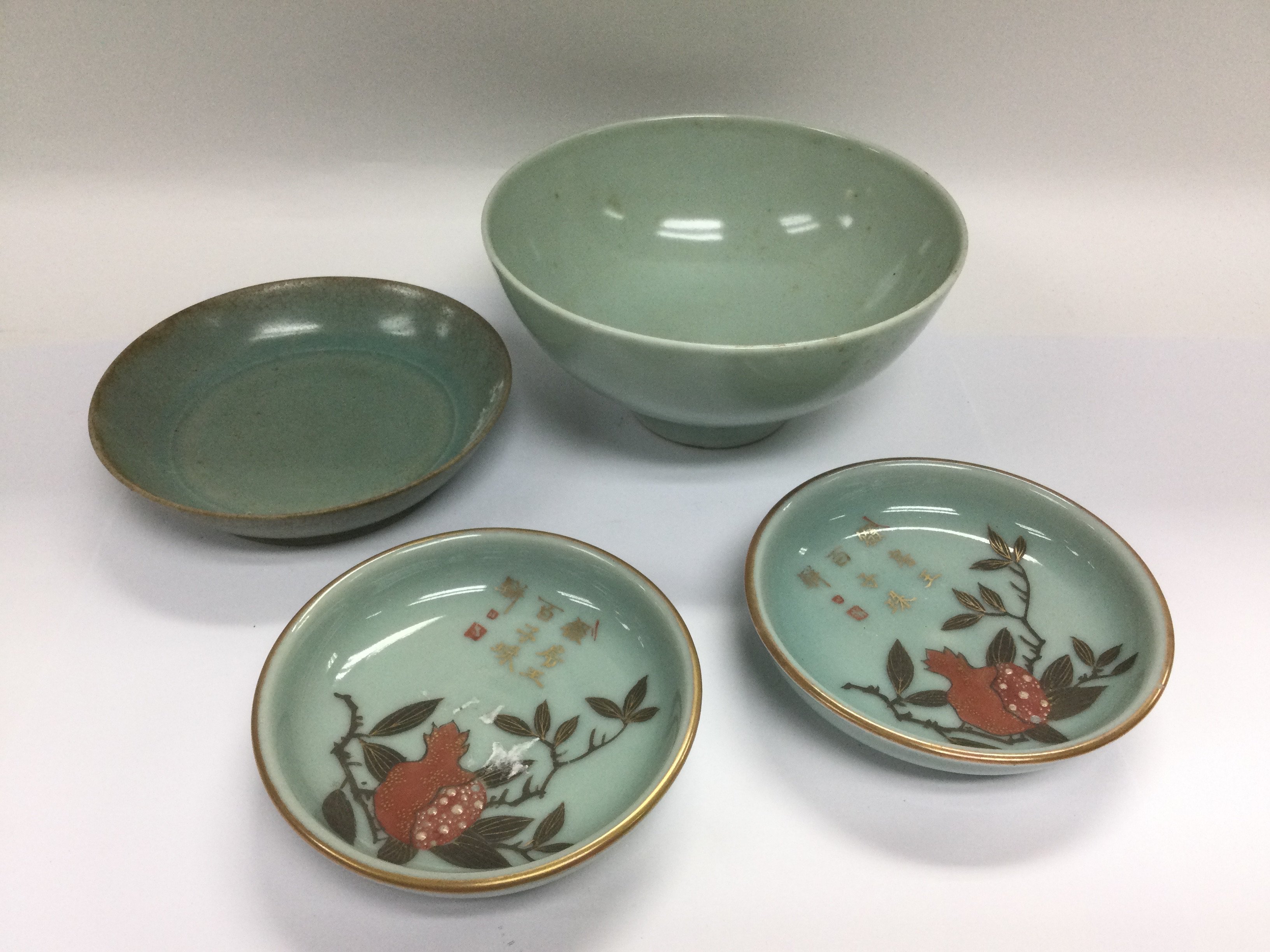 Four Celadon dishes, the largest diameter approx 16cm. Shipping category D.