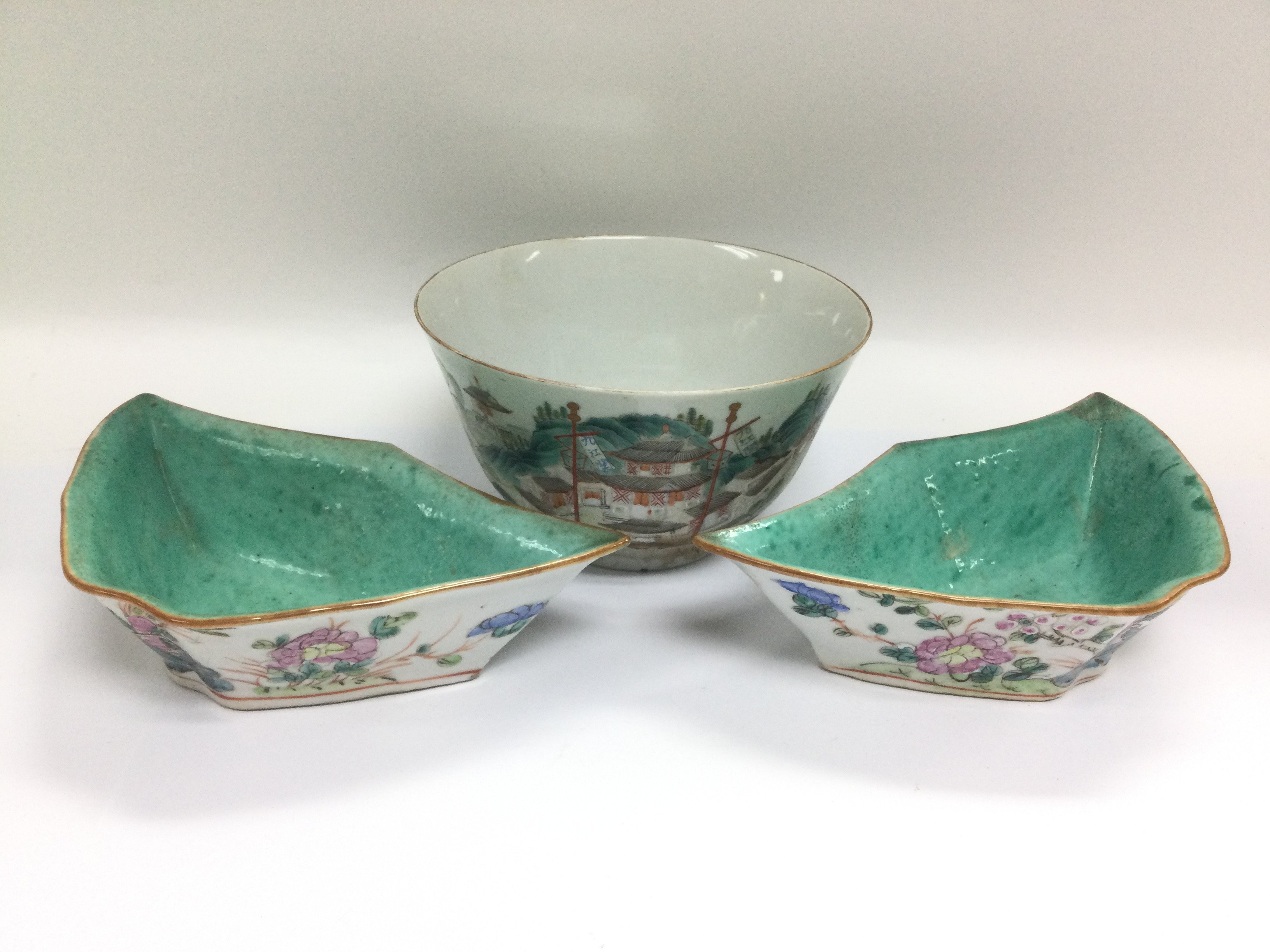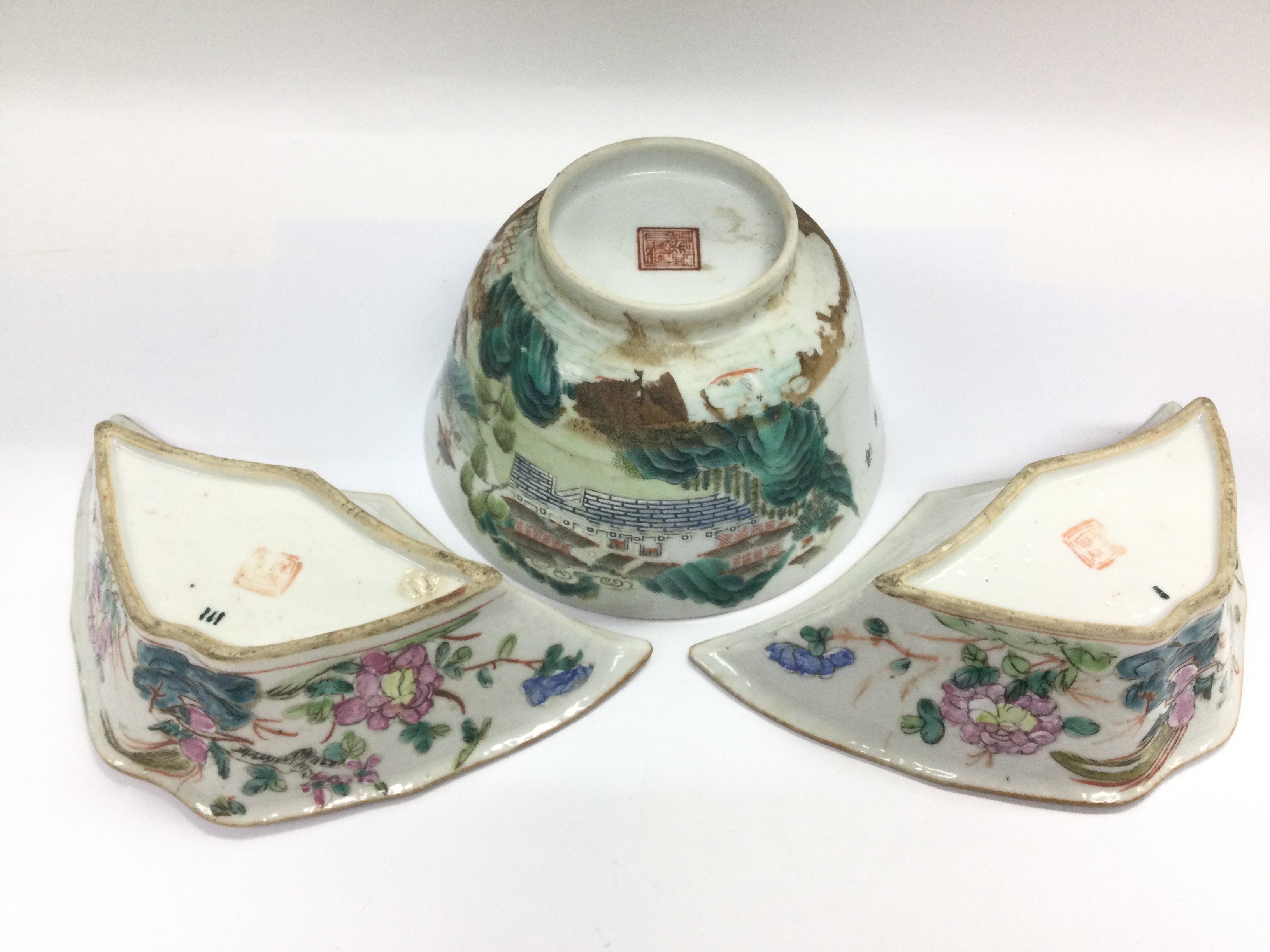 An Oriental bowl decorated with pagodas, approx diameter 16.5cm, together with a pair of shaped dishes with floral decoration (3). Shipping category D.