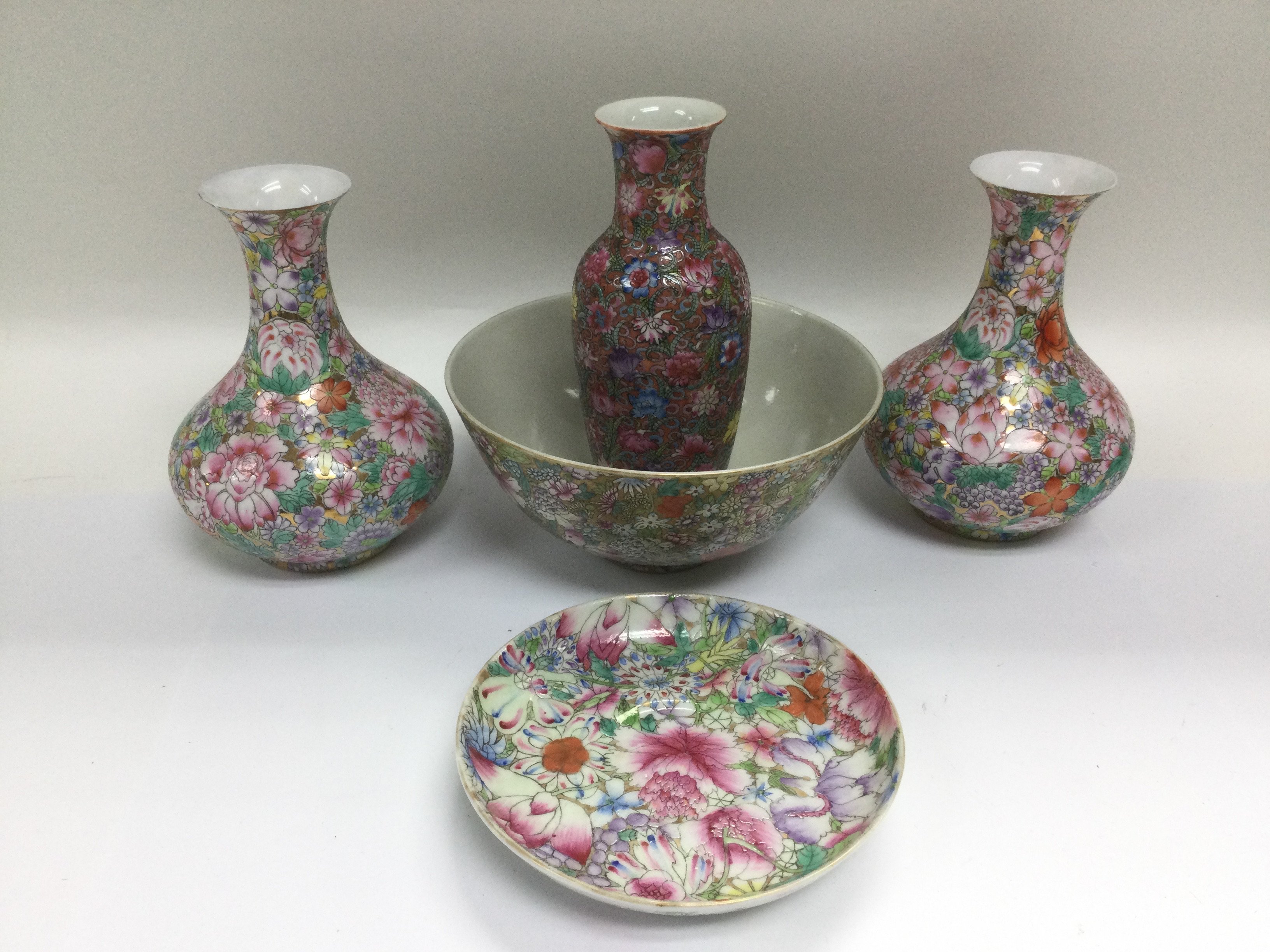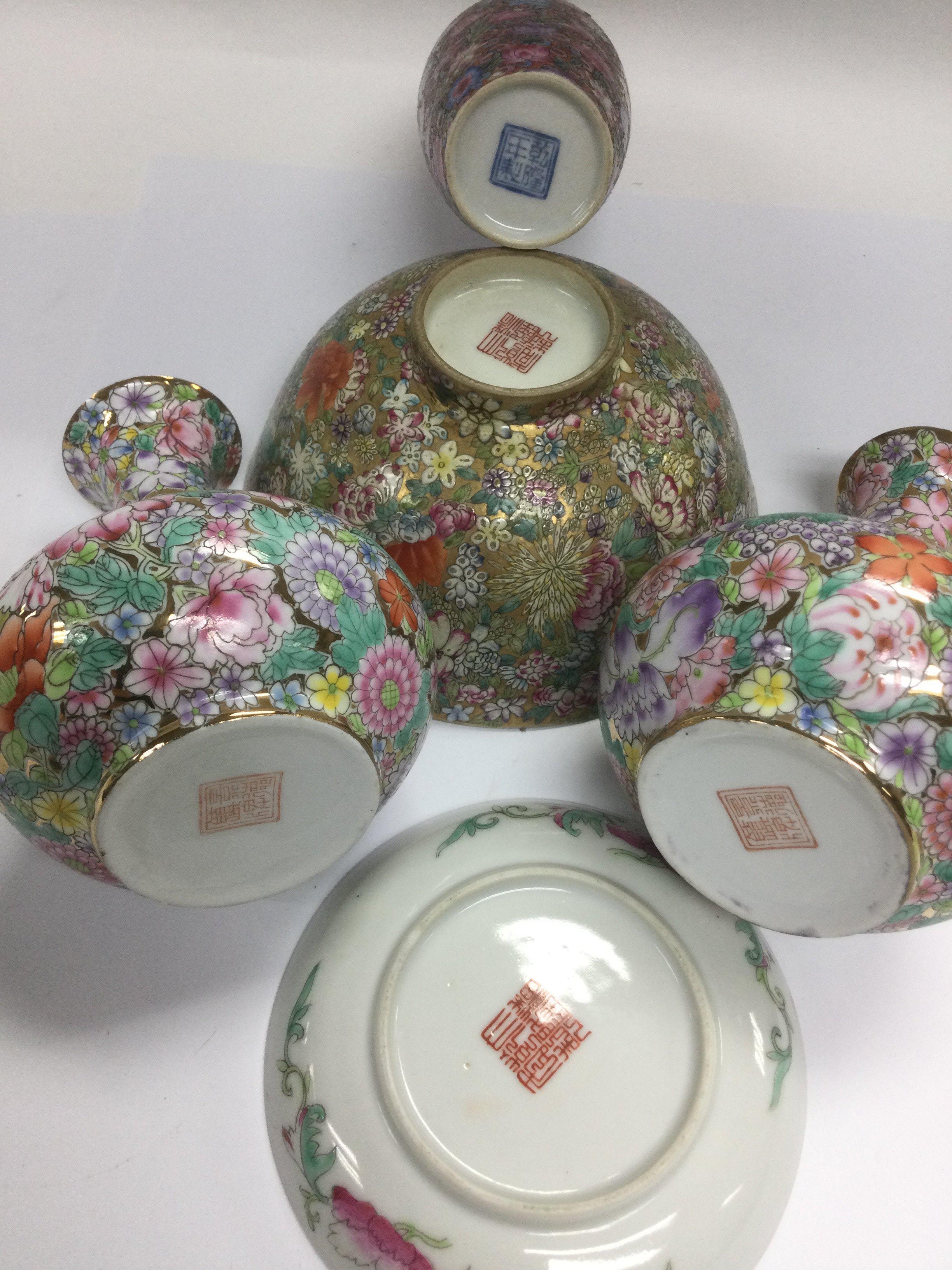 Five examples of Oriental ceramics with heavily decorated floral patterns. Tallest case approx 13cm. Shipping category D.