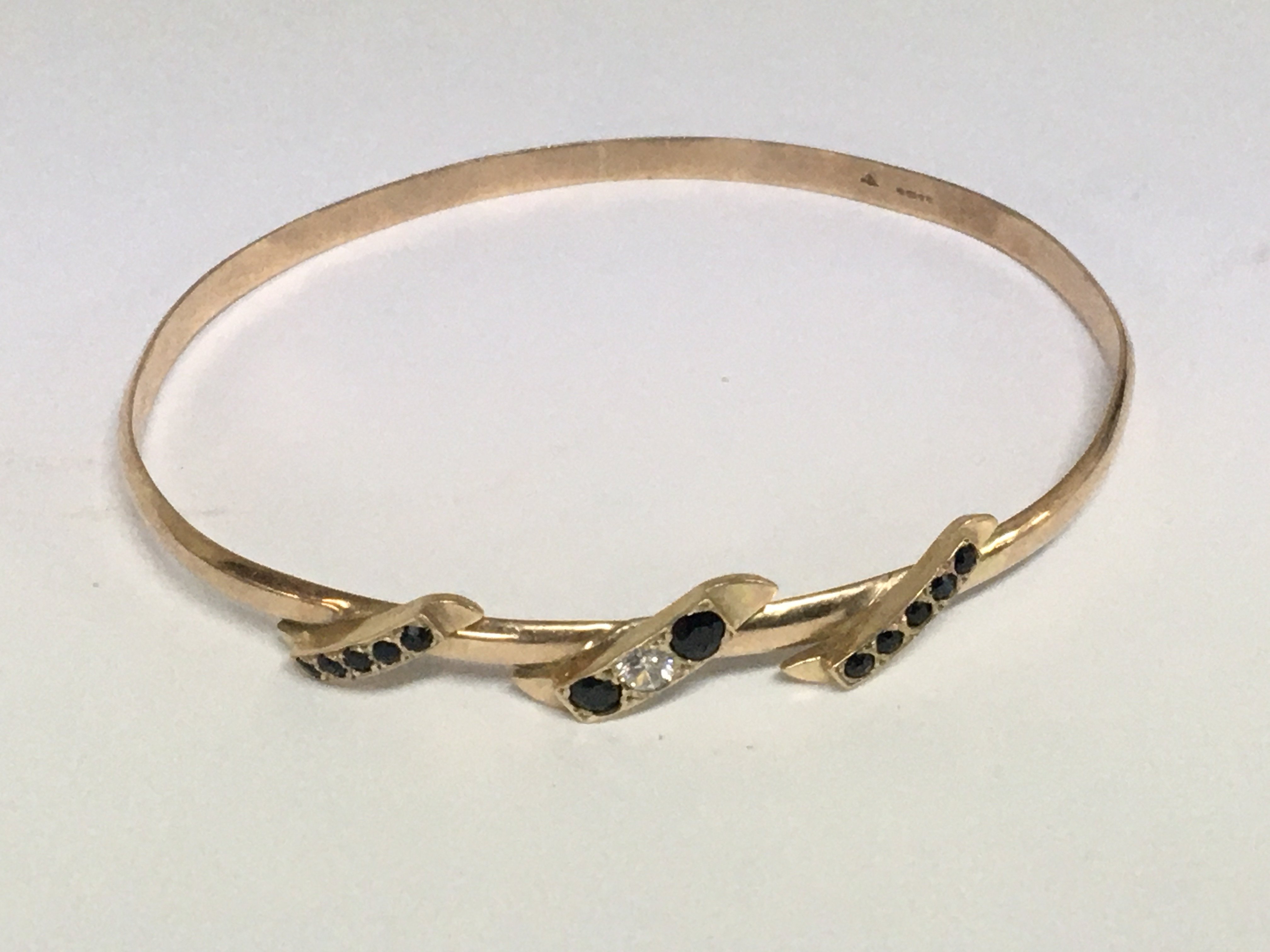 A 9carat gold bangle set with a diamond and sapphire. Weight 11g