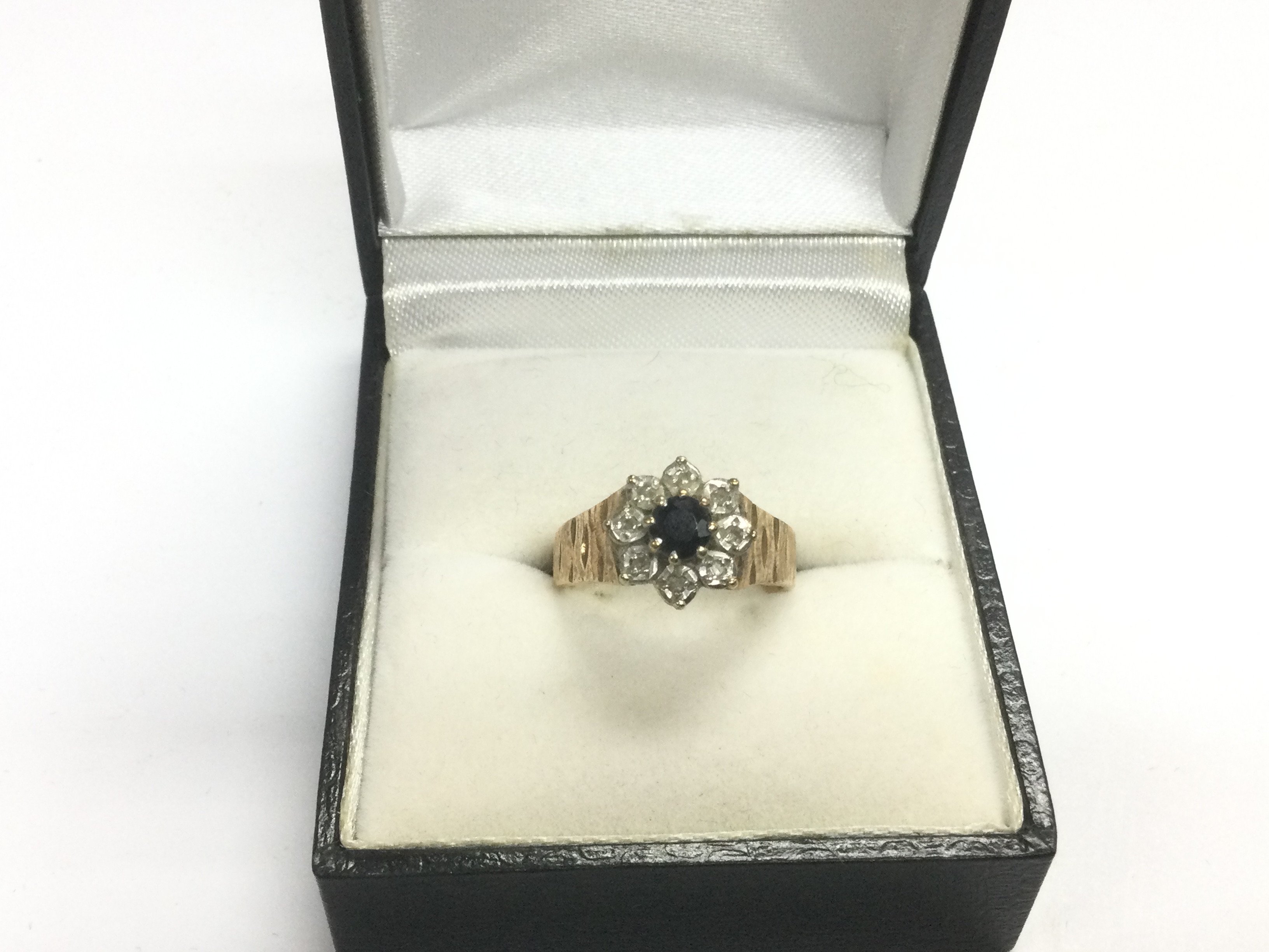 A 9ct gold ring set with a central sapphire surrounded by diamonds, approx 3.2g and approx size L. Shipping category A.