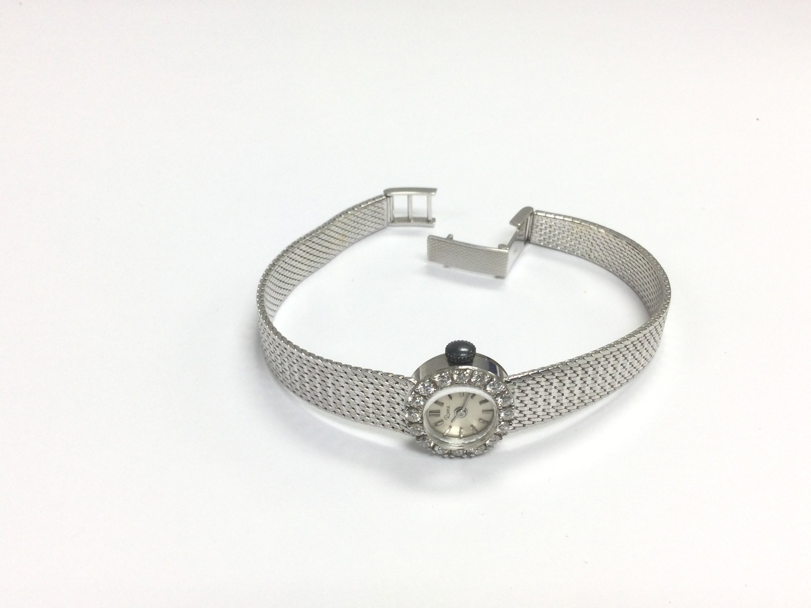 An 18ct white gold cased ladies watch with diamond set bezel, approx 27g. Shipping category A.