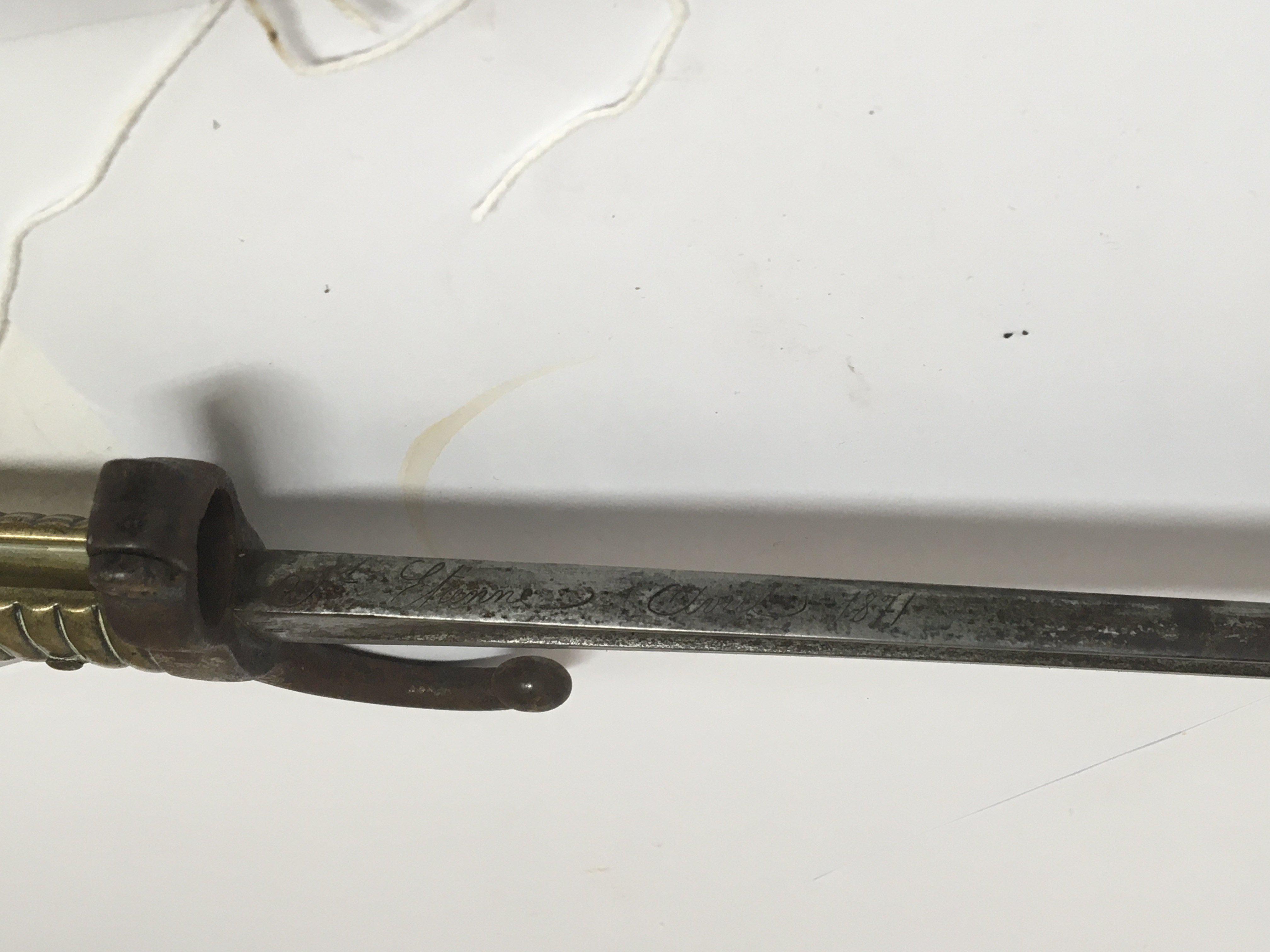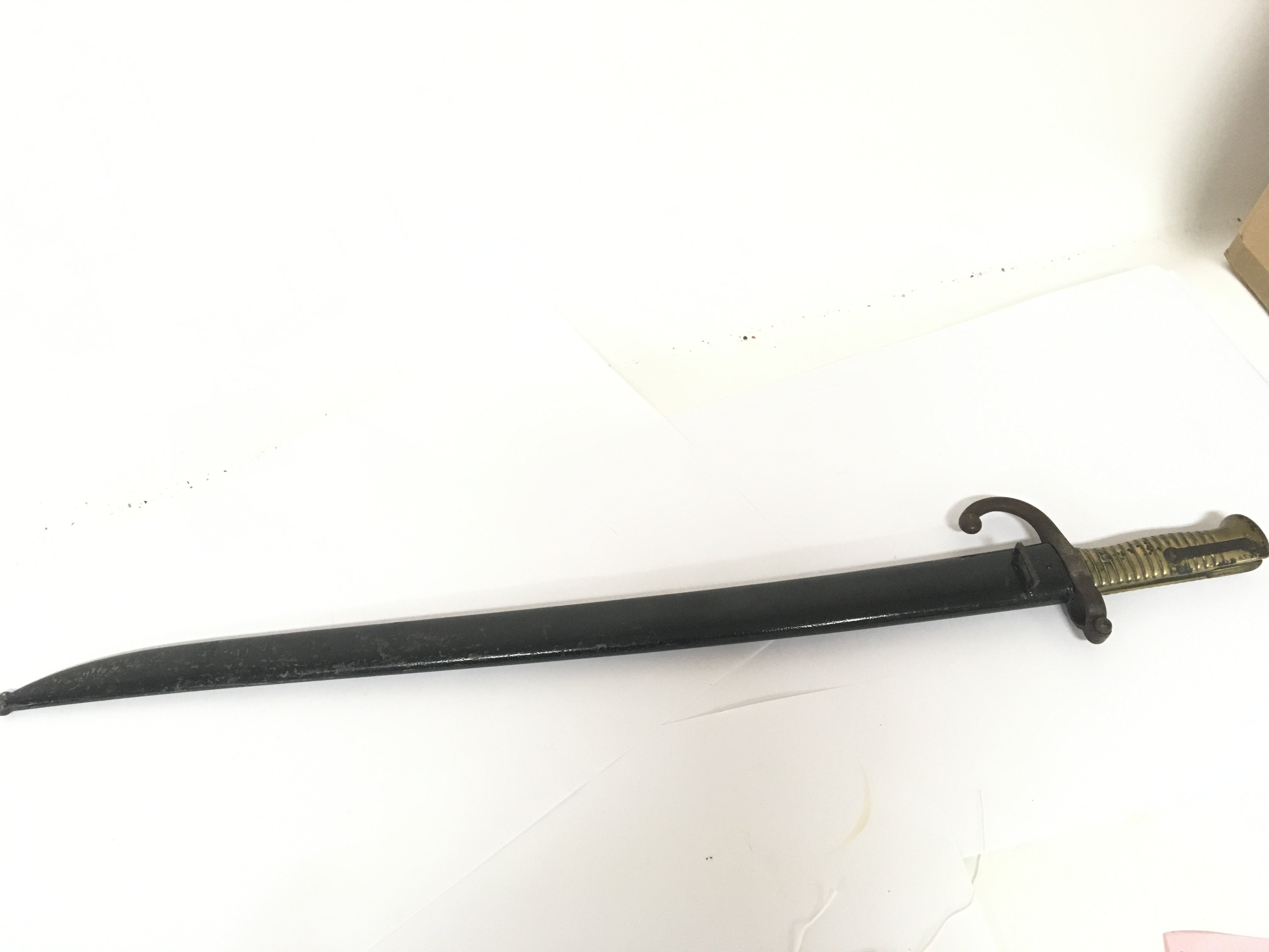 A French Chassepot bayonet 1871 pattern with brass handle grip the edge of the blade with inscription and date