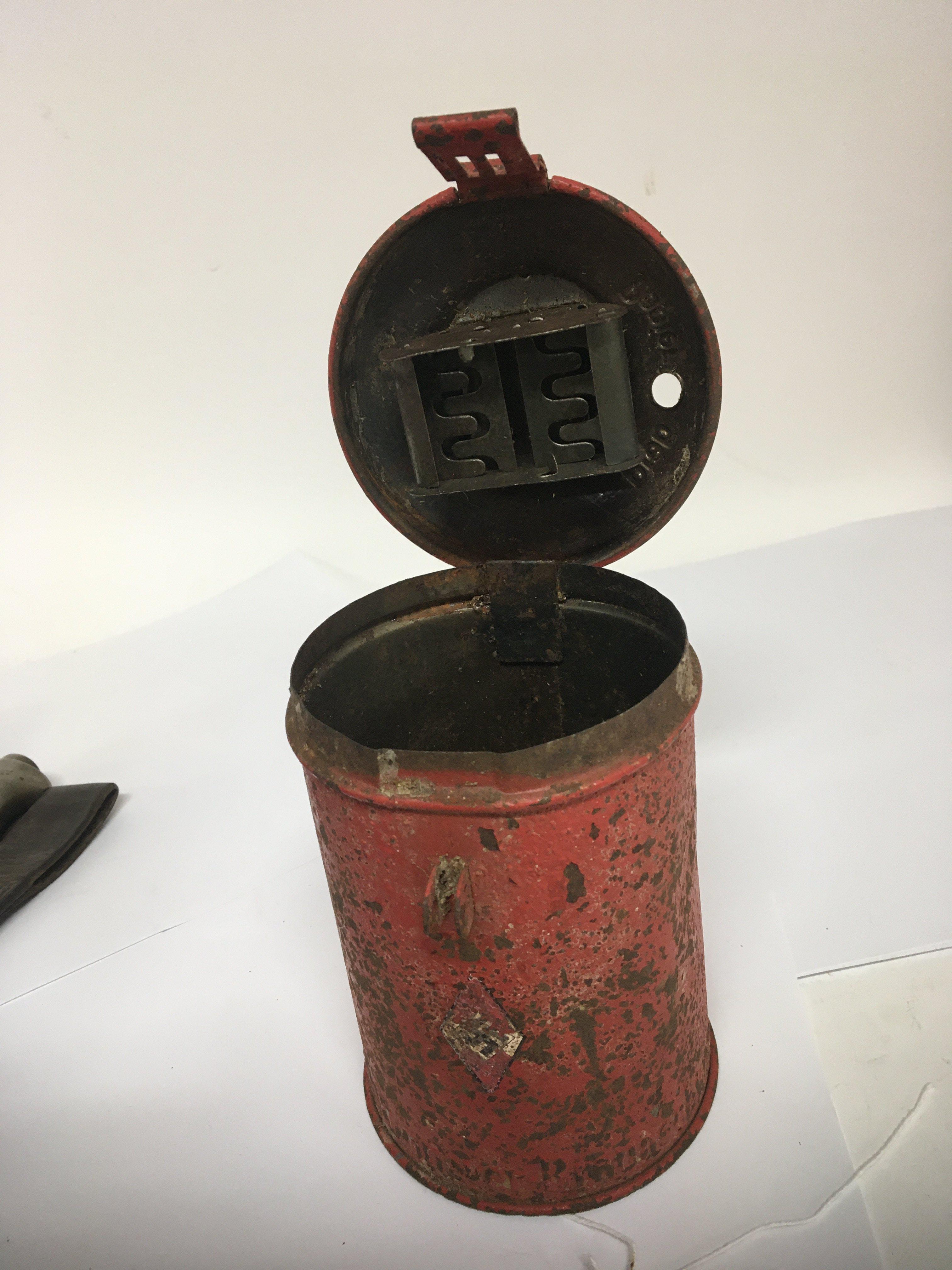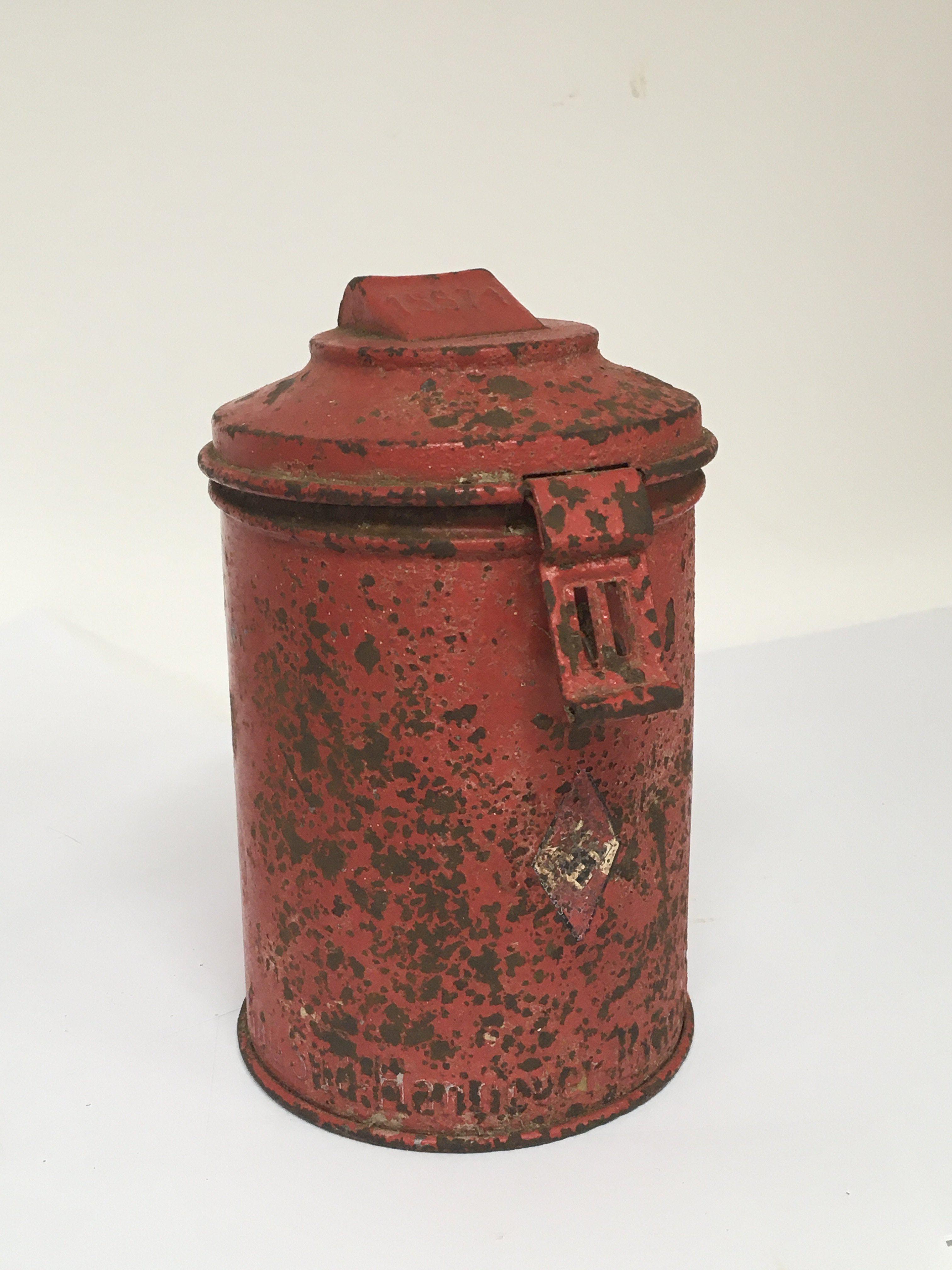 A rare German Third Reich Hitler Youth money collection tin with a hinged top and embossed inscription.