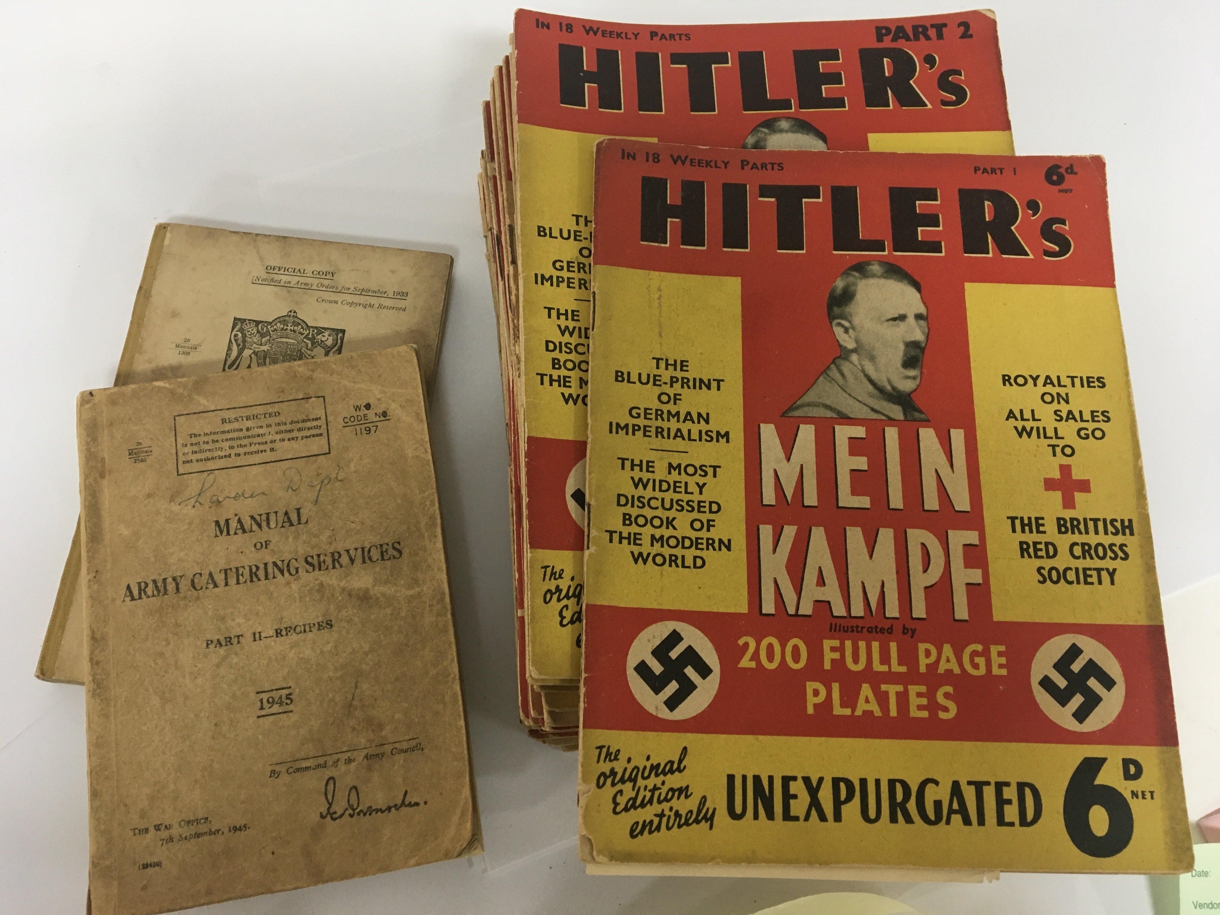 A collection of English translation Hitlers Mein Kampf published by Hutchinson & Co Ltd in eighteen weekly parts and two 1945 Army Catering service manuals.