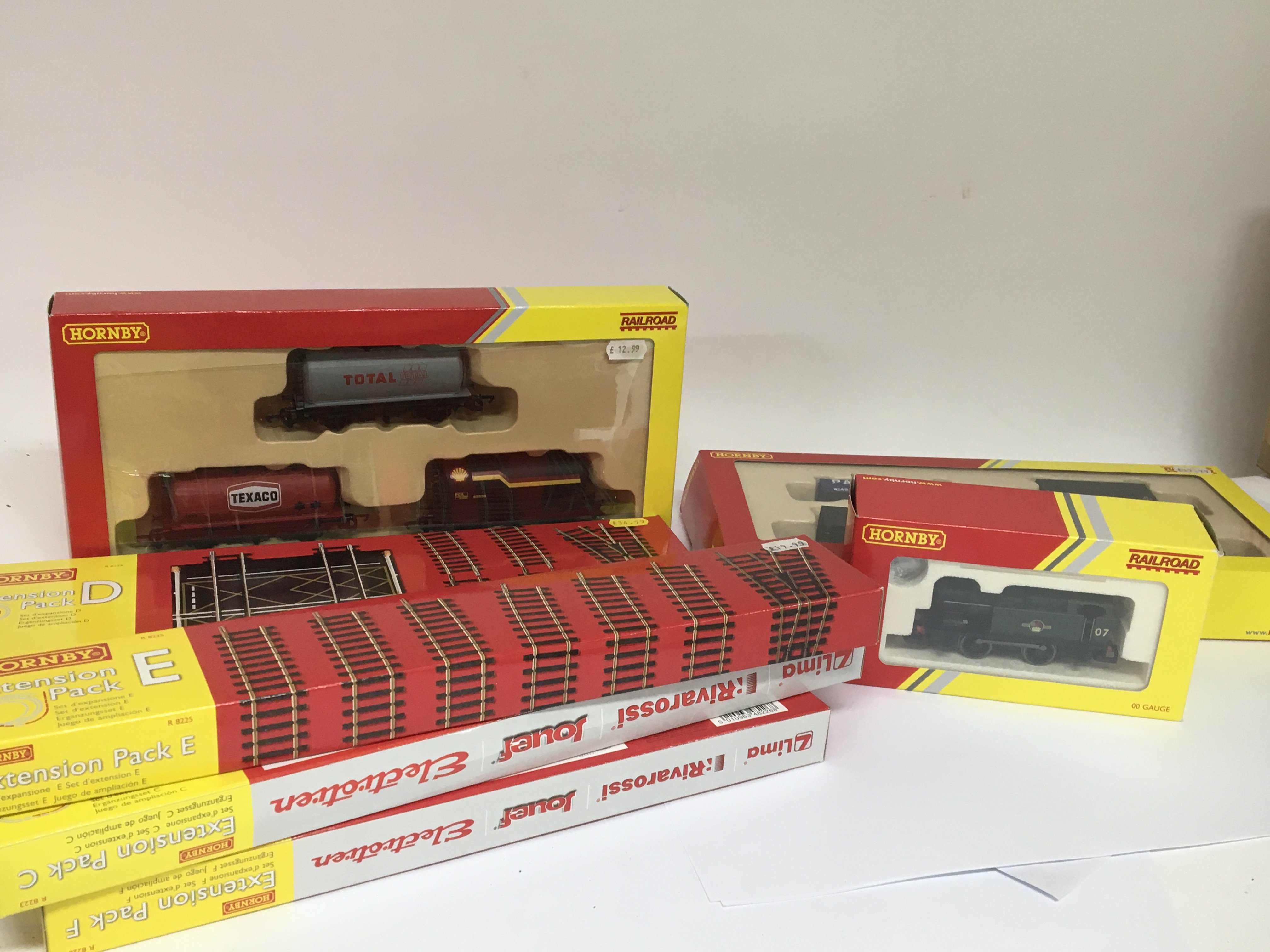 A OO gauge train set boxed Hornby wagons track a boxed locomotive and a bag containing a layout and other track and accessories.