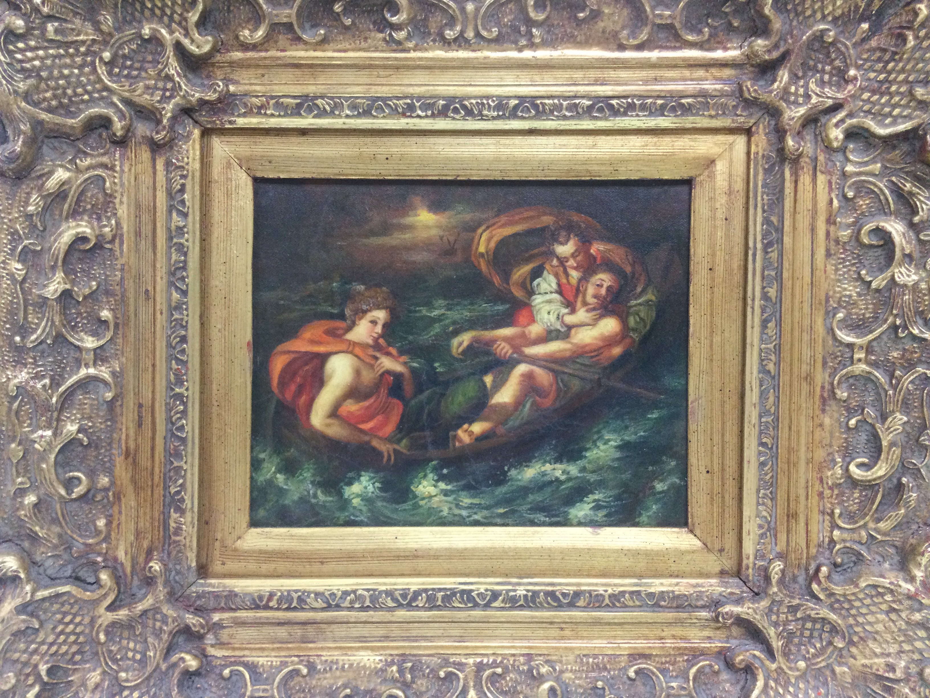 A gilt framed oil on canvas, an allegorical scene of three figures in a rowing boat, approx 50cm x 44cm. Shipping category C.