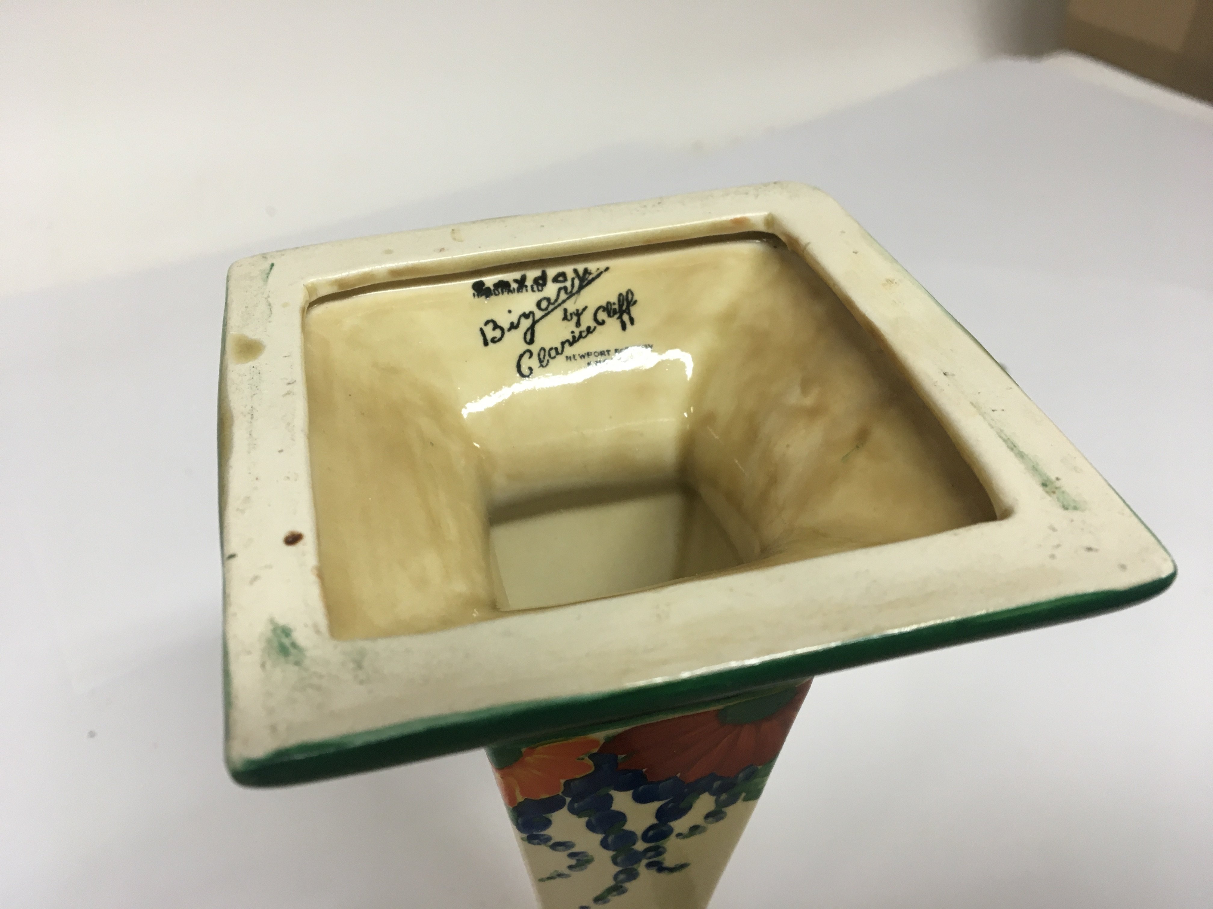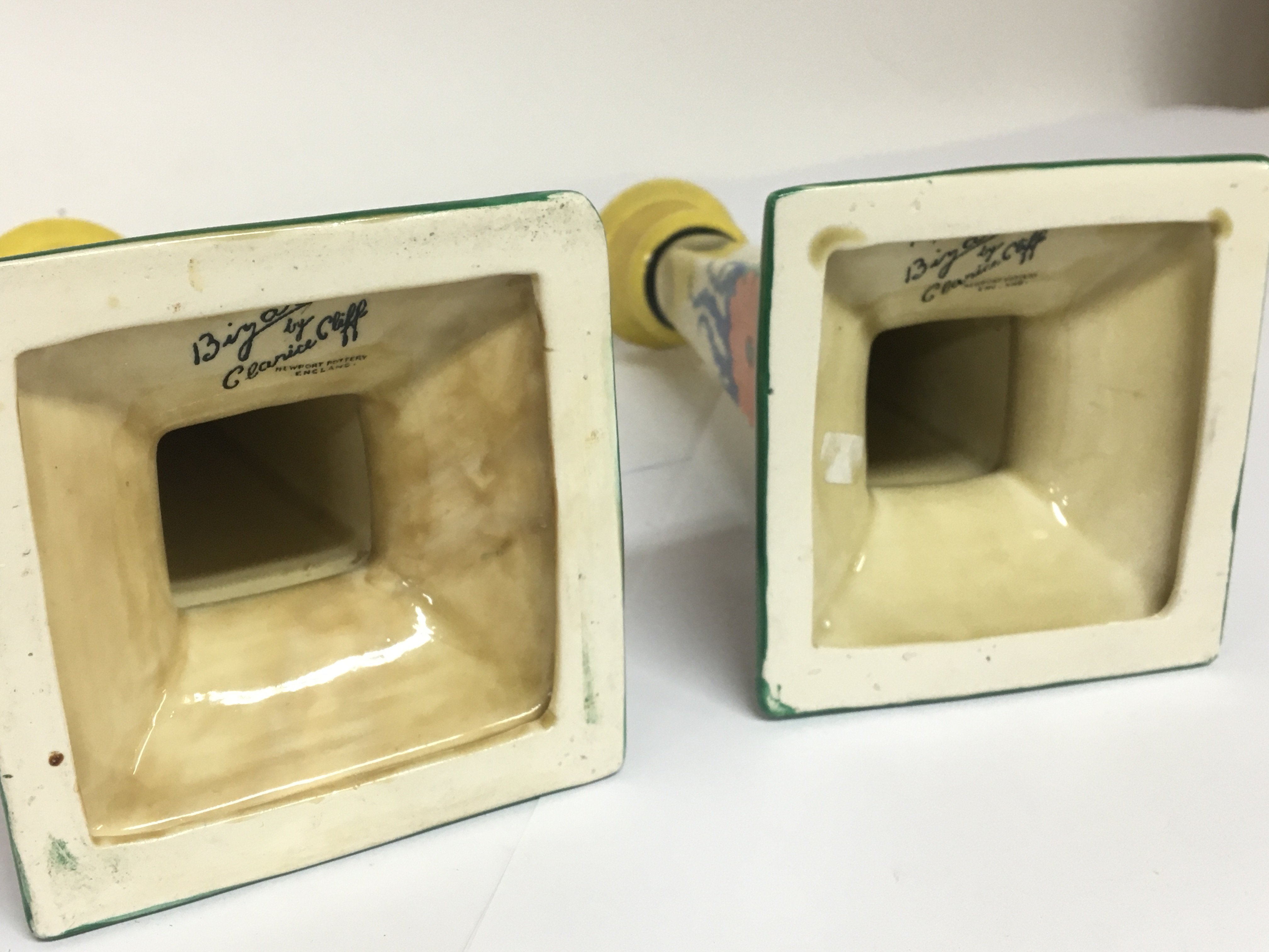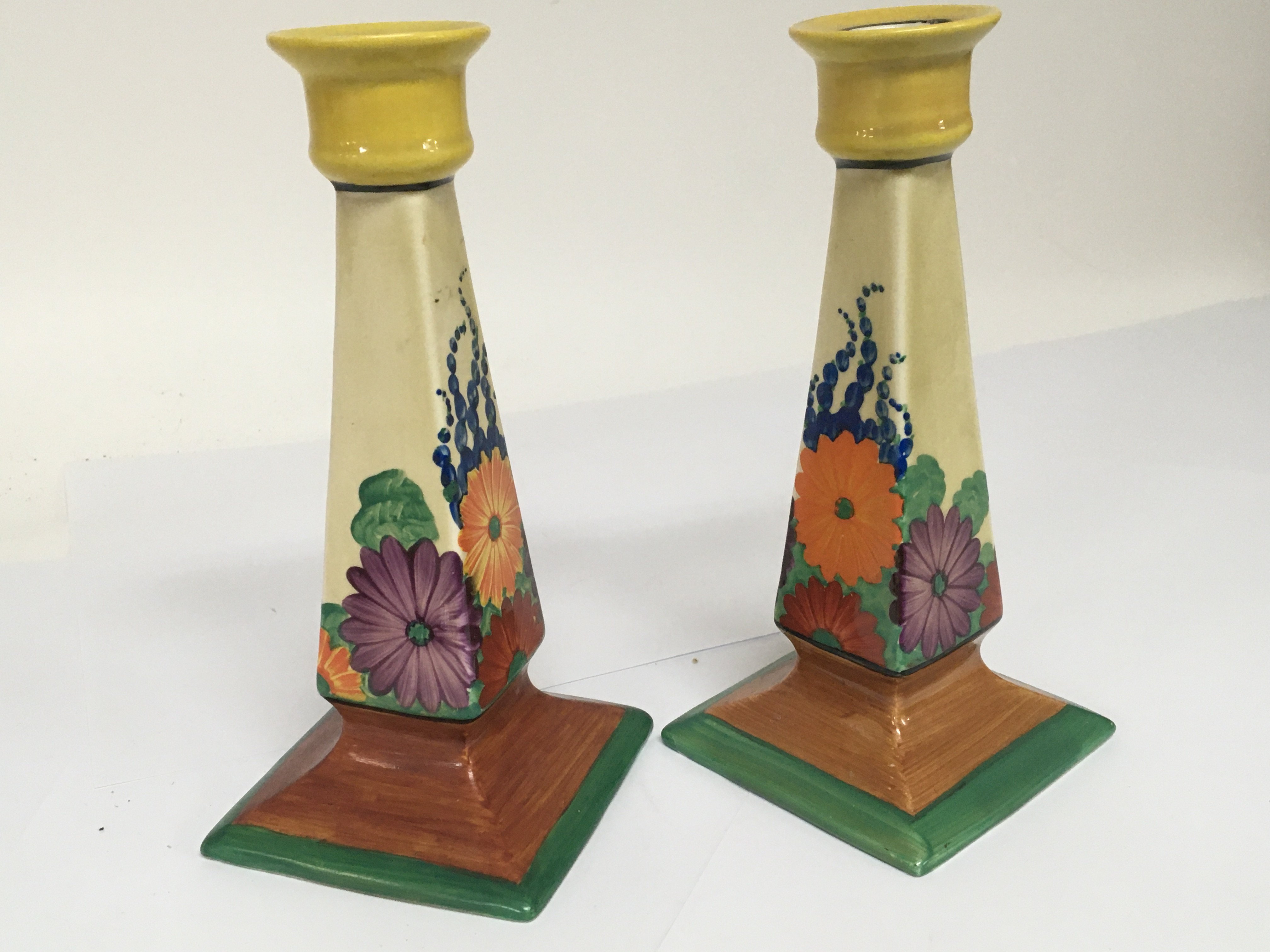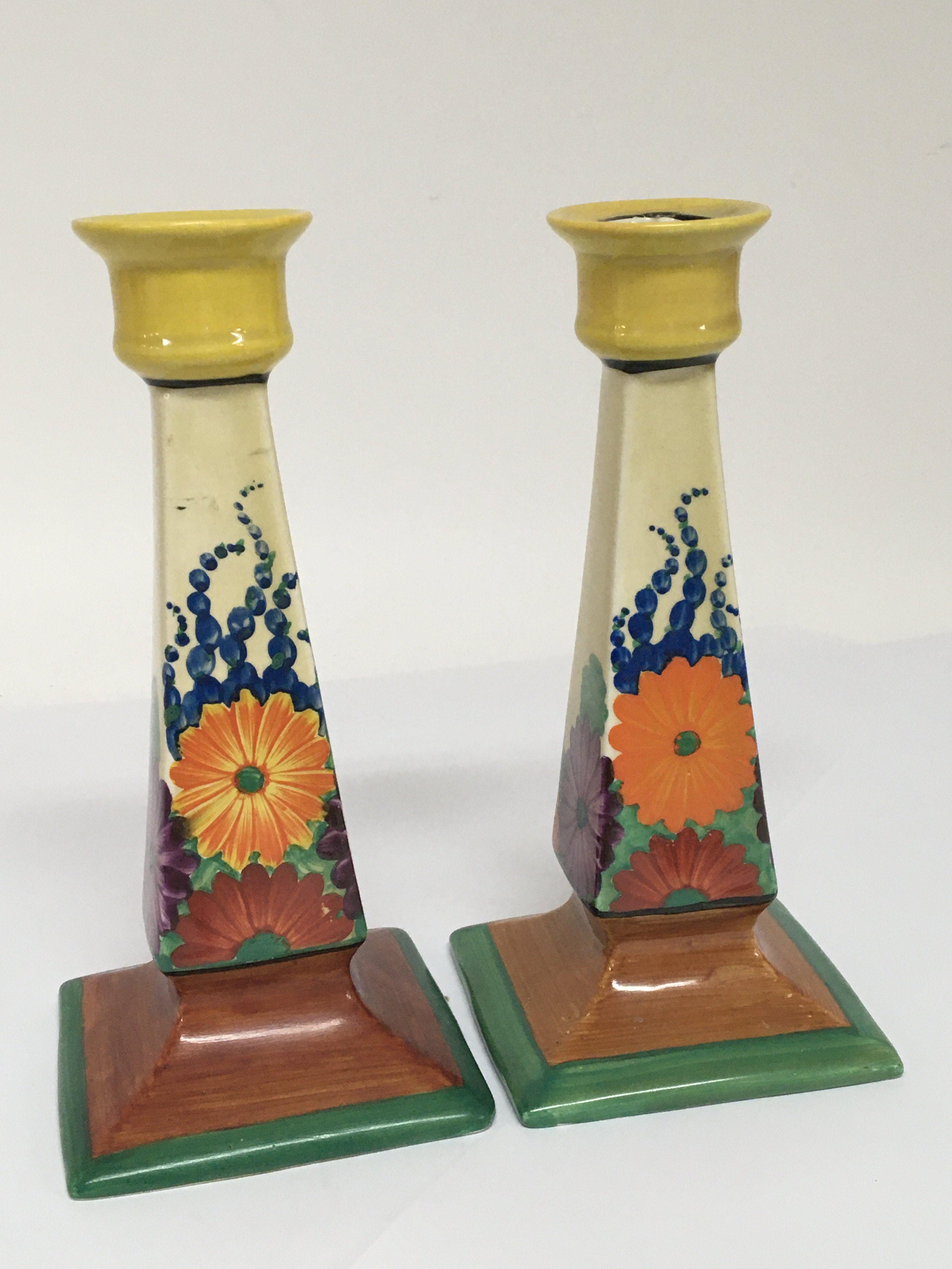 A Quality pair of Clarice Cliff GayDay pattern candle sticks no obvious damage or restoration height 21cm. Slight variation in the colour brown. (2)