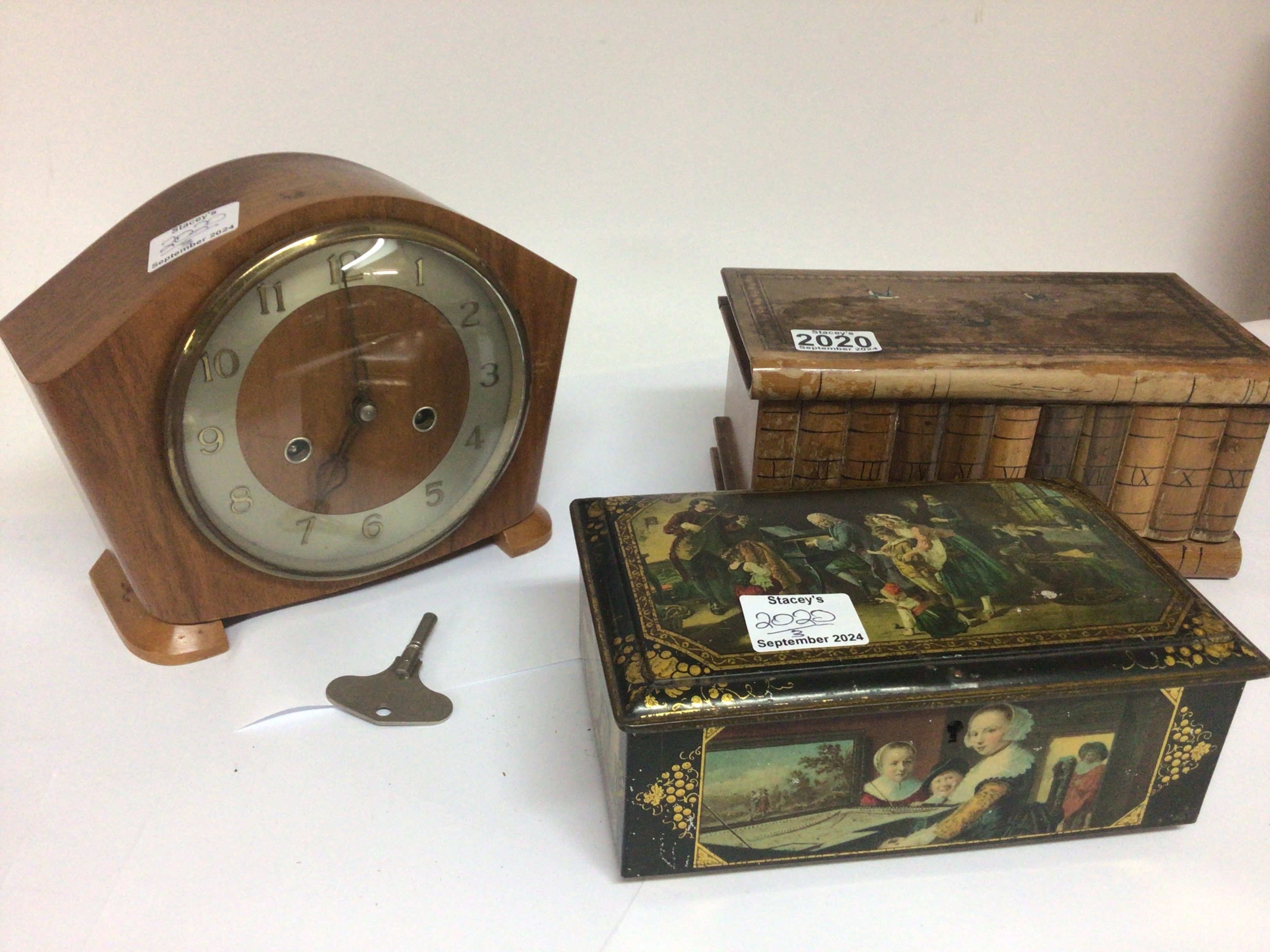 A walnut 1950 s mantel clock an olive wood puzzle box and a Vintage biscuit tin (3)